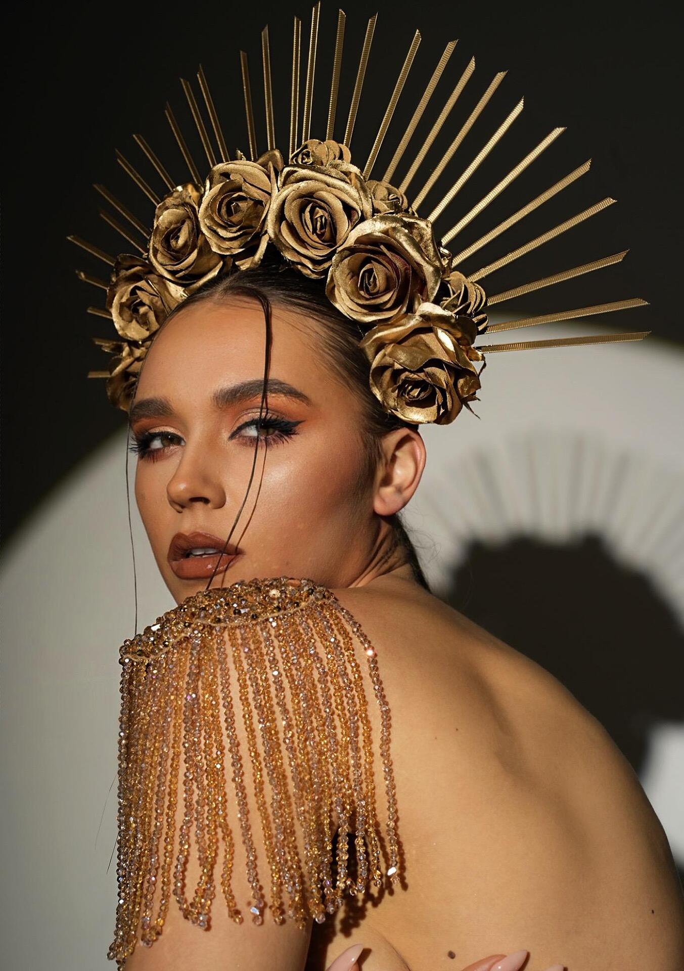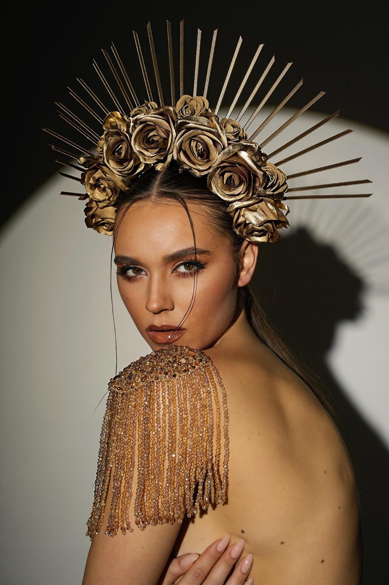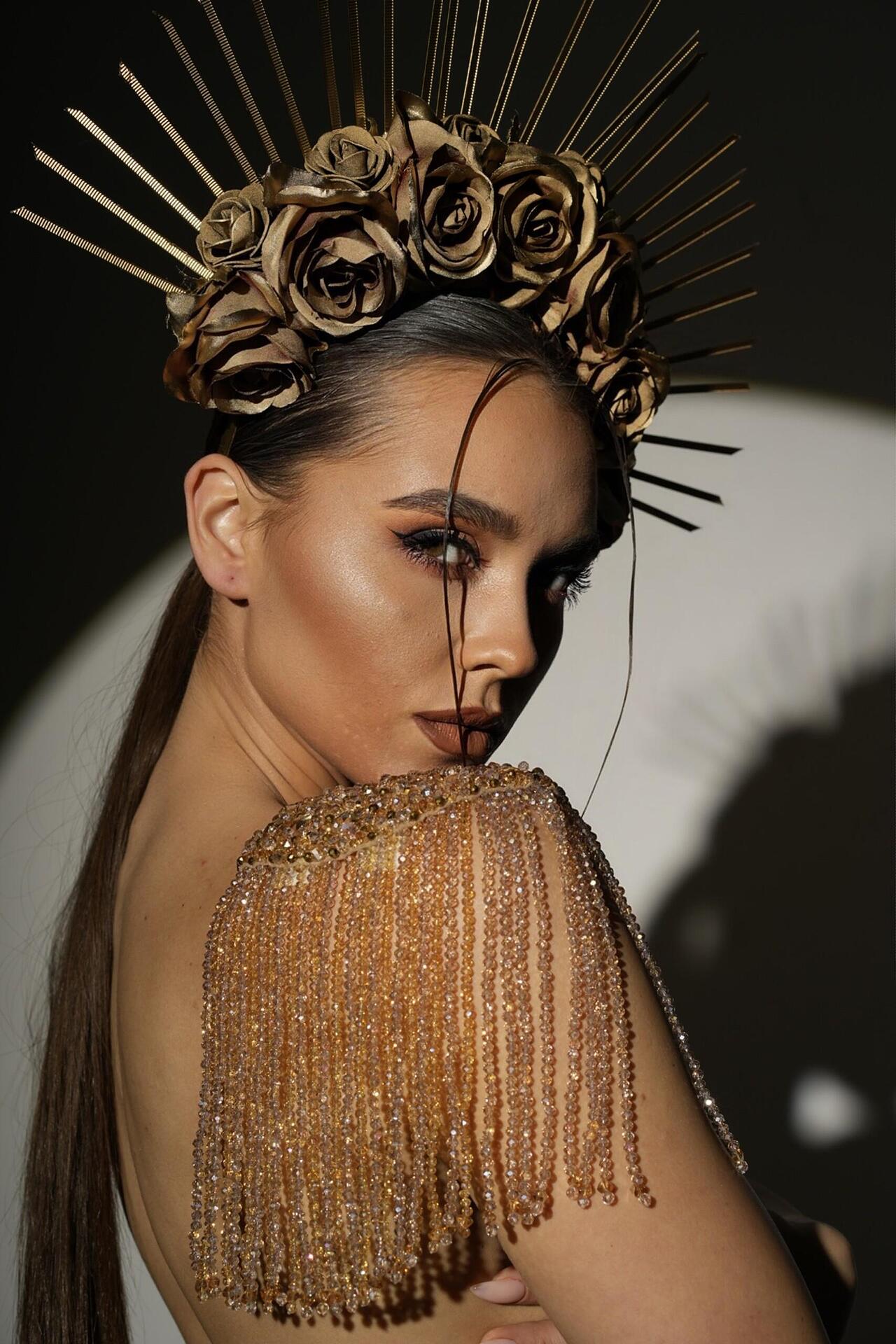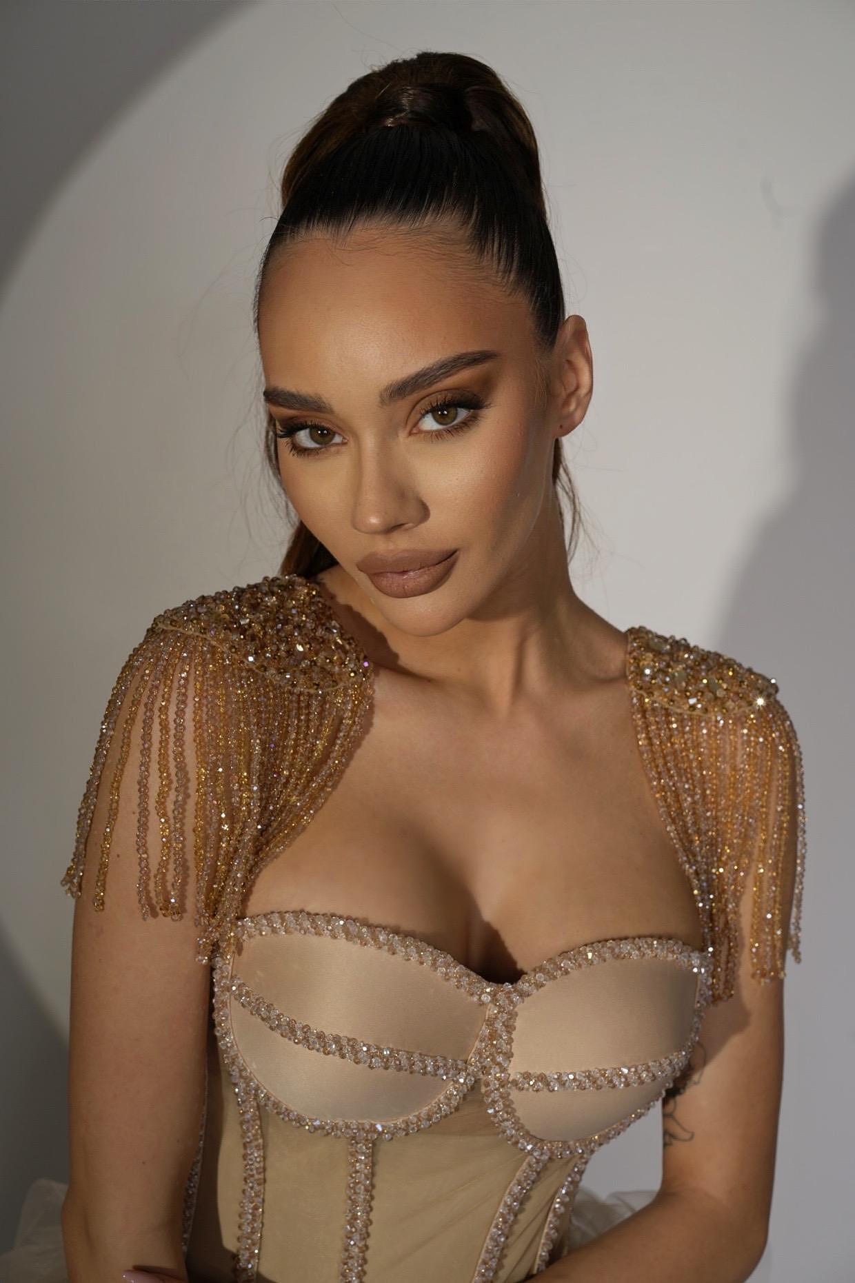Ексклузивен аксесоар за рамене изработен от бежови, златисти кристали и фасетирани стъклени мъниста. Подходящ за много поводи. Изключително елегантен, в долната част може да се захваща към дрехите с пришити към него безопасни игли, ако желаете да го носите на голи рамене се захваща със силиконови ленти.