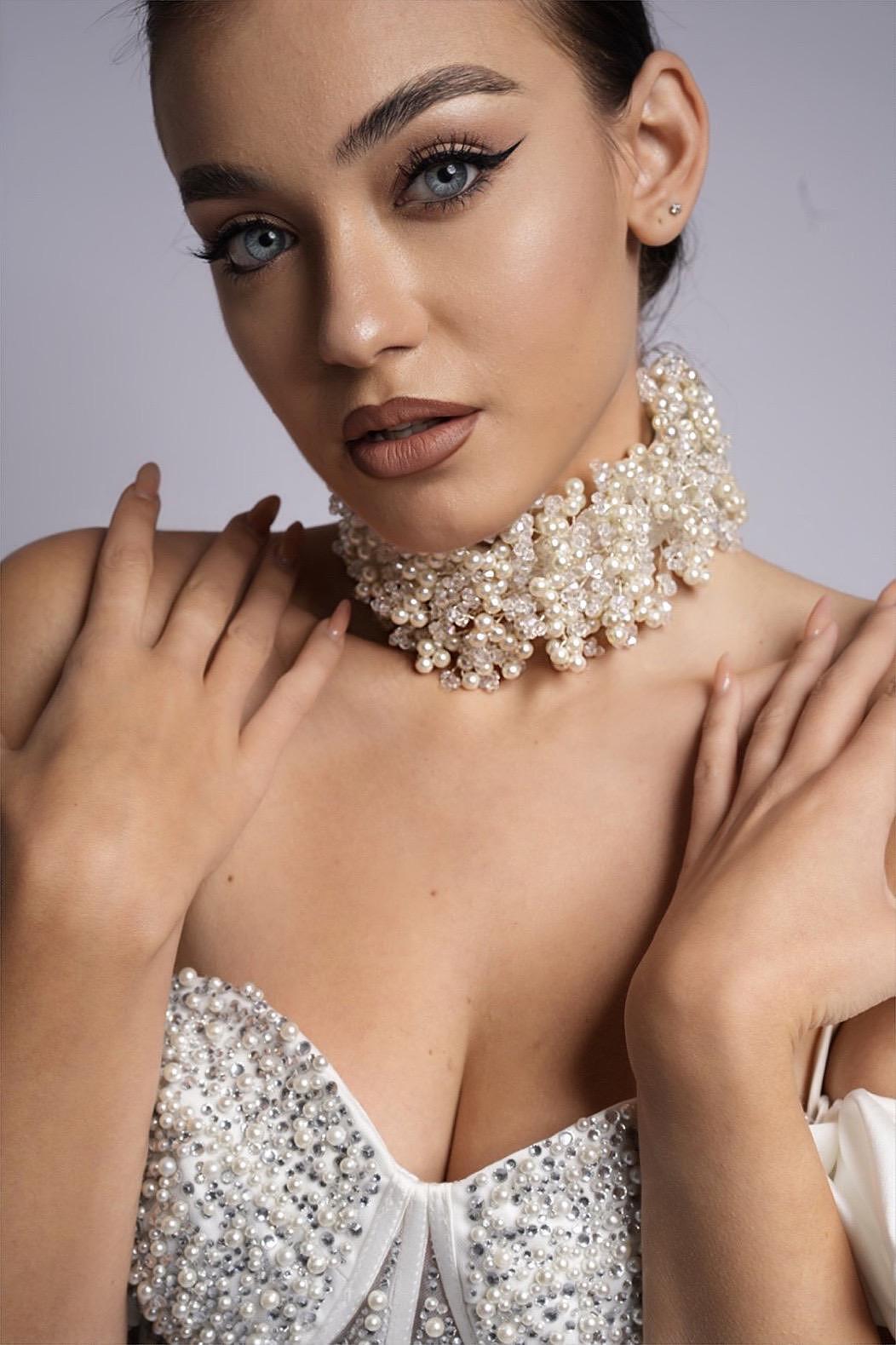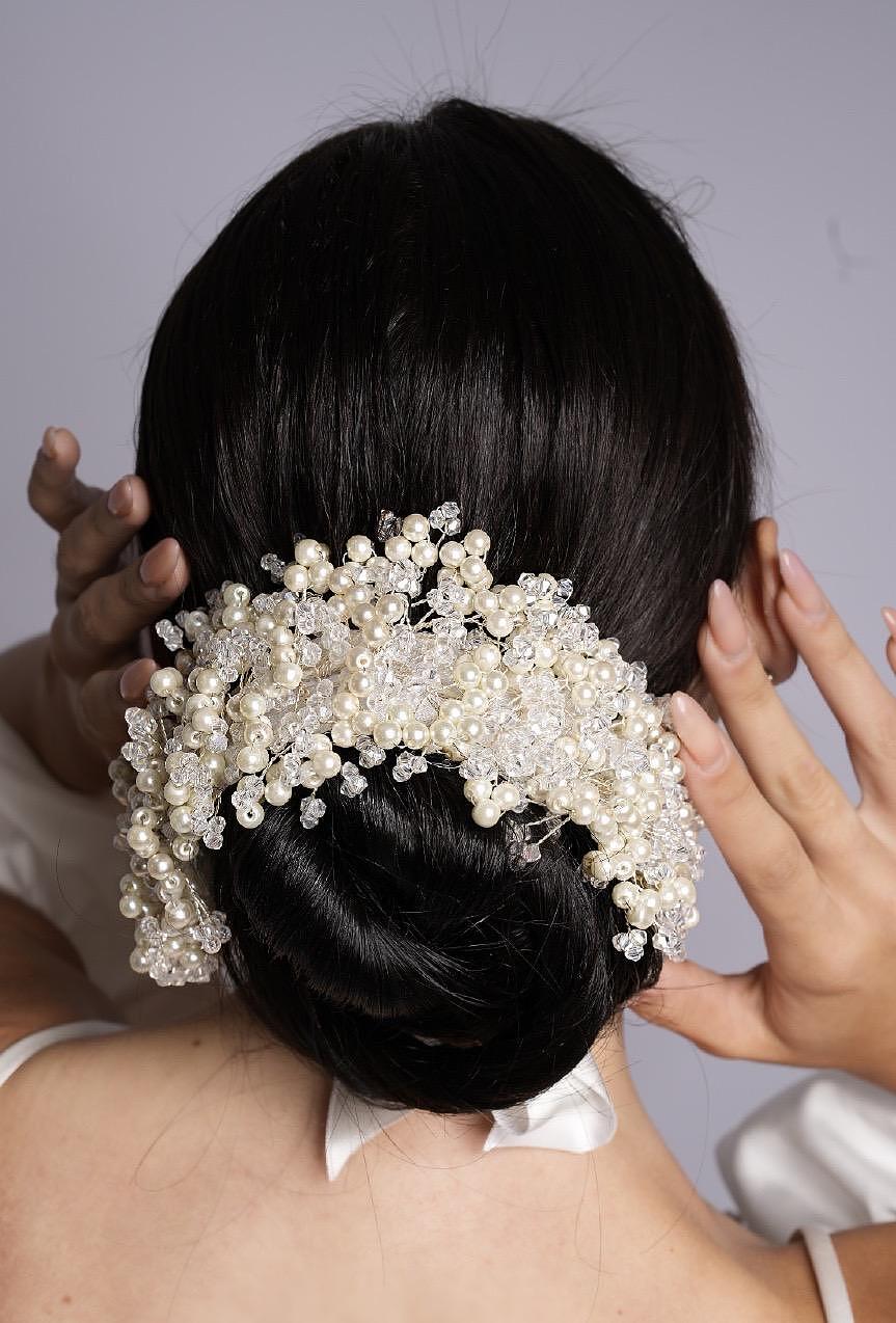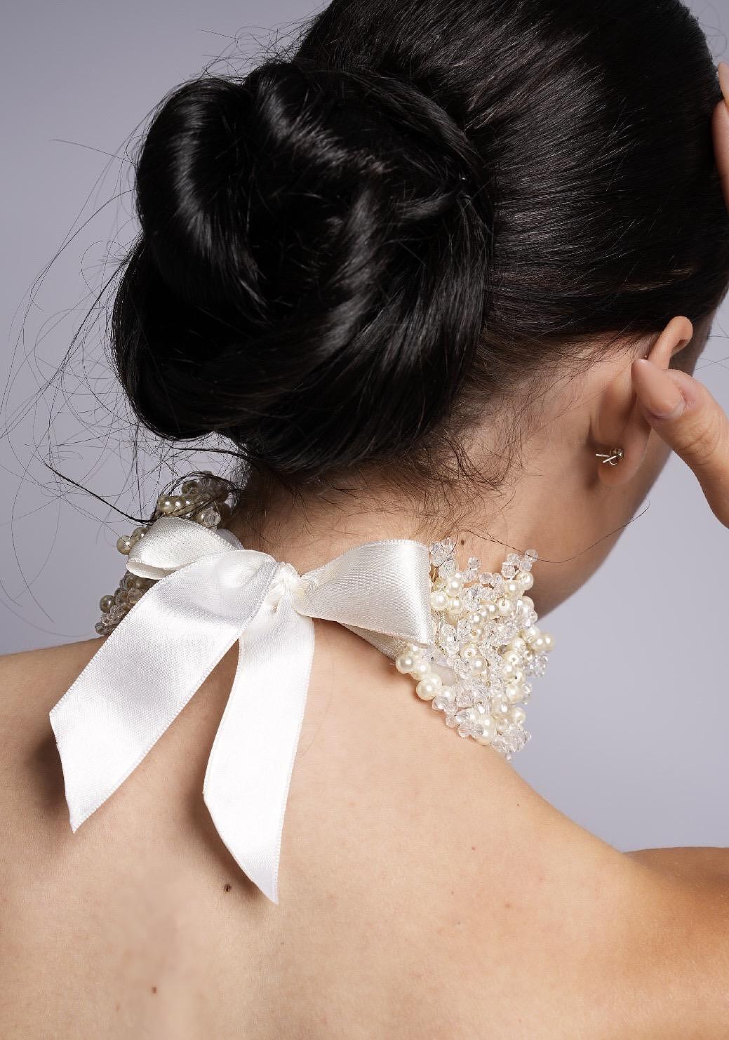 Аксесоар за глава, който може да се използва както като колие, така и към прическата ви. Изработен от нежни бели перли и фасетирани кристални мъниста. Отзад се завързва с панделка и лесно бихте могли да регулирате размера, според необходимоста ви. Аксесоара е подходящ за официални поводи.