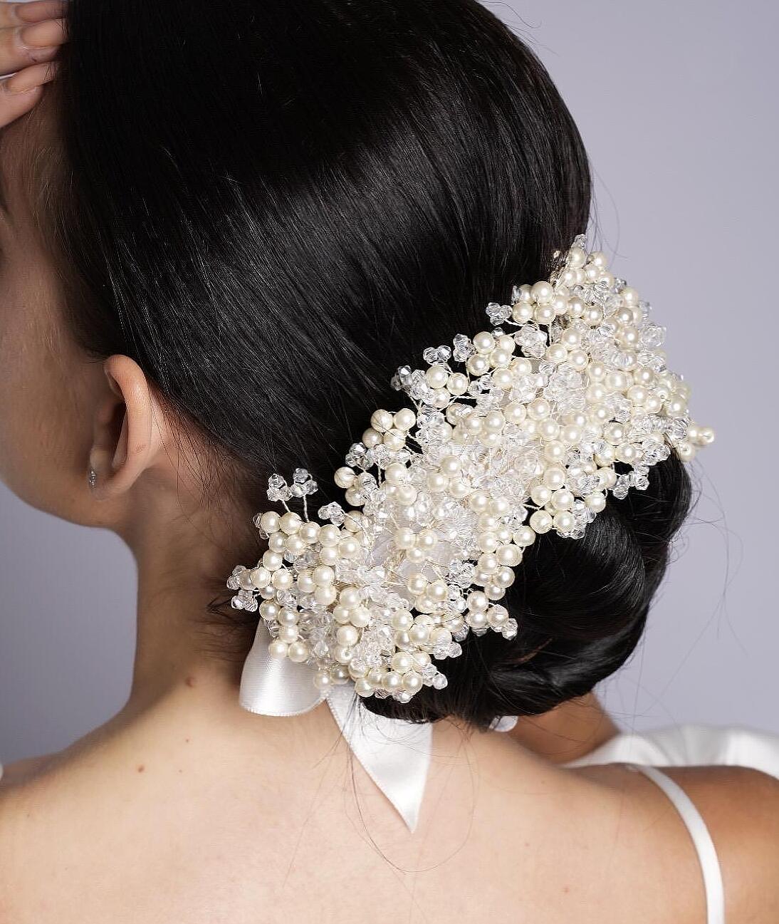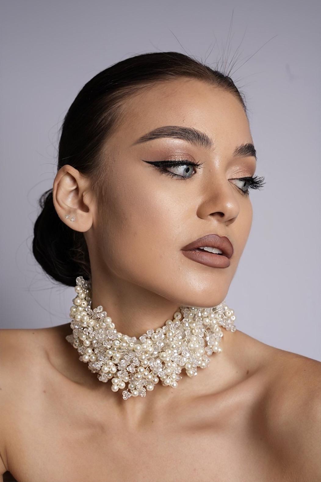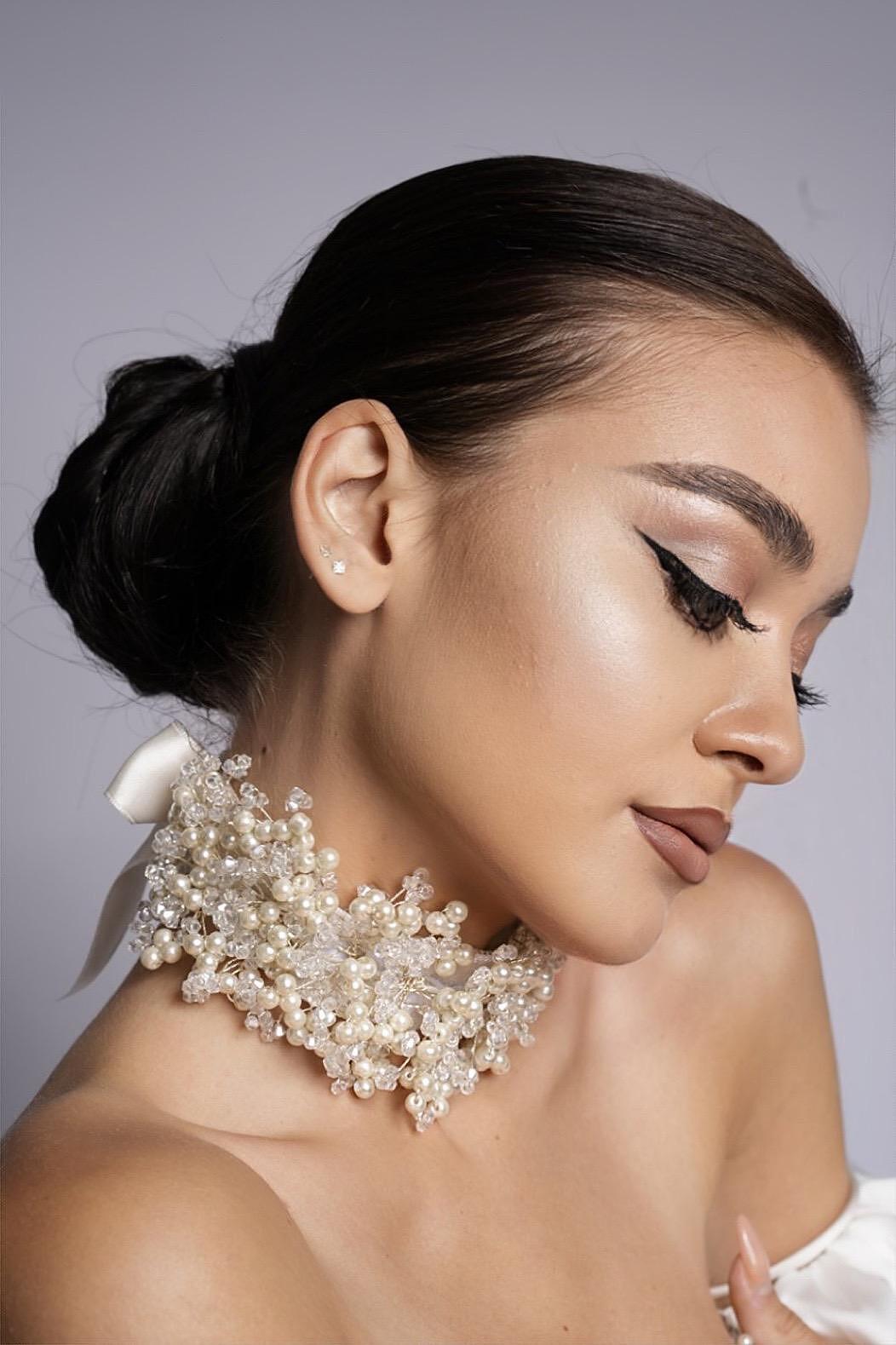 Аксесоар за глава, който може да се използва както като колие, така и към прическата ви. Изработен от нежни бели перли и фасетирани кристални мъниста. Отзад се завързва с панделка и лесно бихте могли да регулирате размера, според необходимоста ви. Аксесоара е подходящ за официални поводи.