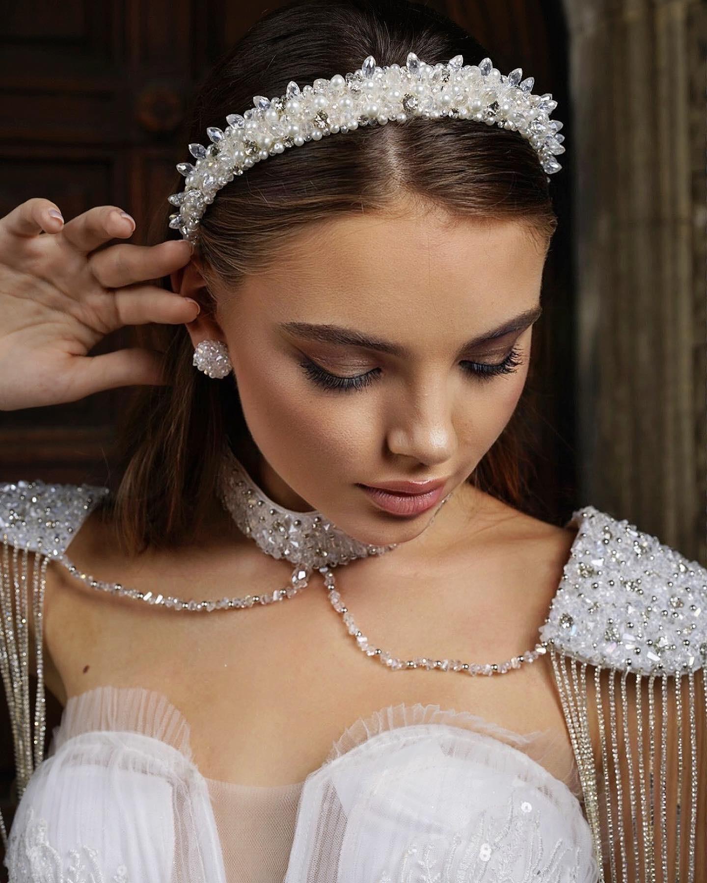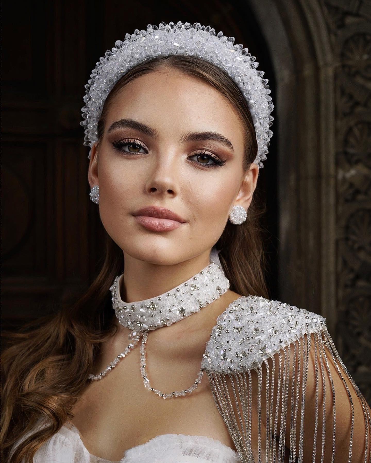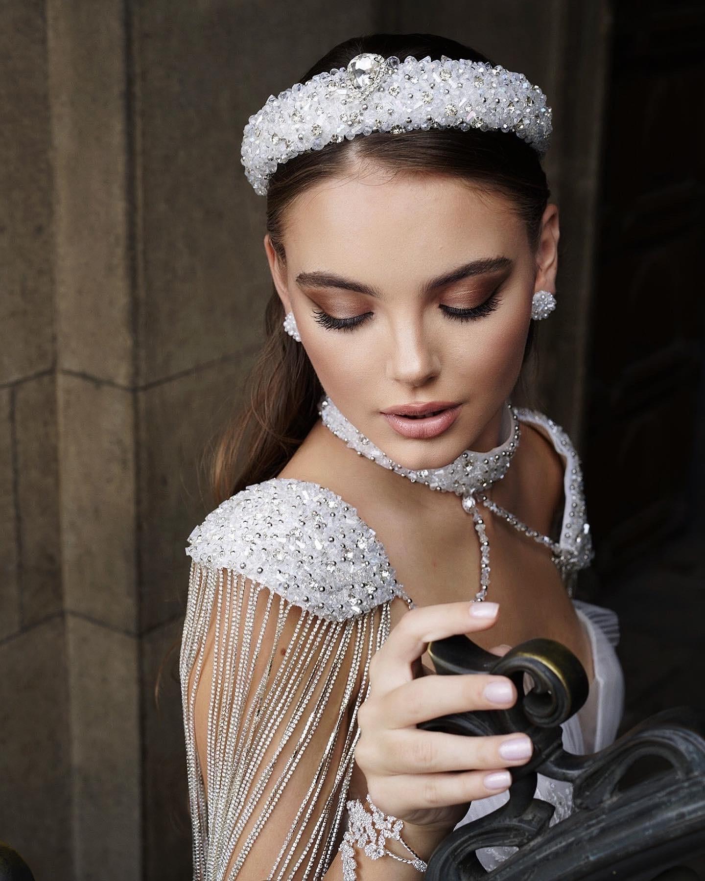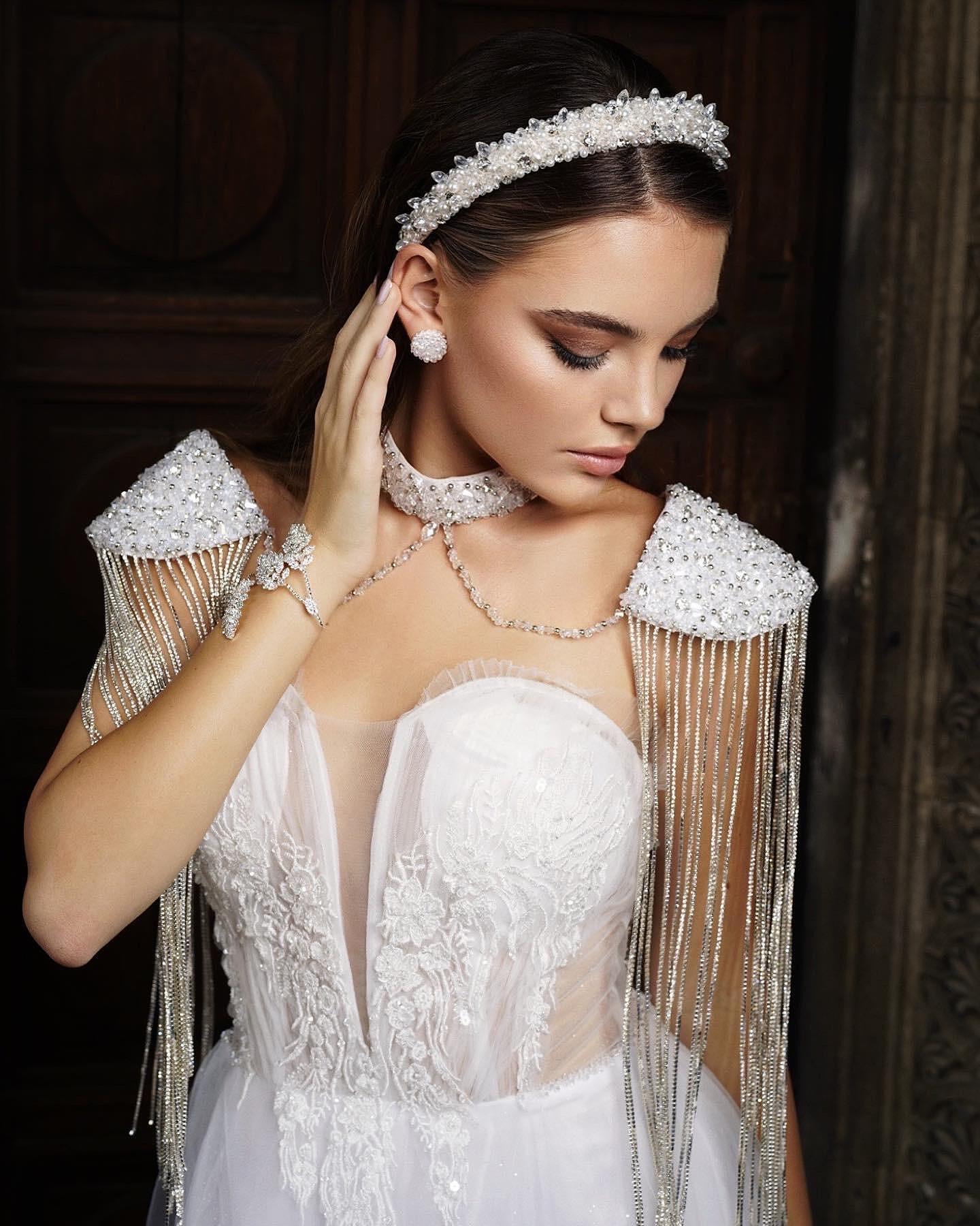 Комплект от чокър и аксесоар за раменете с фасетирани мъниста. Изработени са ръчно от висококачествени материали. Чокъра се закопчава с кукички и размерът му не може да бъде регулиран, а обеците са с винт.