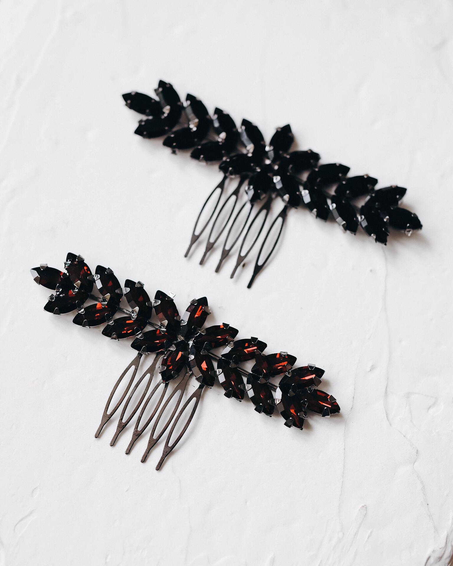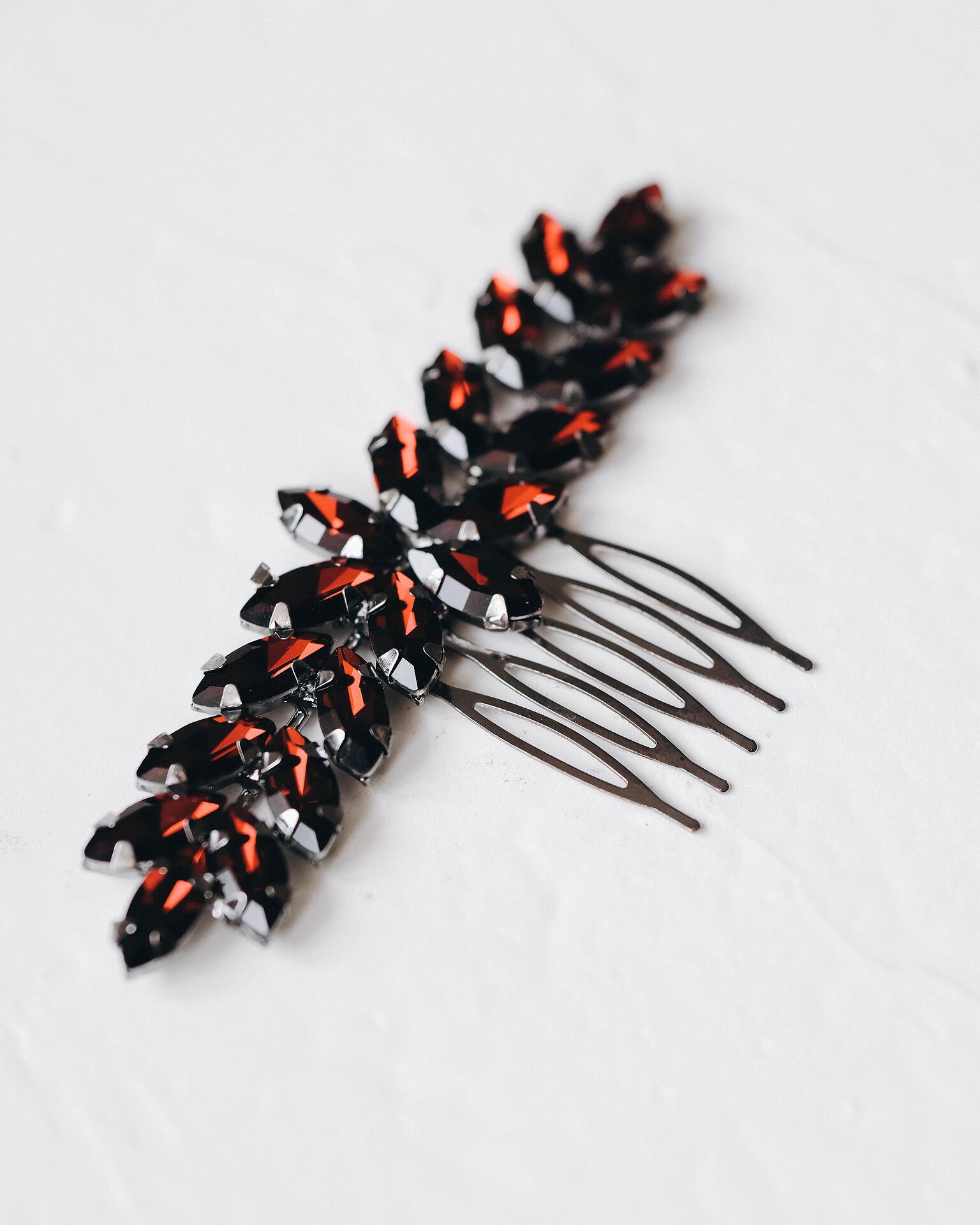 Този драматичен аксесоар за коса е създаден за онези, които търсят силно изразен и елегантен акцент. Богатият тъмночервен цвят на кристалите, съчетан с черната метална основа, придава изтънчена визия. Гребенът осигурява стабилно закрепване, което го прави подходящ за вечерни събития, официални поводи.