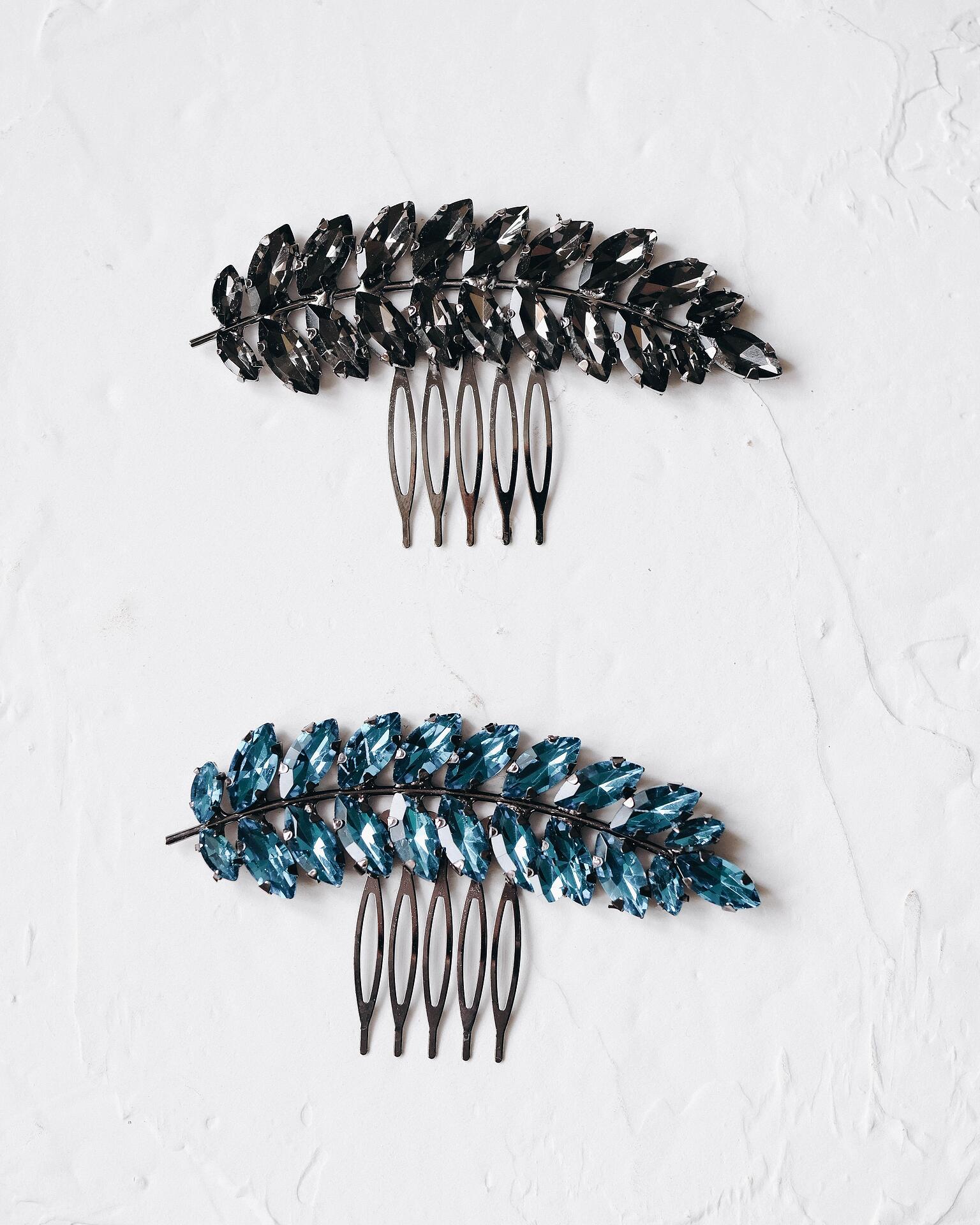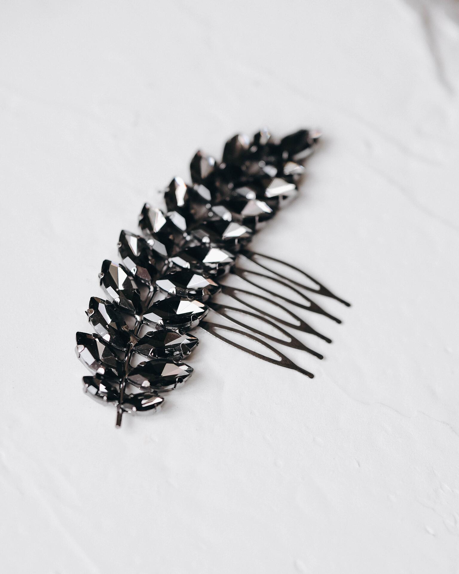 Този елегантен аксесоар за коса е изработен с внимание към всеки детайл. Дизайнът му наподобява деликатно оформени листа, инкрустирани с черни кристали, които придават стил и изисканост. Гребенът осигурява стабилно прикрепване, което го прави подходящ за официални прически и специални поводи.