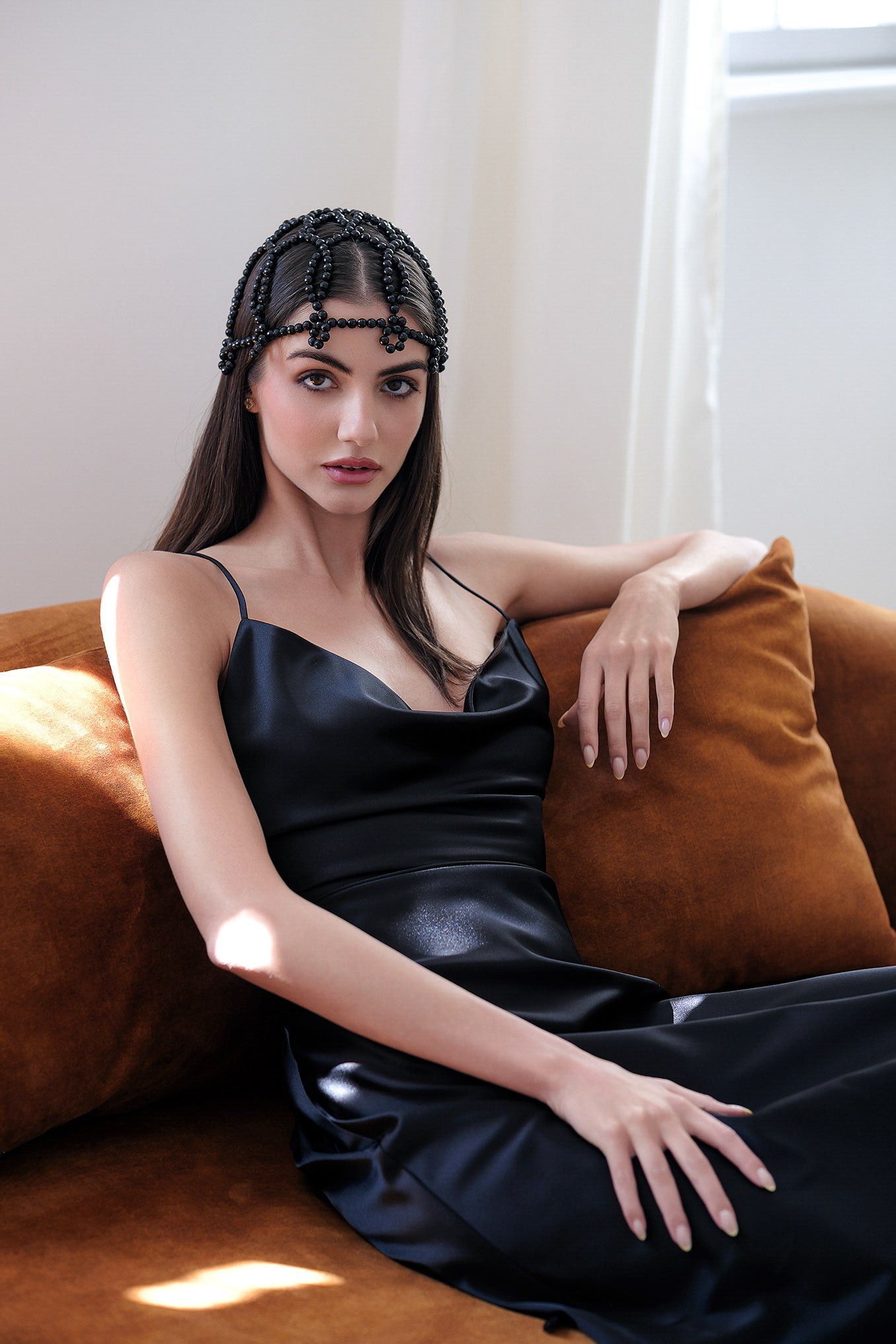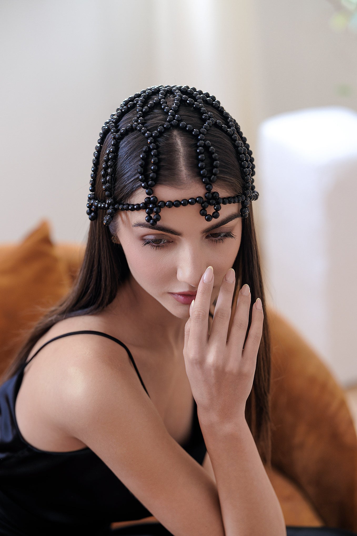 Потопете се в елегантността с нашият ръчно изработен аксесоар от перли. Има обемен дизайн и прецизна плетка, носи са като шапка и обгръща главата по уникален начин. Перлите са нанизани върху прозрачна, еластична основа, която осигурява стабилност, без да създава усещане за стягане. Моделът е лимитиран и се предлага в един универсален размер.