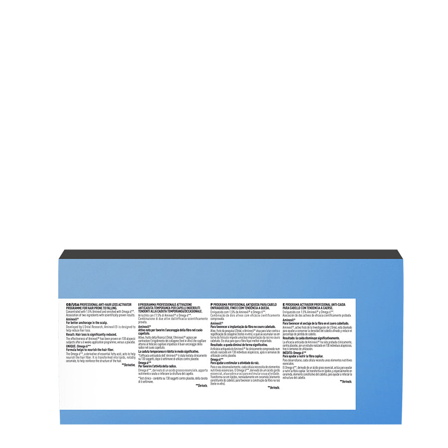 Ампули против косопад, обогатени с 1,5 % аминексил, предназначени за изтъняваща коса. Ампули против косопад, обогатени с 1,5 % аминексил и омега 6, които помагат за намаляването на косопада и осигуряват богати подхранващи вещества за защита на плътността на косата от корена до върха. При регулярна употреба осигуряват по-плътна коса само за 6 седмици* и 87% по-силна коса**. *Клинично проучване със 130 субекта, в продължение на 6 седмици. **Инструментален тест след 1 приложение на тестваните продукти в сравнение с класическия шампоан. Нанесете една ампула равномерно върху скалпа. Масажирайте с пръсти. Оставете да подейства. Не изплаквайте. Професионален съвет: за оптимален ефект, нанасяйте вечер като част от рутината ви за грижа за косата против косопад. AQUA / WATER / EAU • ALCOHOL DENAT. • DIAMINOPYRIMIDINE OXIDE • AMINOMETHYL PROPANOL • PEG-40 HYDROGENATED CASTOR OIL • CALCIUM PANTOTHENATE • SAFFLOWER GLUCOSIDE • PYRIDOXINE HCl • NIACINAMIDE • TOCOPHEROL • SODIUM CITRATE • PARFUM / FRAGRANCE (F.I.L. C271714/1). Косопадът е намален, а косата е по-плътна*. Резултати след 6 седмици*. *Клинично проучване със 130 субекта, в продължение на 6 седмици. 10х6 мл