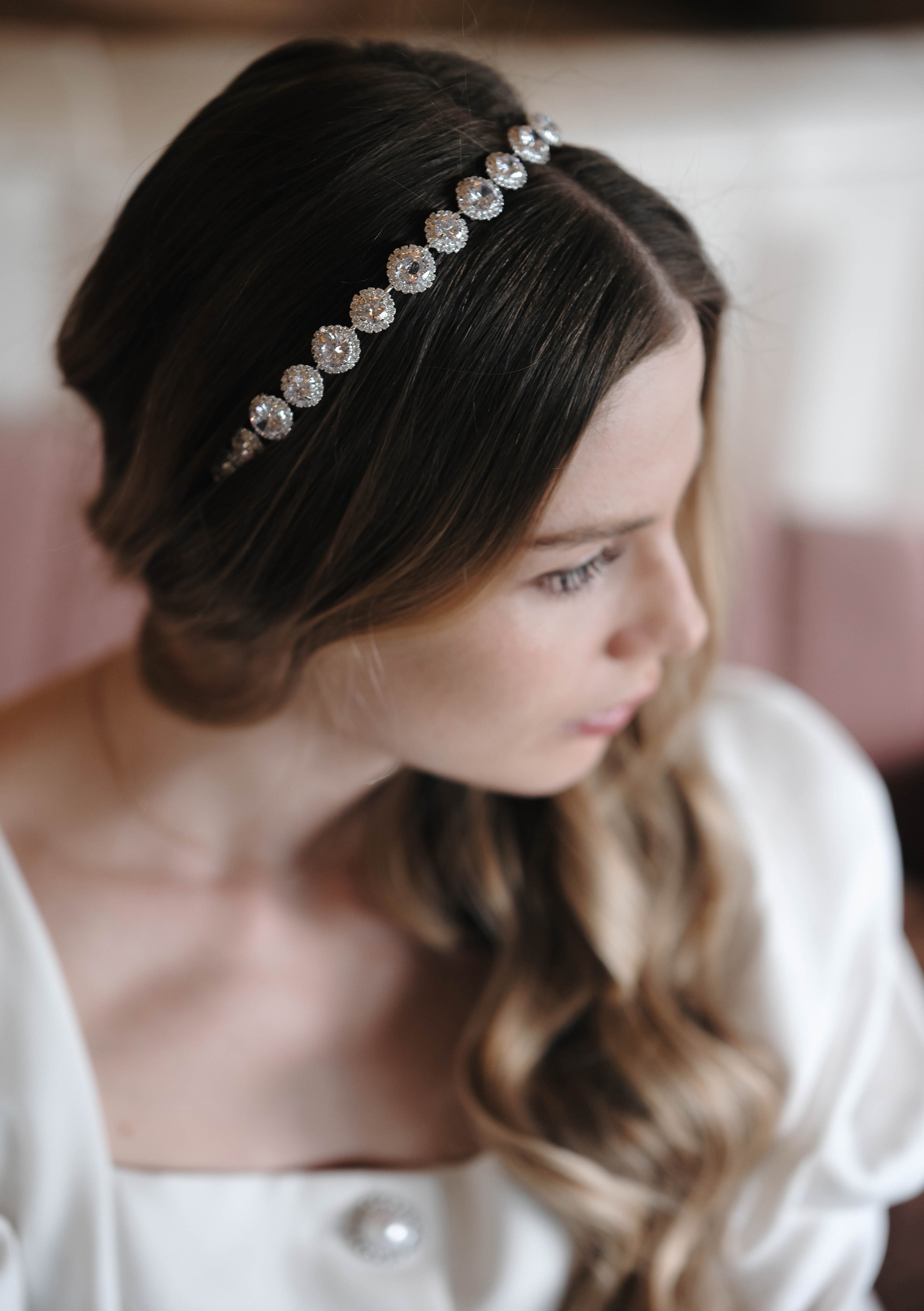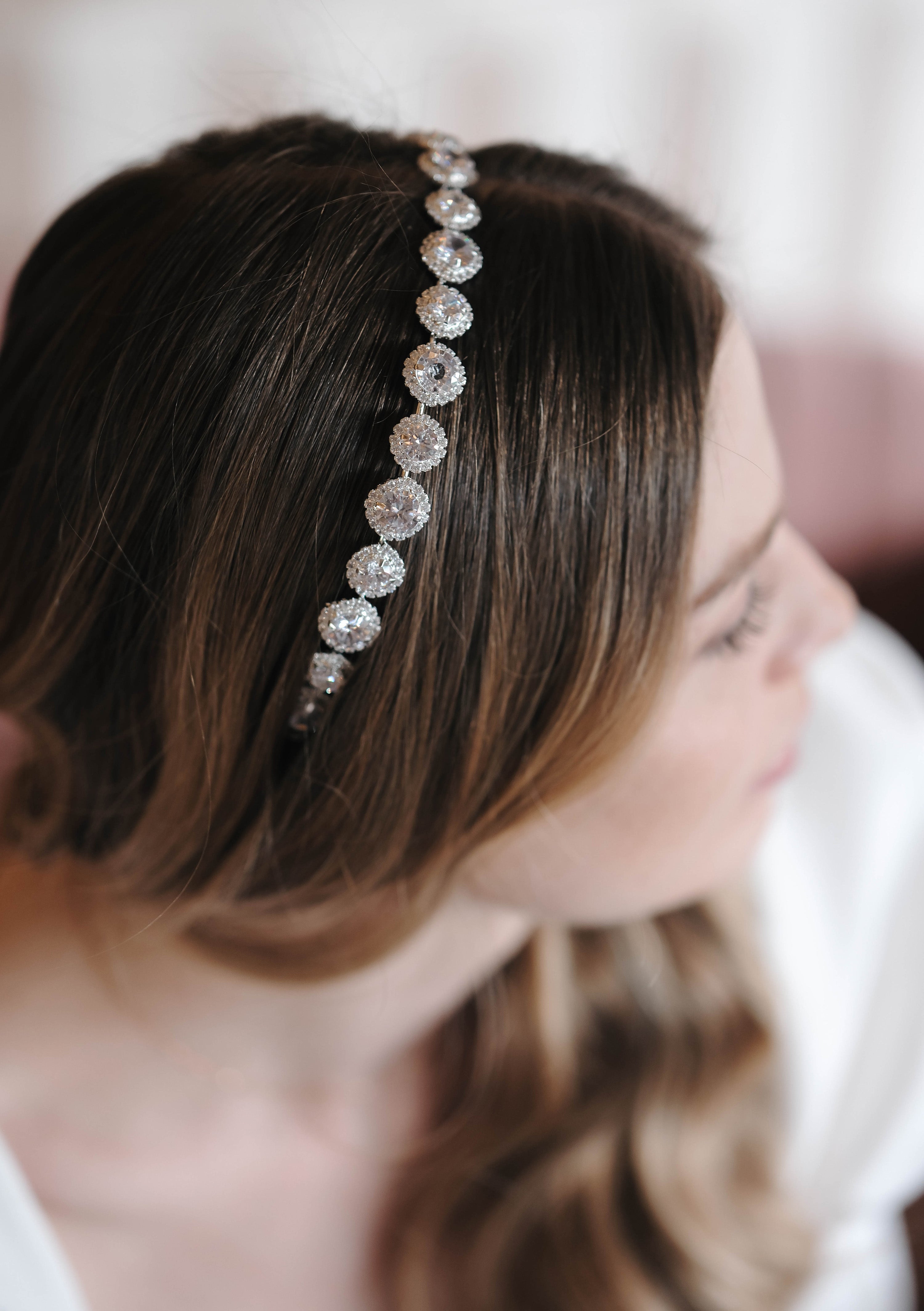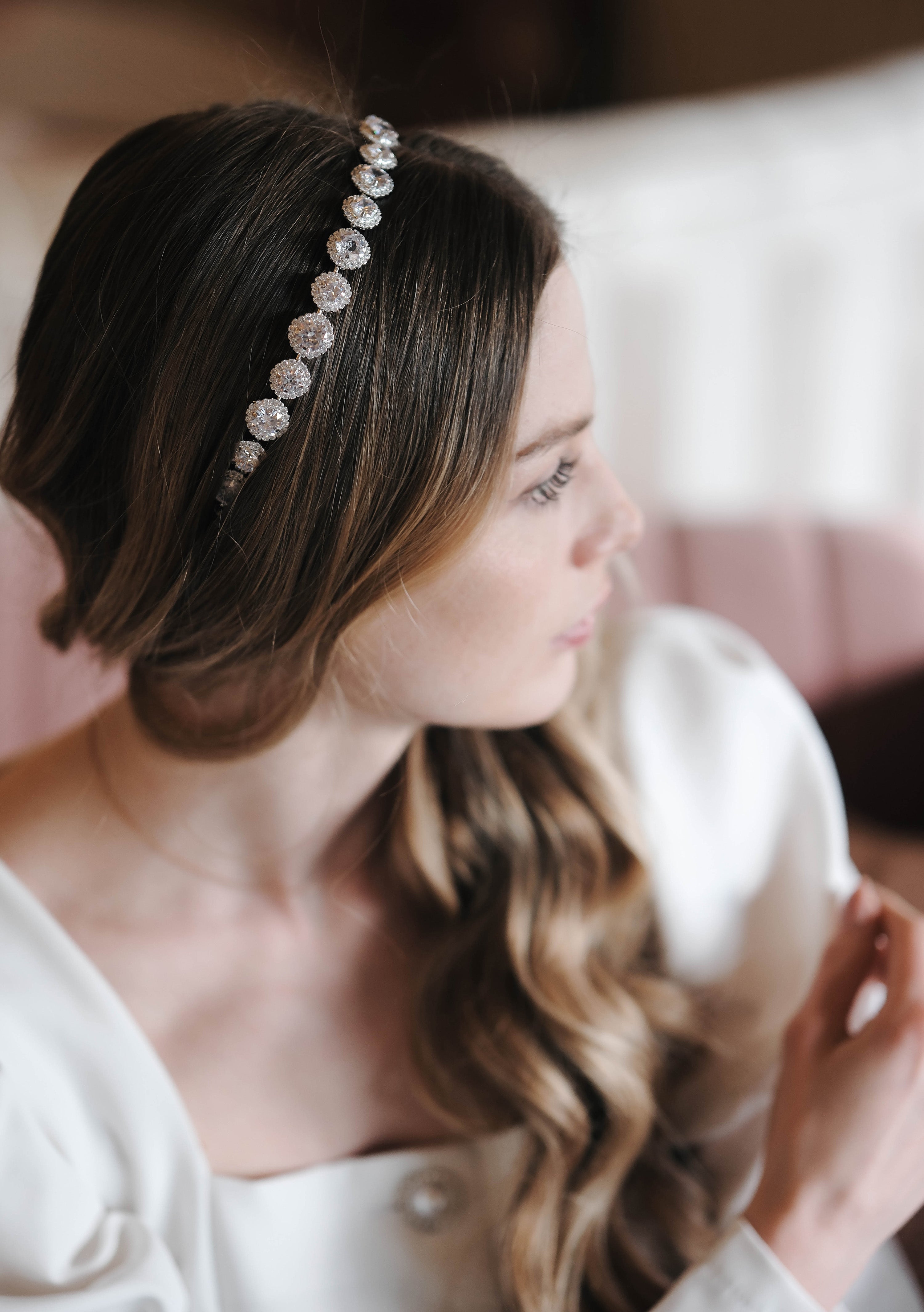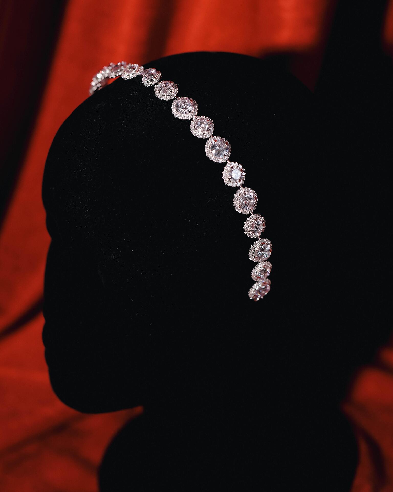 Тази изискана диадема е създадена за специални поводи. Дизайнът включва редица ръчно подредени кристали, които придават изключителен блясък и елегантност. Може да бъде носена като основен акцент във вашата визия или в комбинация с воал. Перфектният избор за булки, официални събития и фотосесии.