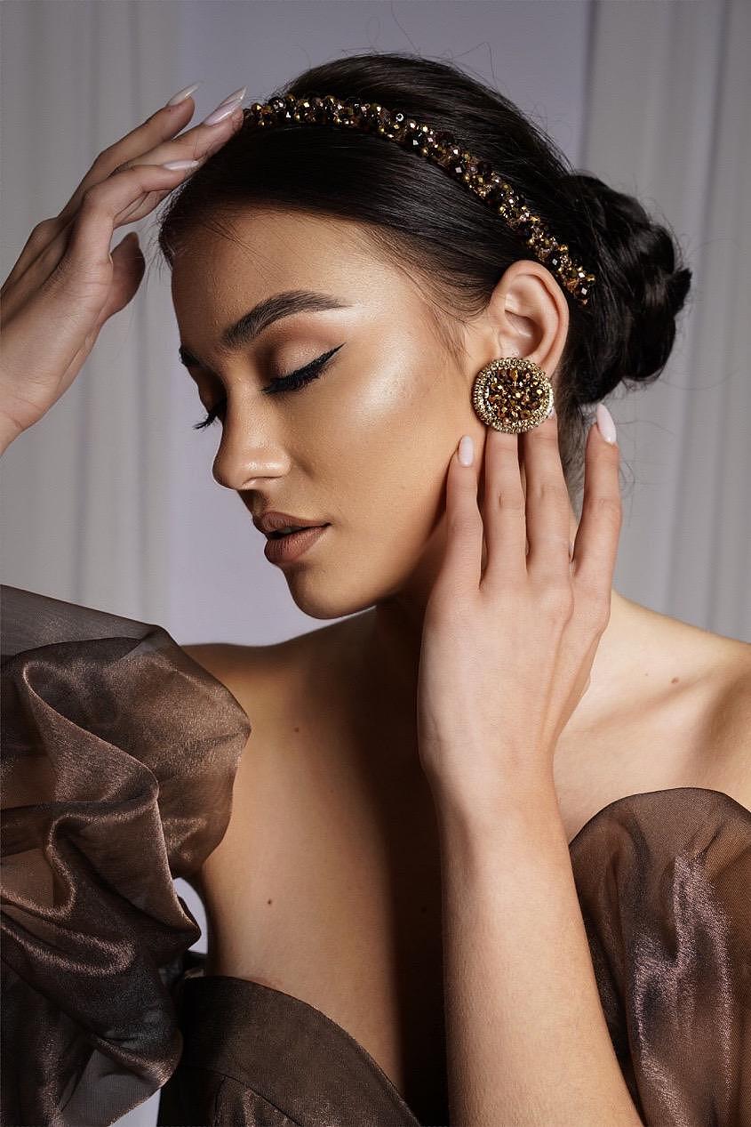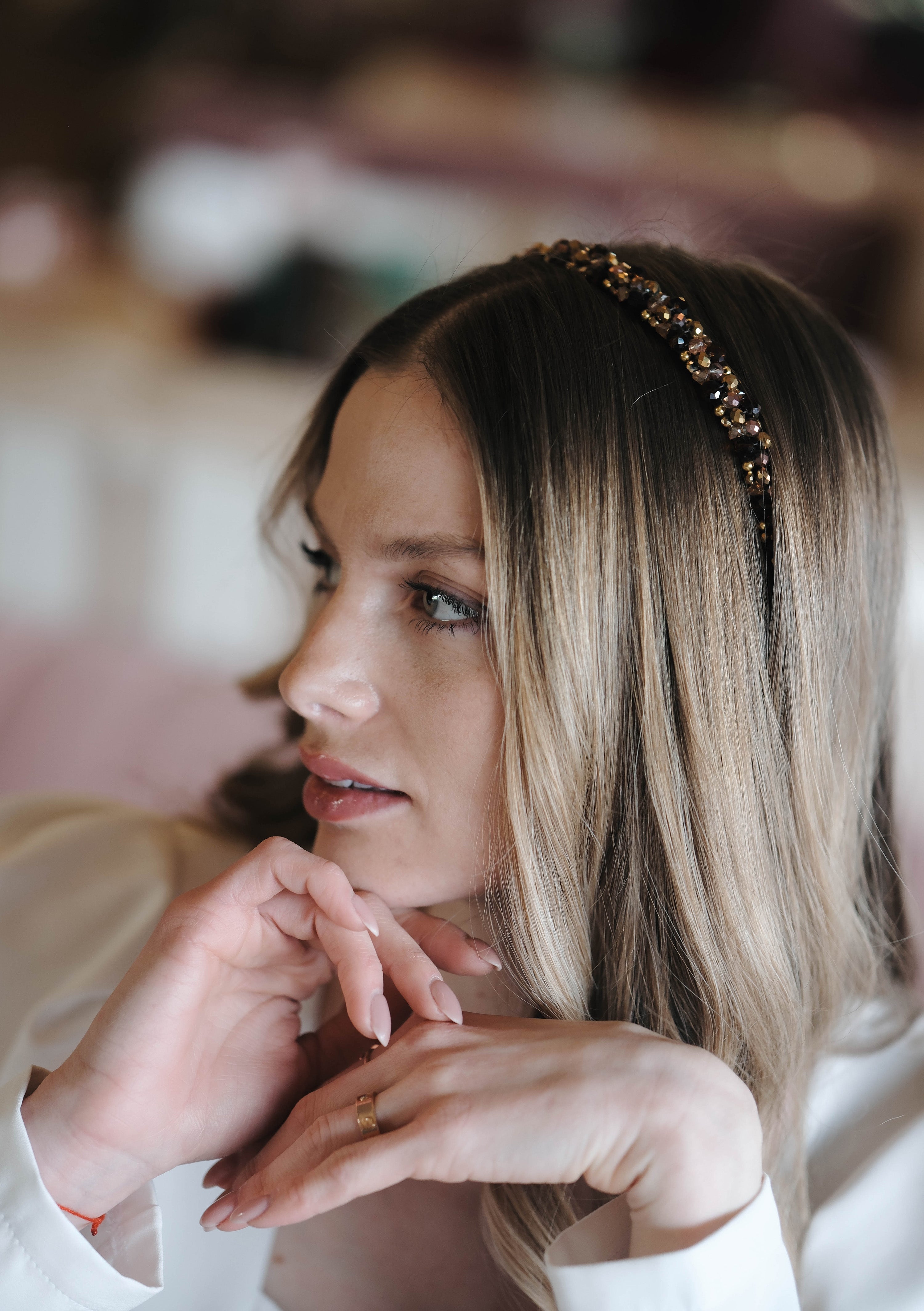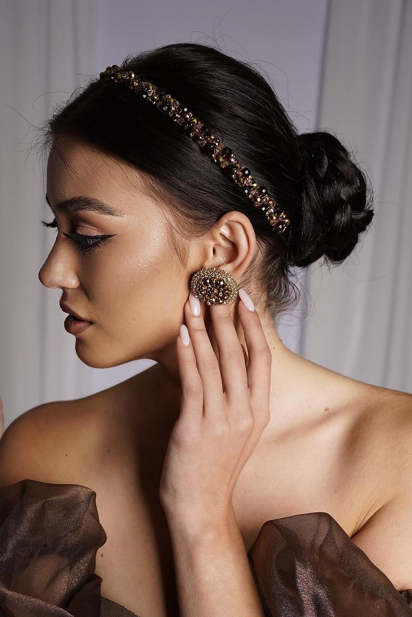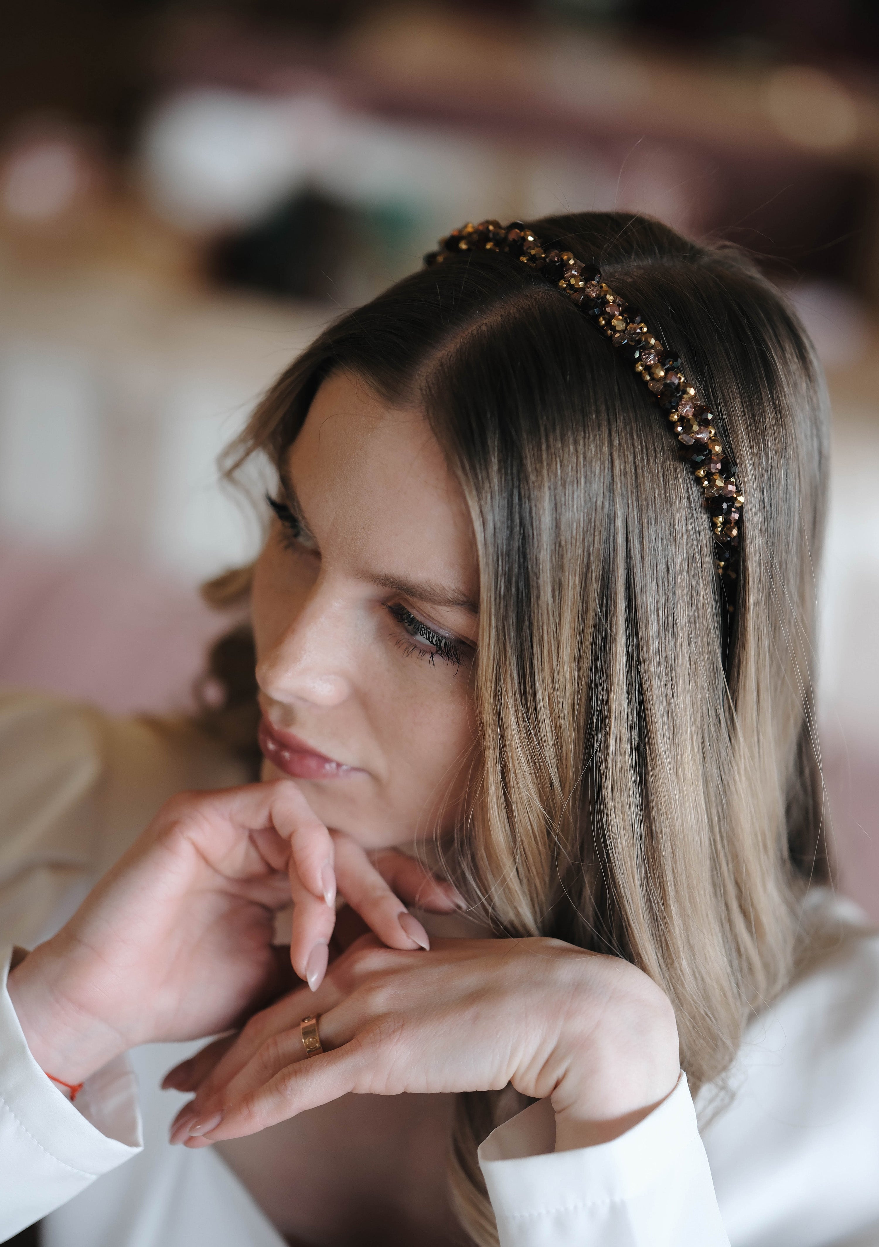 Диадема нашита цялата с кристали и мъниста. Нежна и лека. Използвана е твърда корда, която държи здраво и стегнато кристалите по основата на диадемата. Ръчно изработена от висококачествени материали. Размерът може да се регулира, за да бъде удобна на всеки. Широка около 2 см.