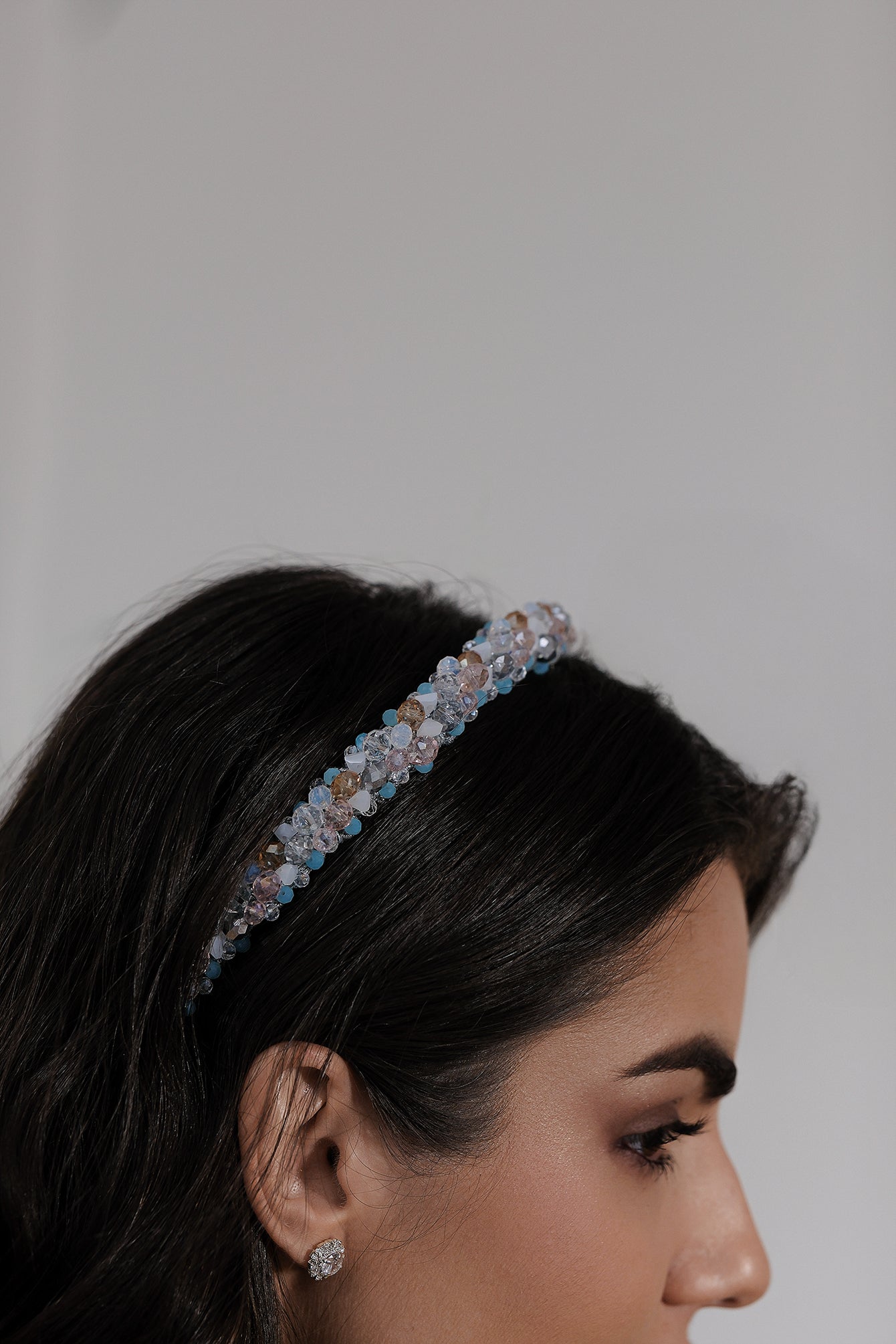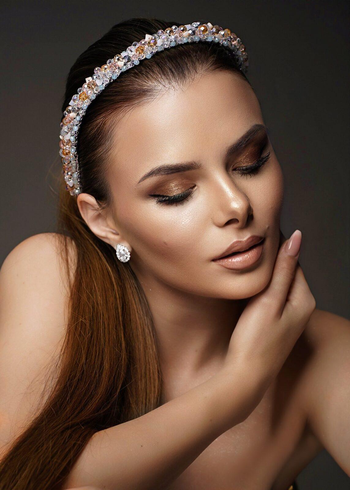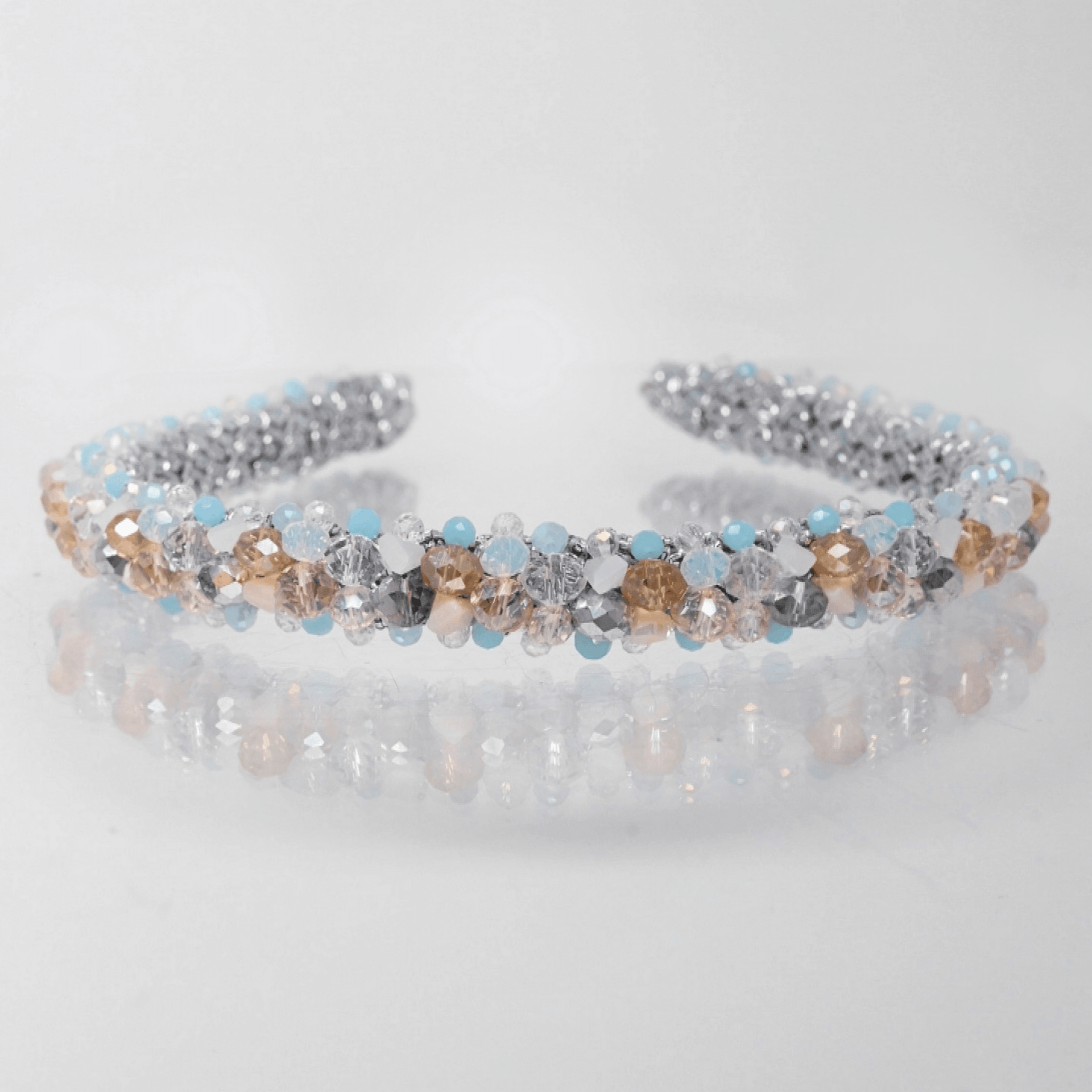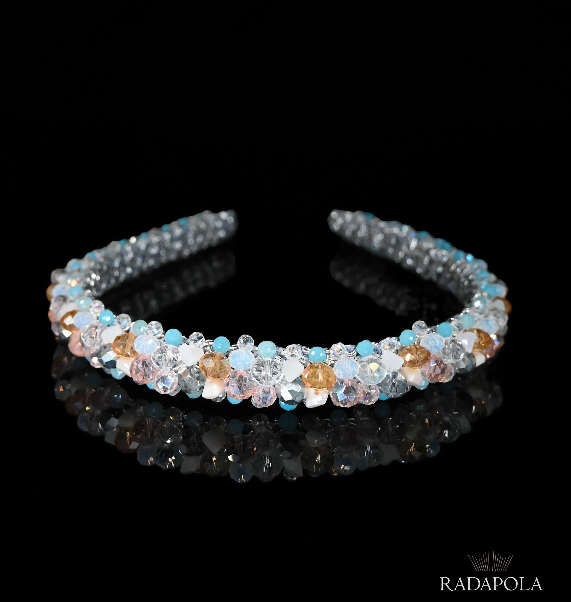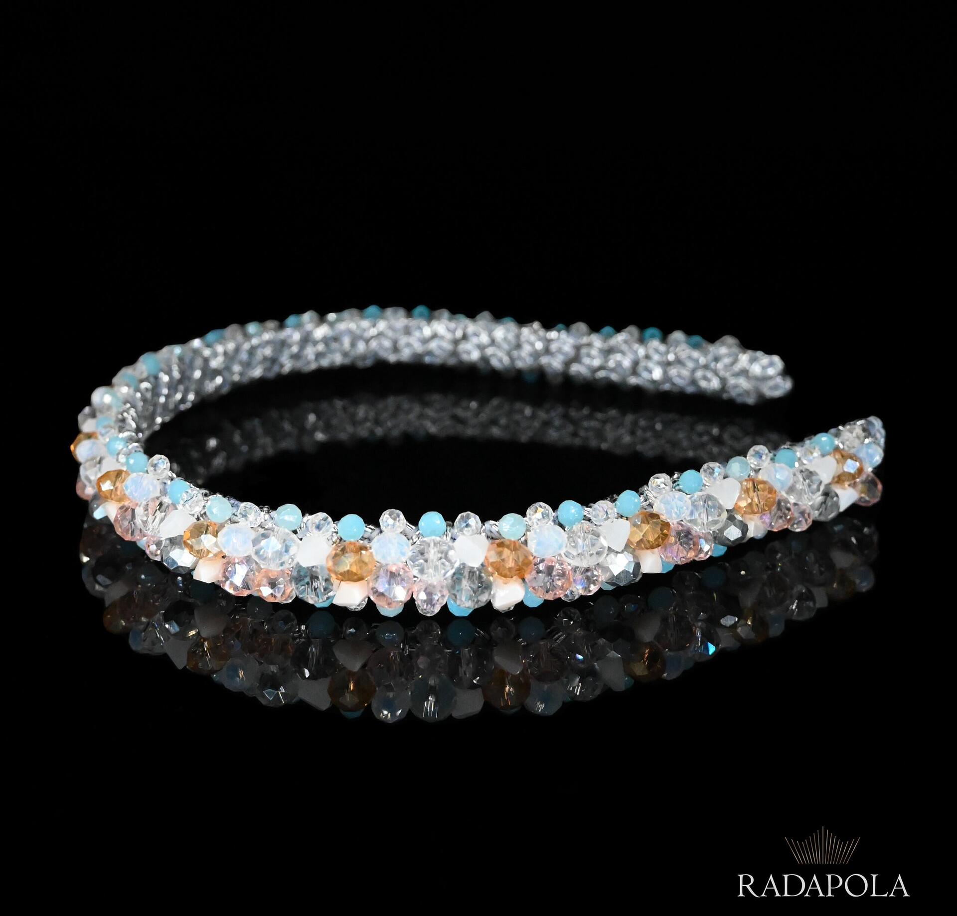 Нежна диадема, нашита с мъниста и кристали, широка около 2 см. Подходяща за всякакви поводи и е подходяща и за малки момиченца. Ръчно изработена от висококачествени материали. Размерът може да бъде регулиран спрямо вашата глава, за да бъде удобно за всеки.