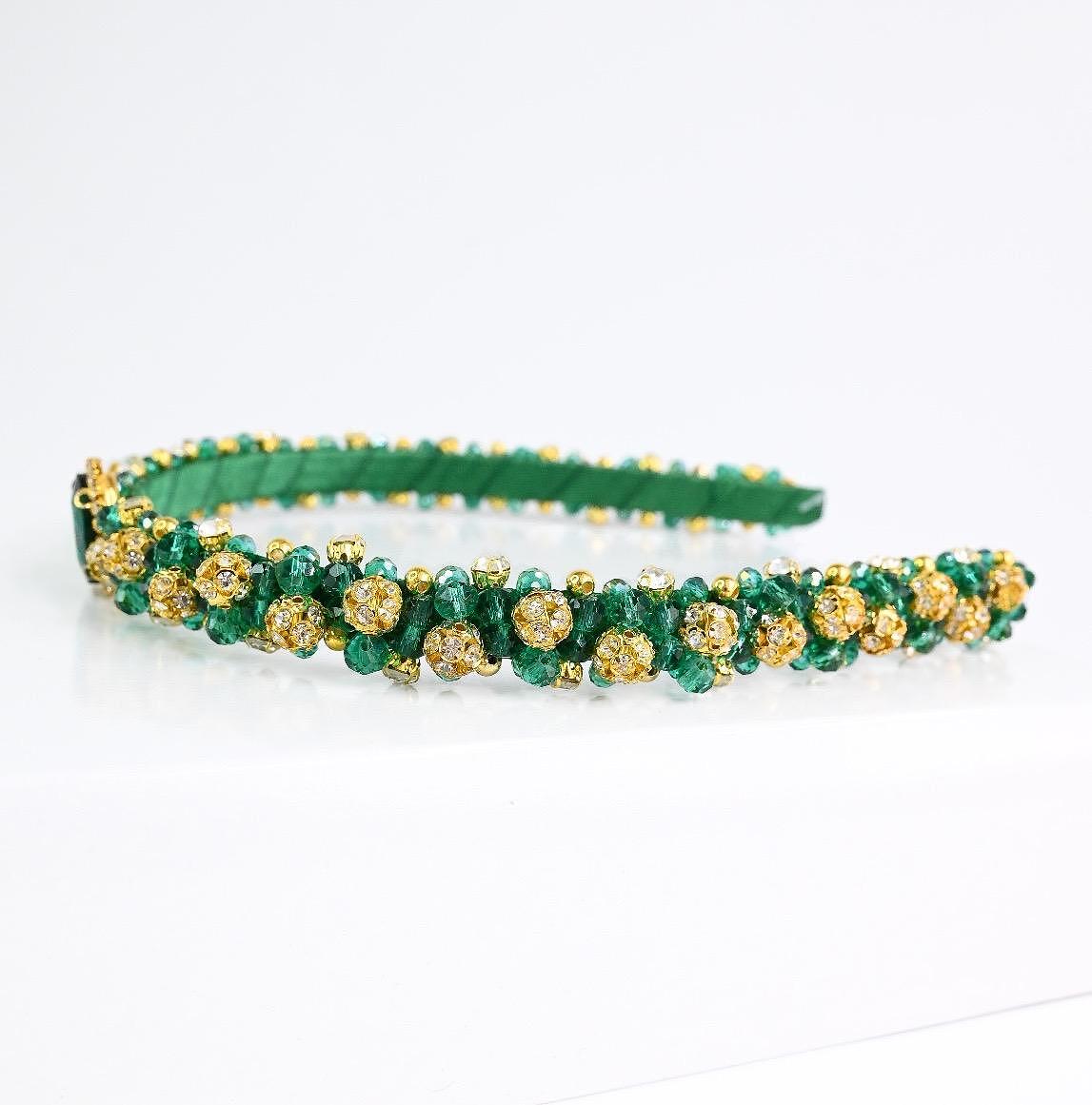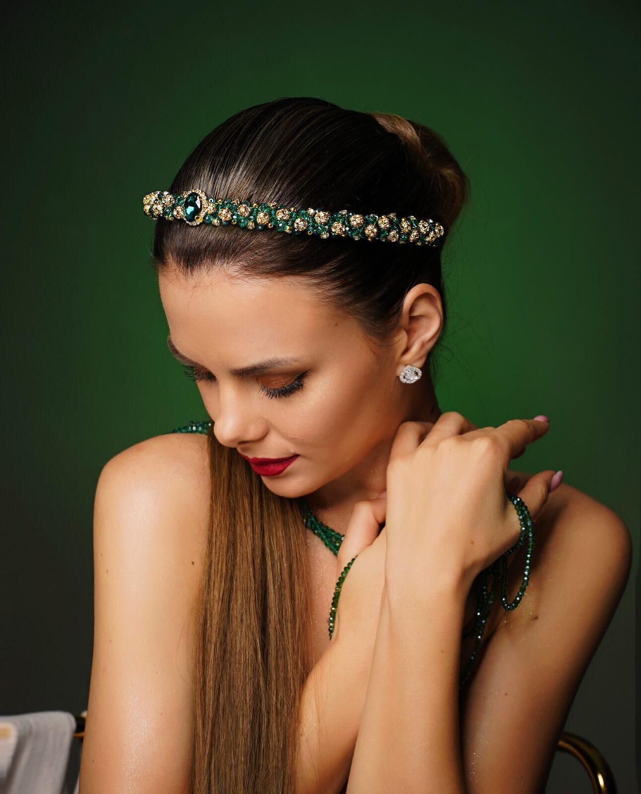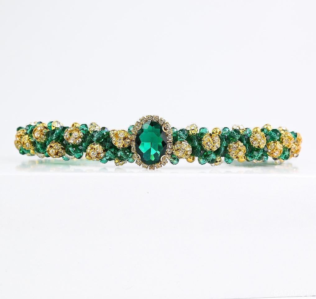 Диадема нашита цялата с кристали и мъниста. Нежна и лека. Използвана е твърда корда, която държи здраво и стегнато кристалите по основата на диадемата. Ръчно изработена от висококачествени материали. Размерът може да се регулира, за да бъде удобна на всеки. Широка около 1,2 см.