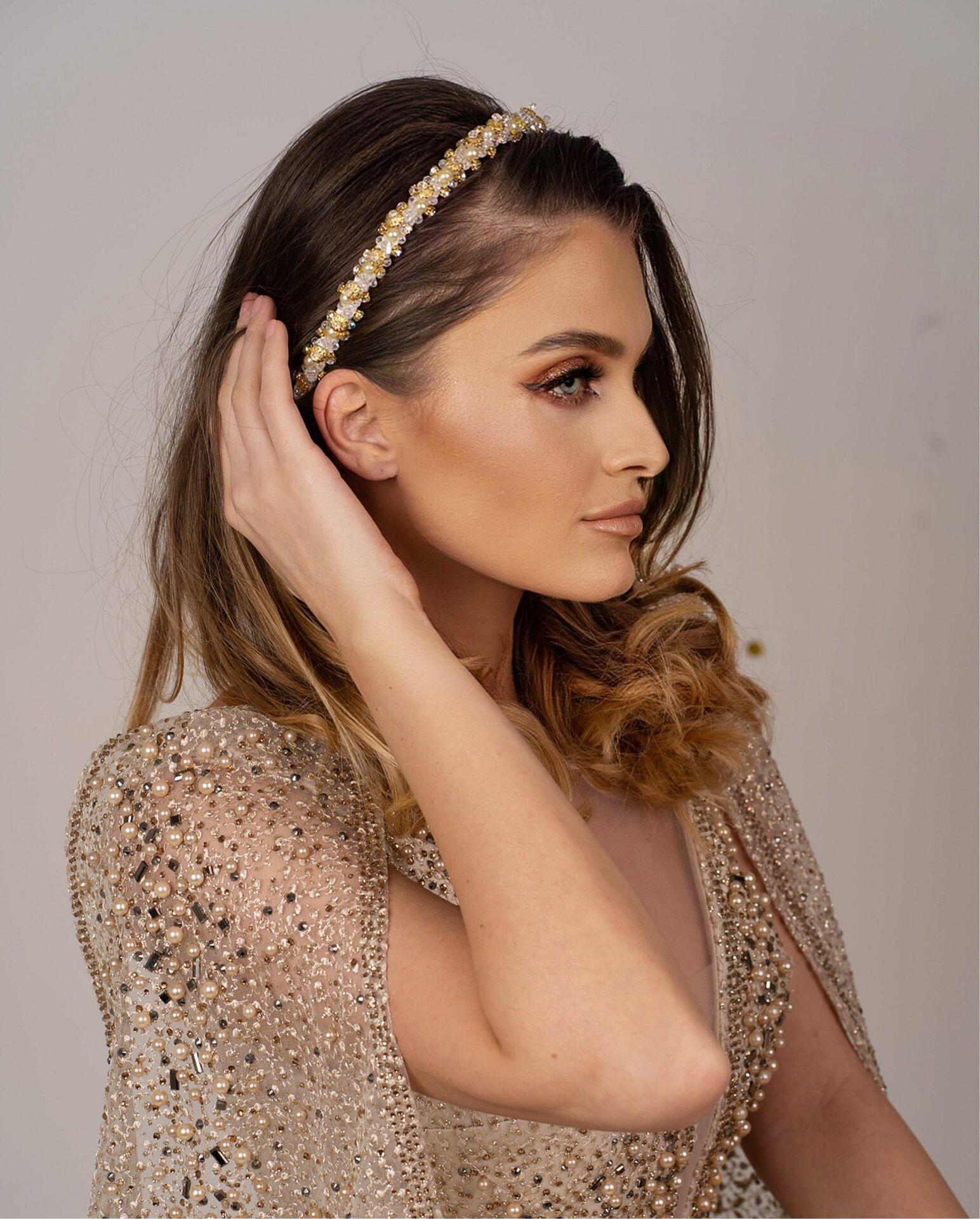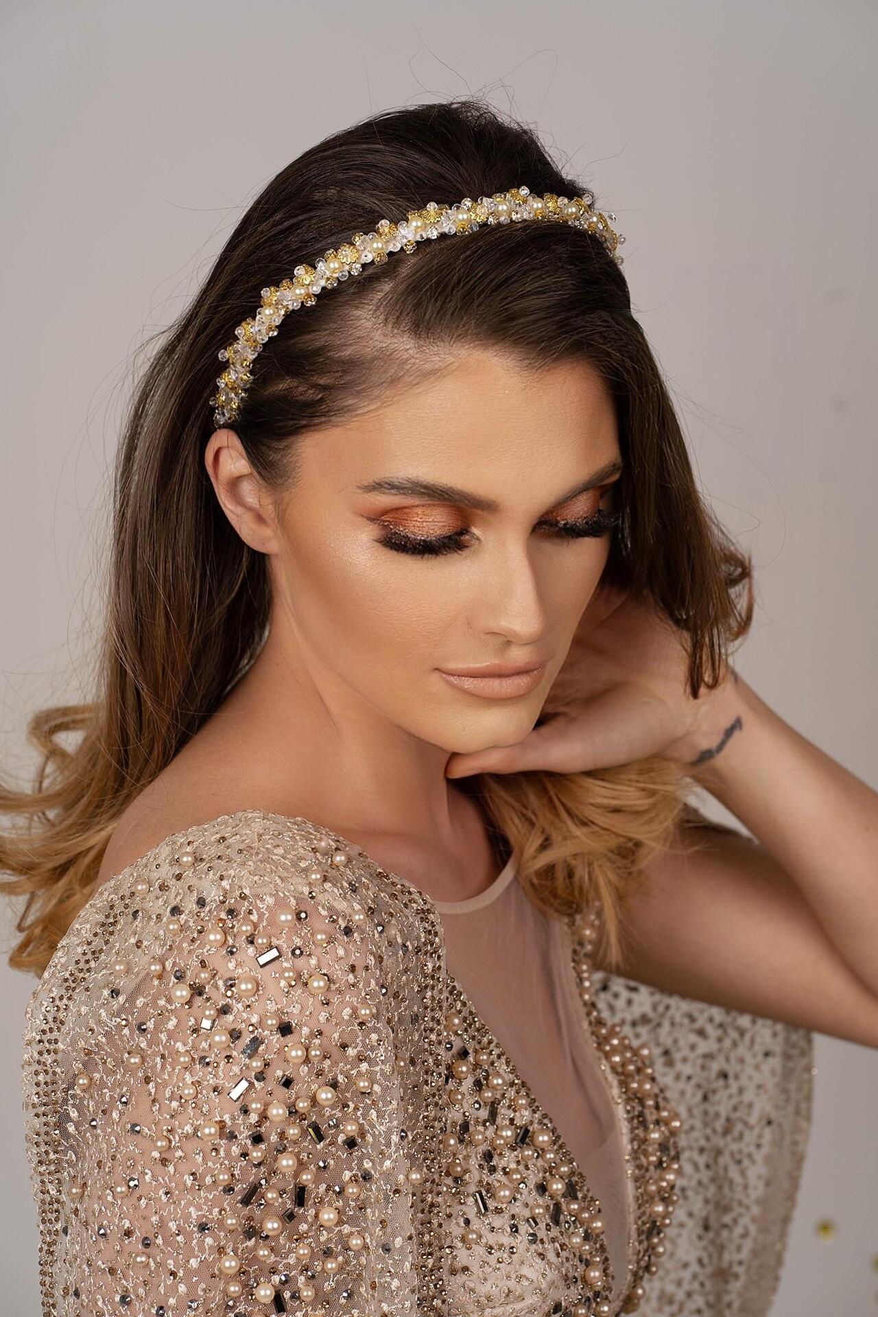 Диадема нашита цялата с кристали и мъниста. Нежна и лека. Използвана е твърда корда, която държи здраво и стегнато кристалите по основата на диадемата. Ръчно изработена от висококачествени материали. Размерът може да се регулира, за да бъде удобна на всеки. Широка около 1,2 см.