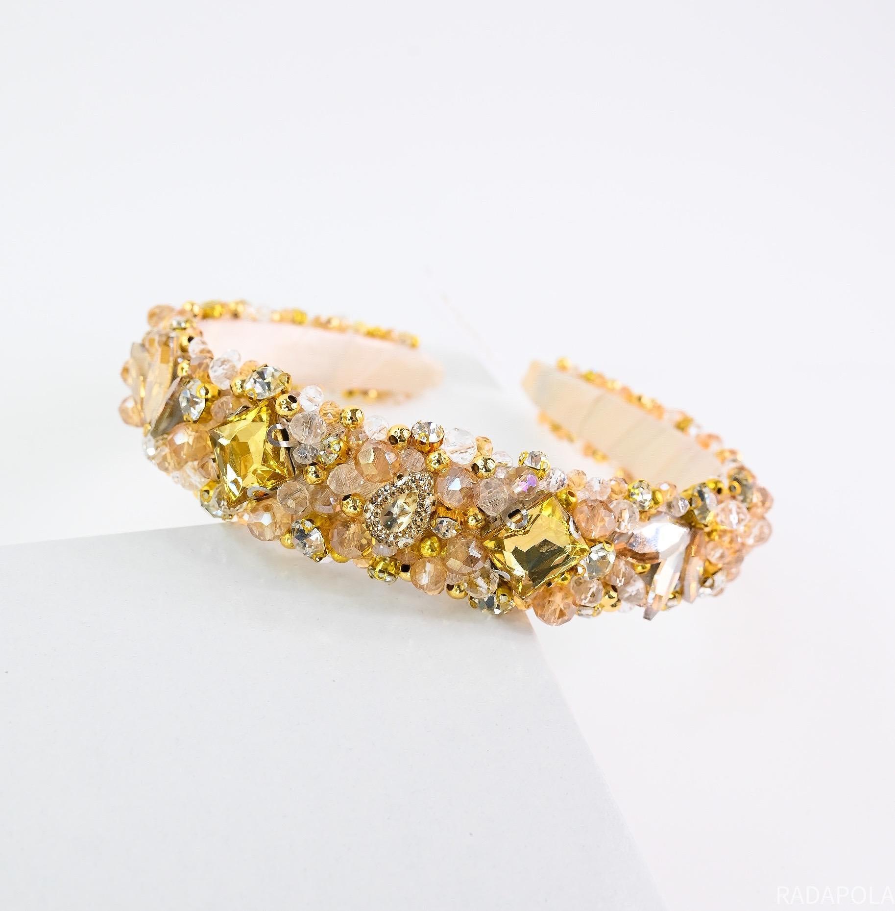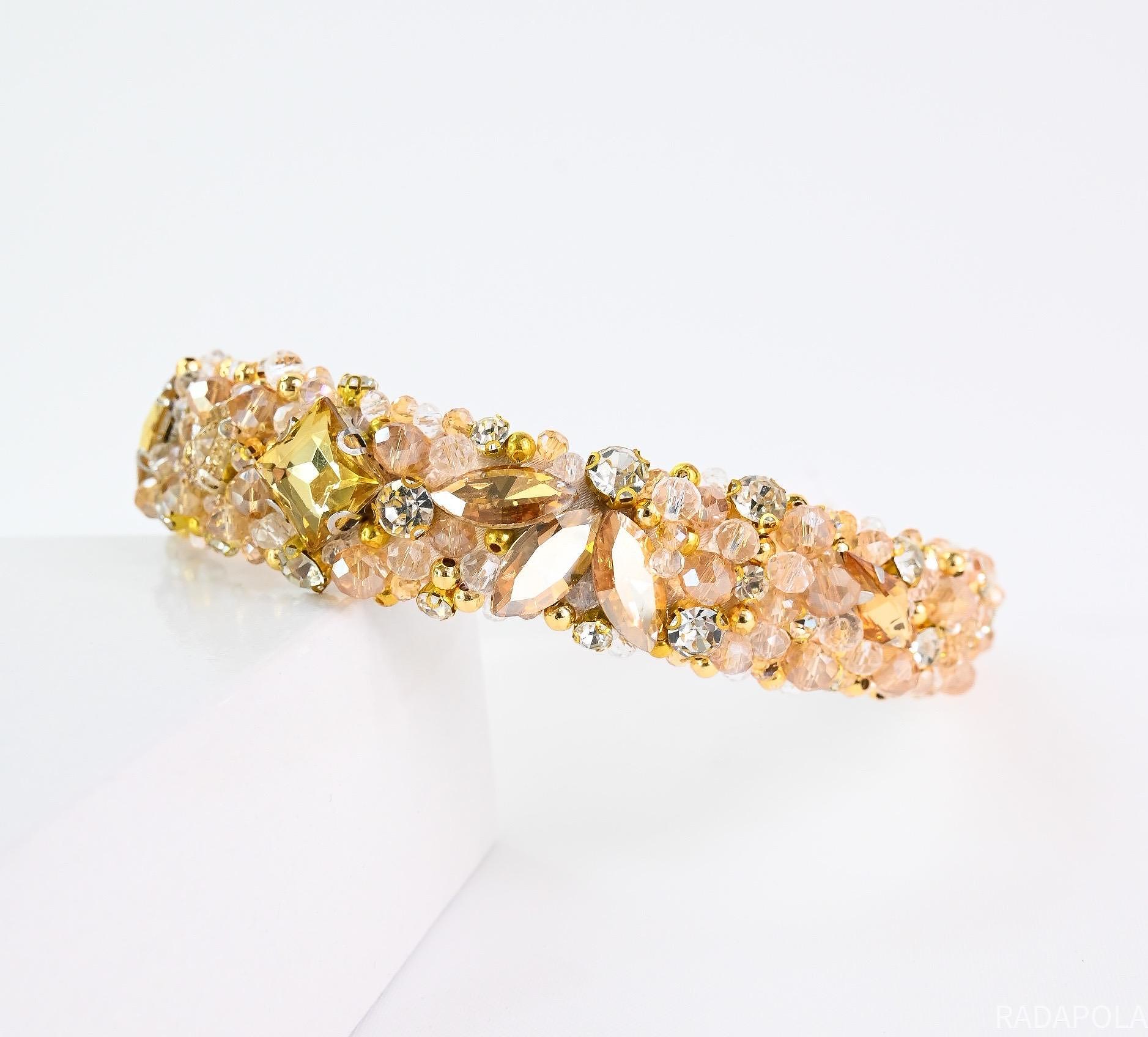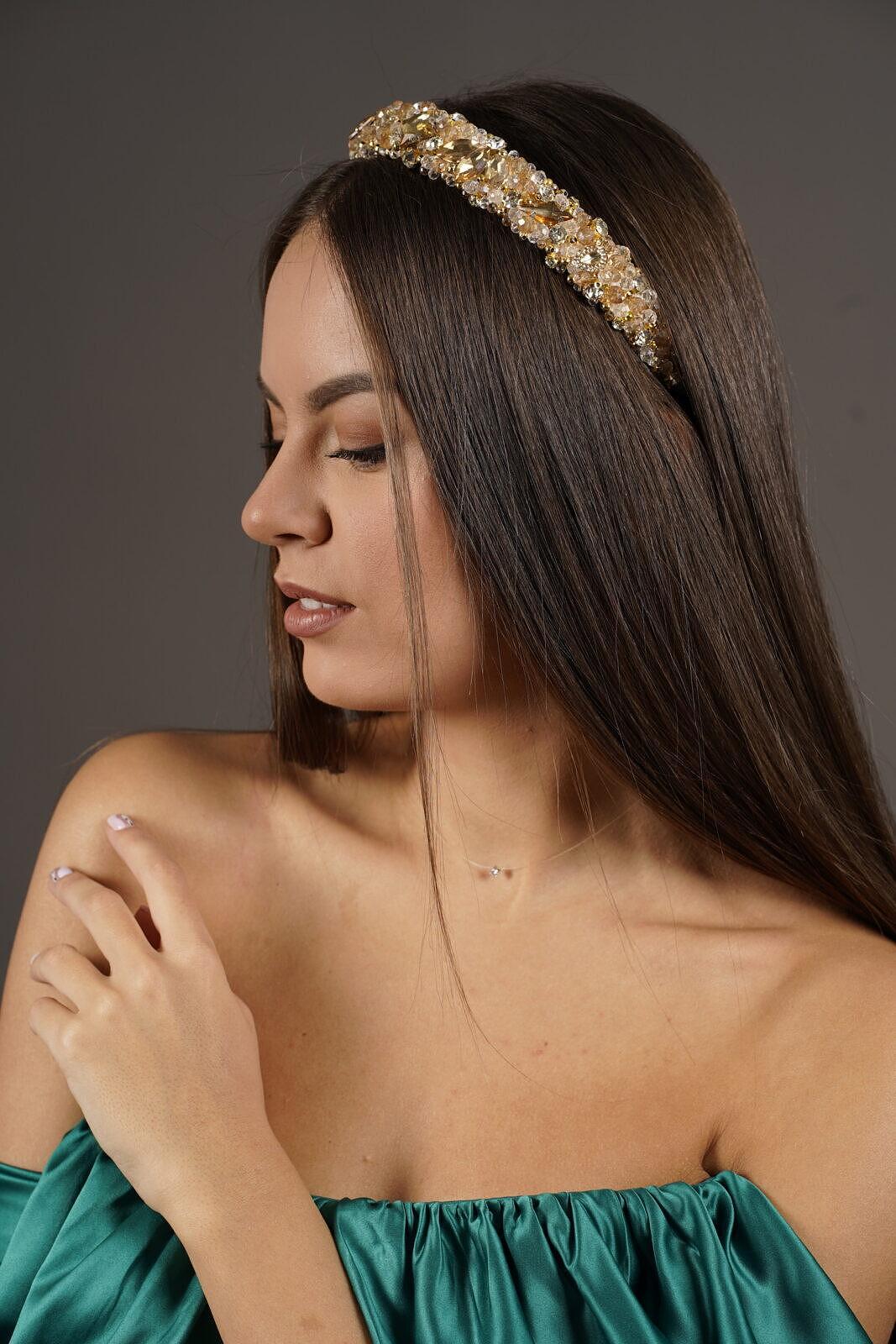 Елегантна златиста диадема, нашита с мъниста и нежни перли, широка около 4 см, подходяща за всякакви поводи. Ръчно изработена от висококачествени материали. Размерът може да бъде регулиран спрямо вашата глава, за да бъде удобно за всеки.