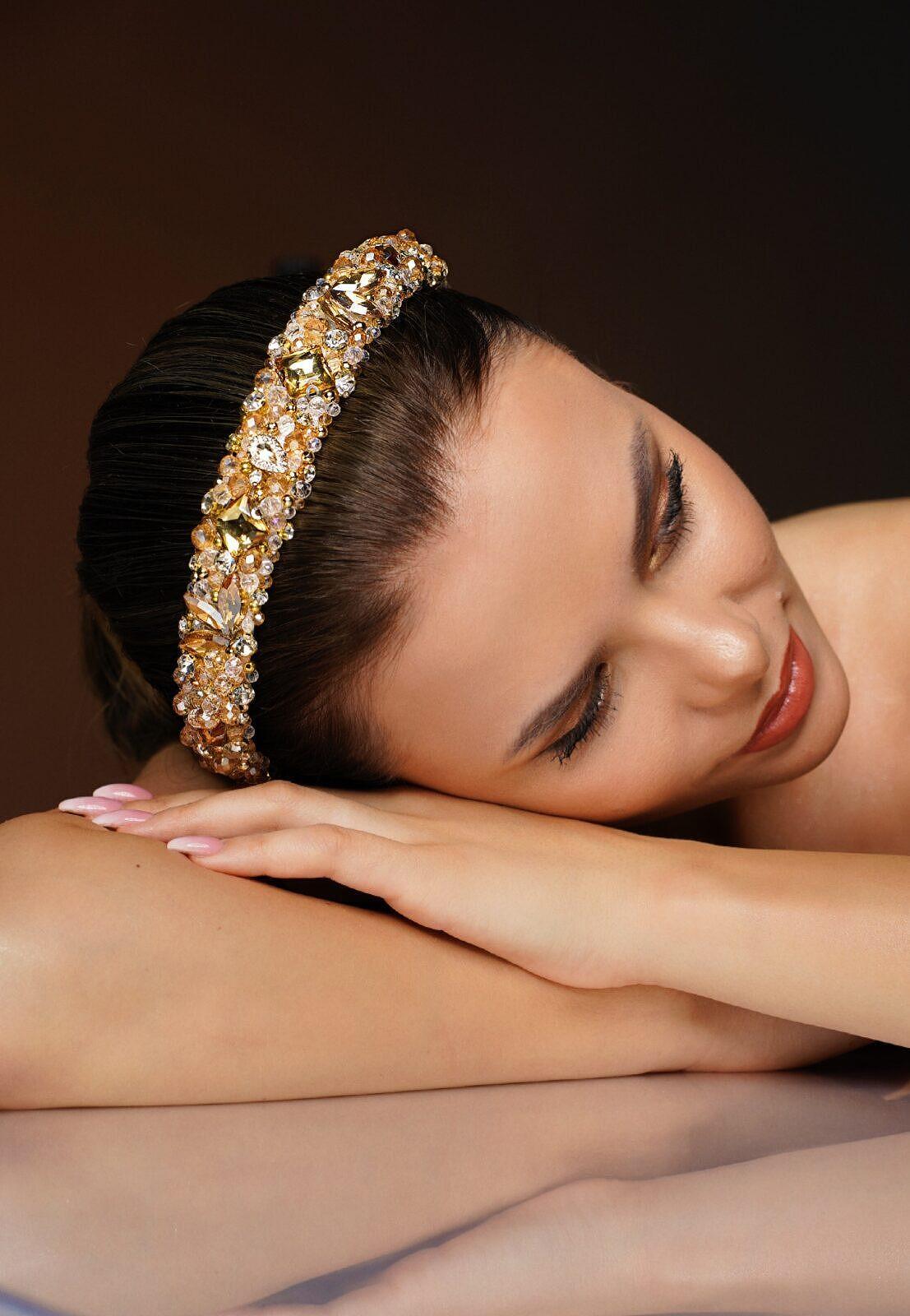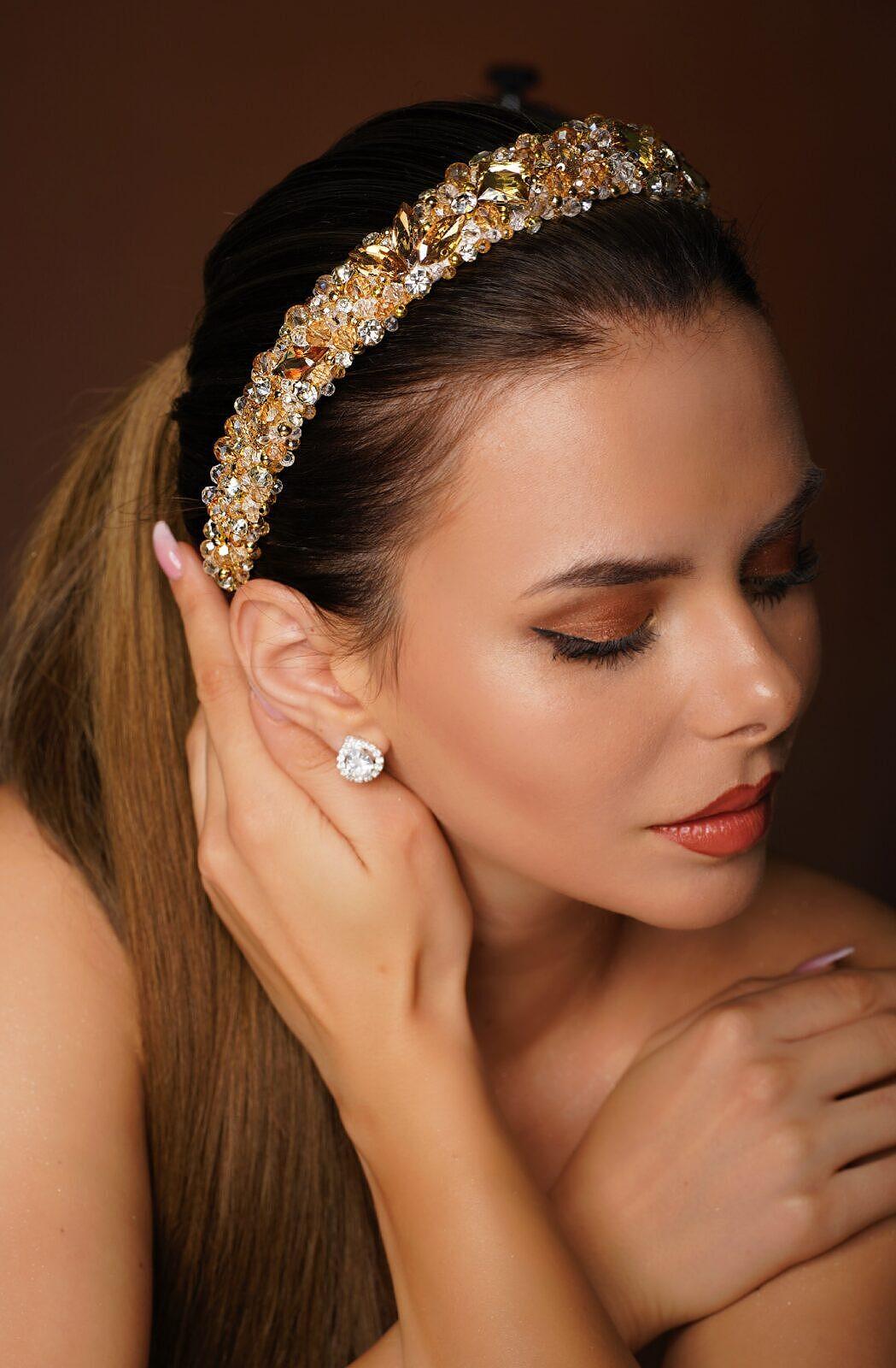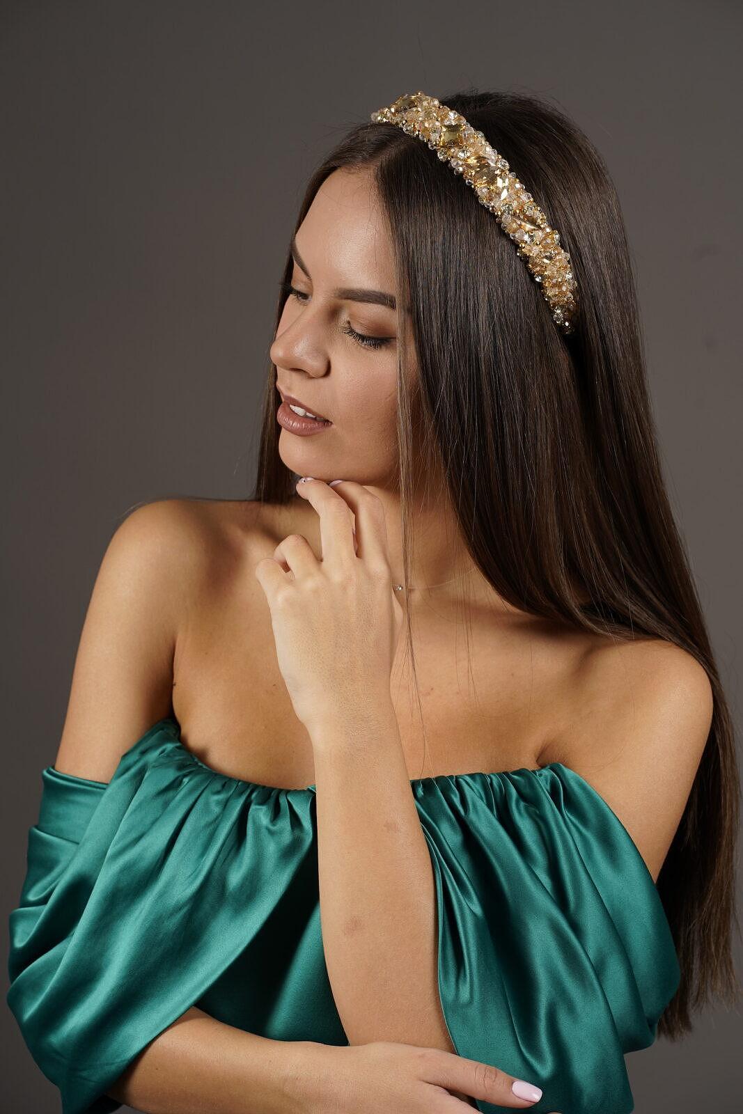 Елегантна златиста диадема, нашита с мъниста и нежни перли, широка около 4 см, подходяща за всякакви поводи. Ръчно изработена от висококачествени материали. Размерът може да бъде регулиран спрямо вашата глава, за да бъде удобно за всеки.
