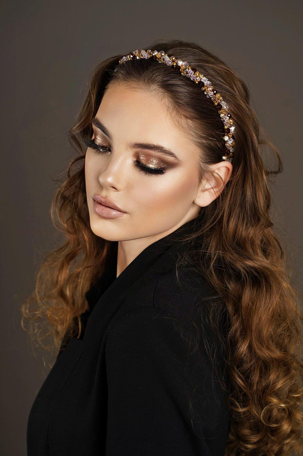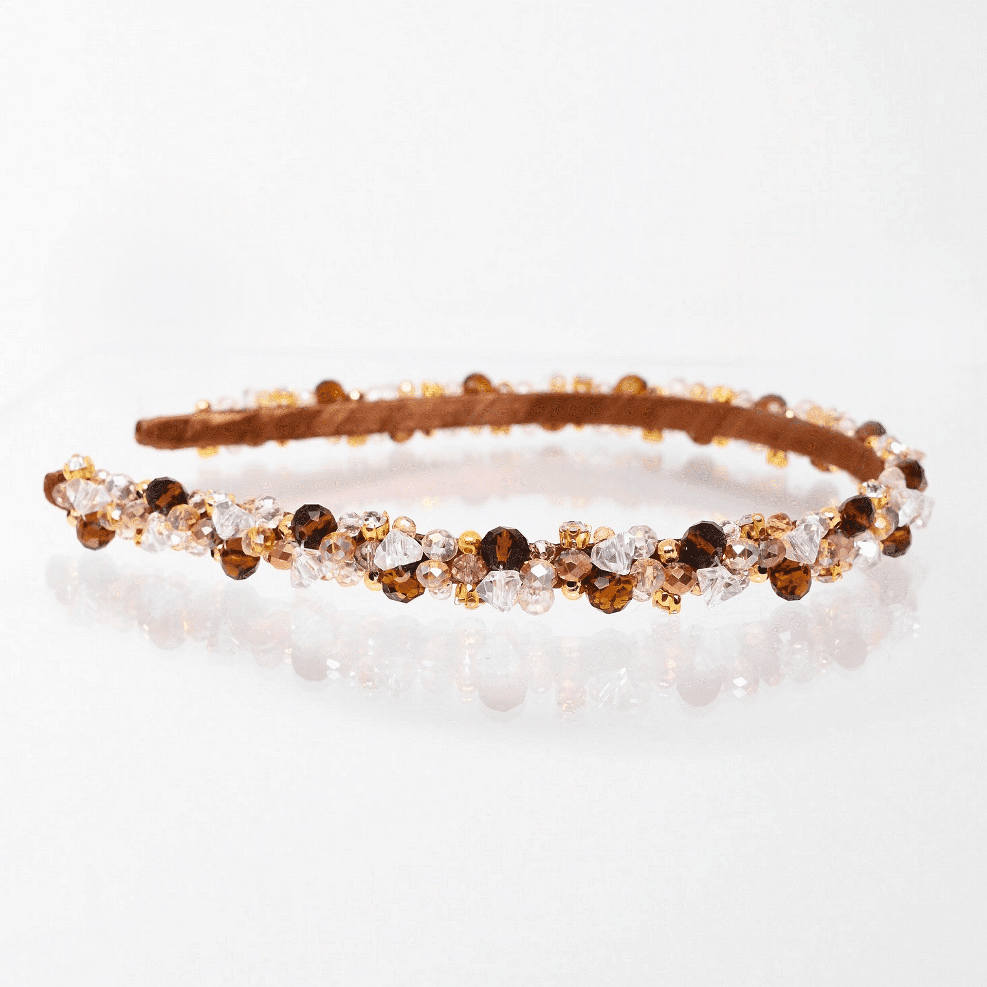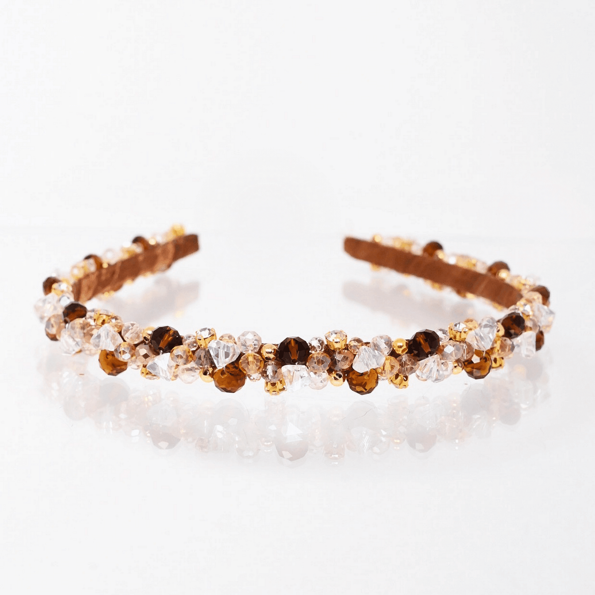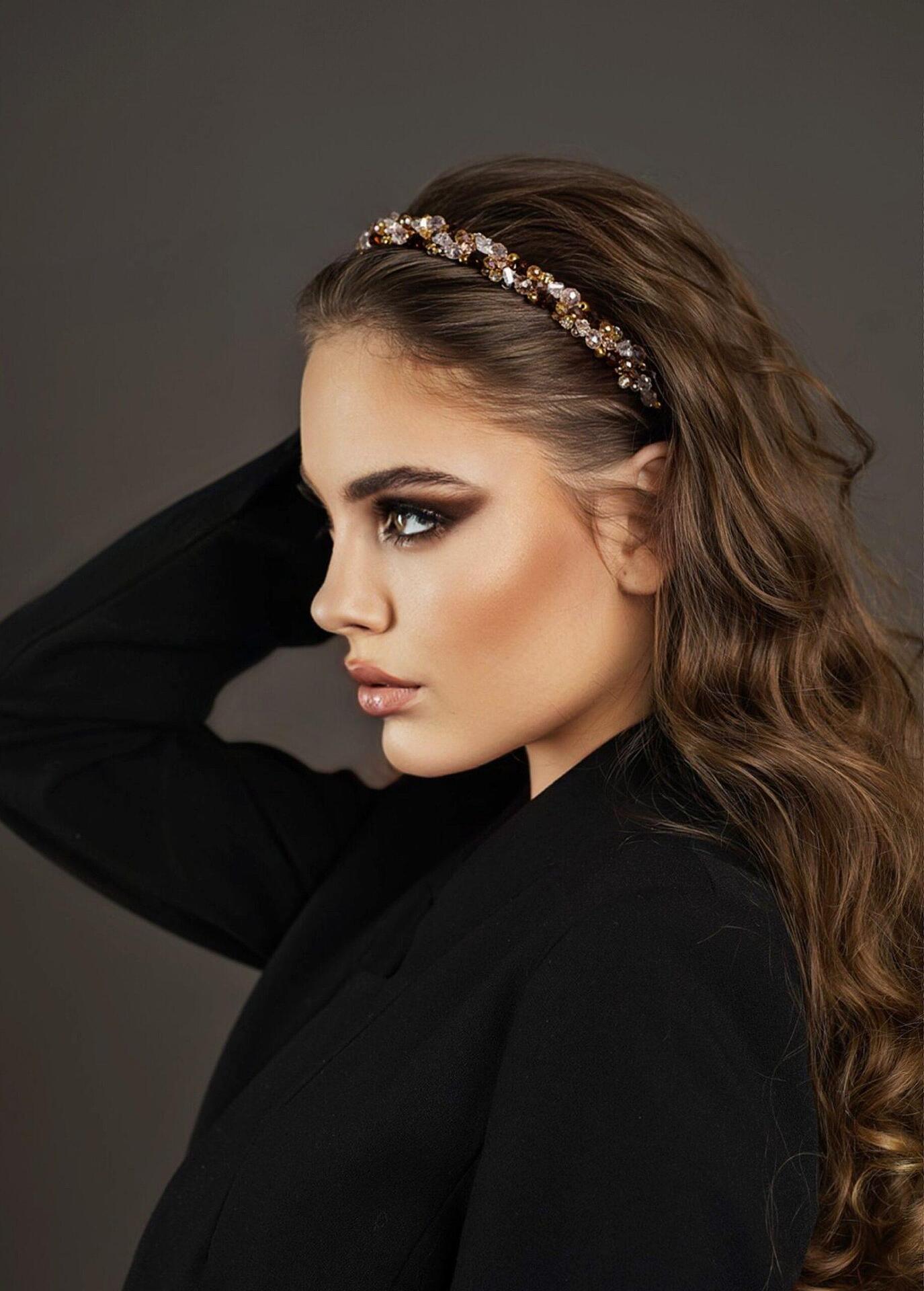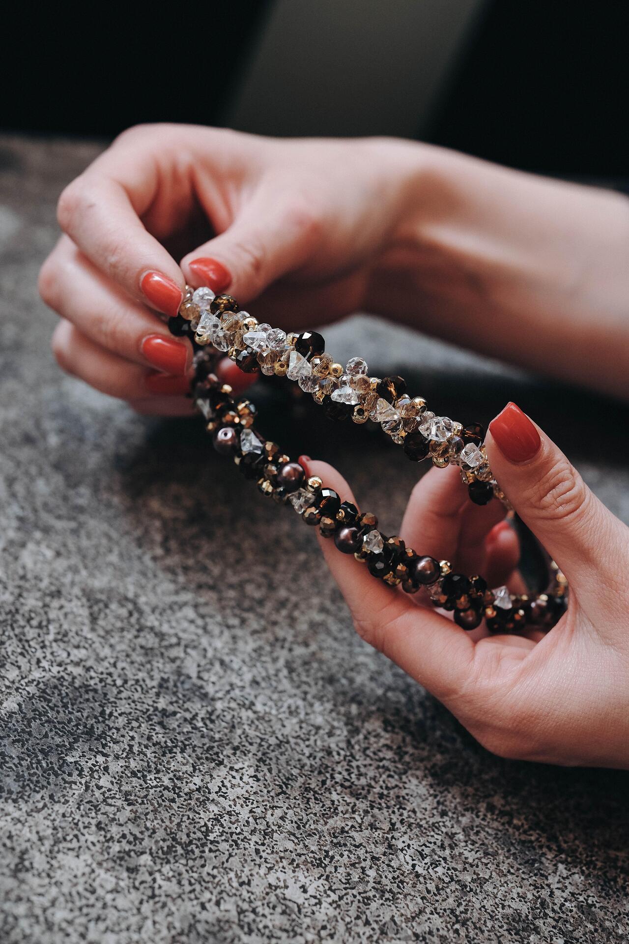 Диадема нашита цялата с кристали и мъниста. Нежна и лека. Използвана е твърда корда, която държи здраво и стегнато кристалите по основата на диадемата. Ръчно изработена от висококачествени материали. Размерът може да се регулира, за да бъде удобна на всеки. Широка около 2 см.