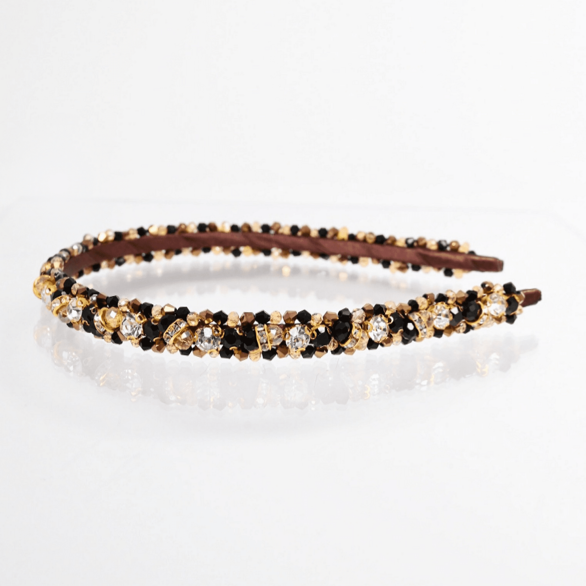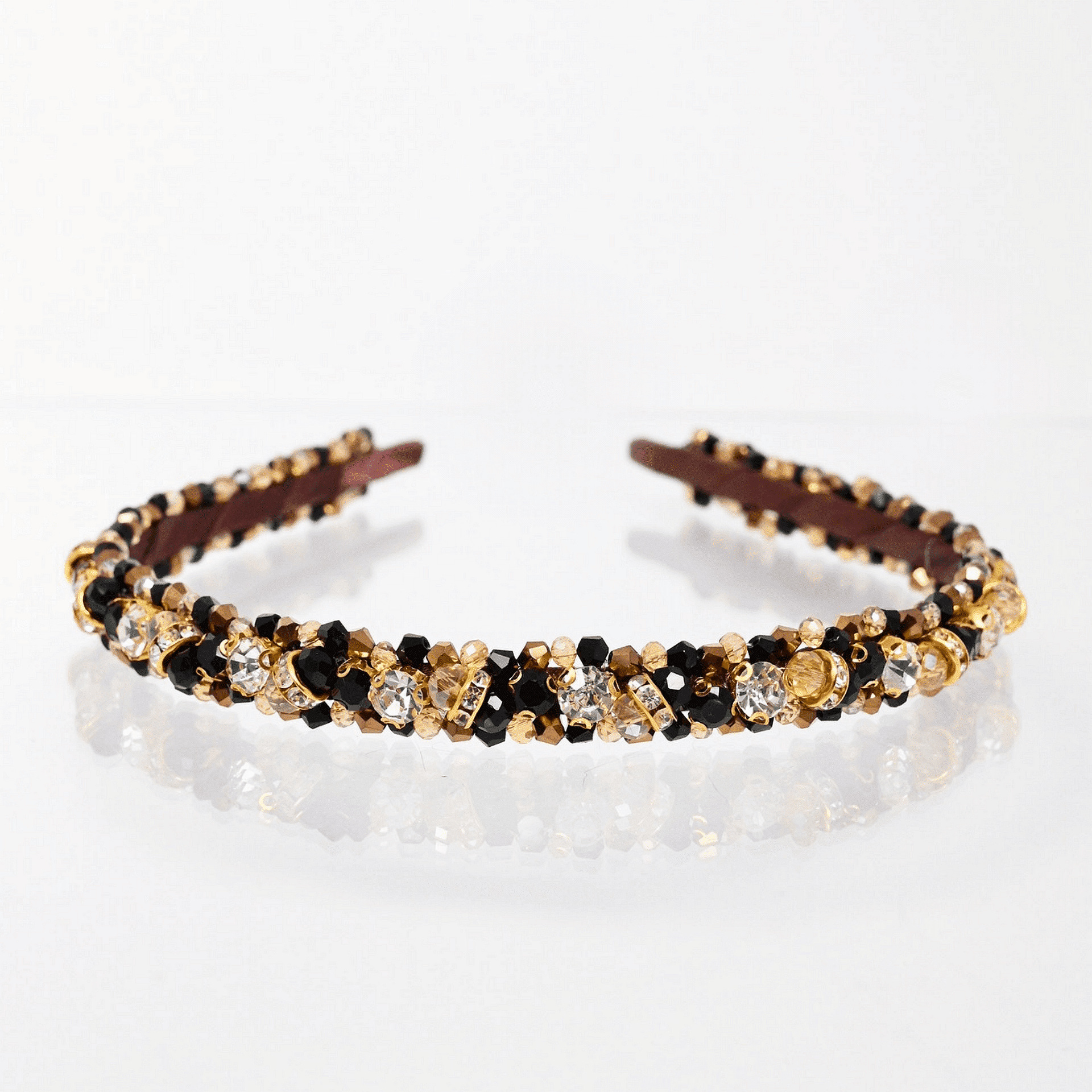 Диадема нашита цялата с кристали и мъниста. Нежна и лека. Използвана е твърда корда, която държи здраво и стегнато кристалите по основата на диадемата. Ръчно изработена от висококачествени материали. Размерът може да се регулира, за да бъде удобна на всеки. Широка около 2 см.