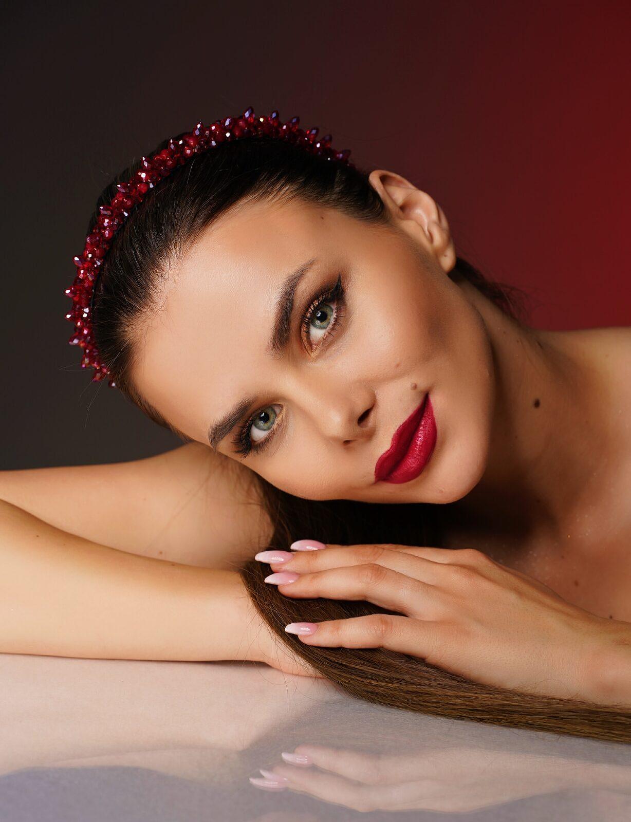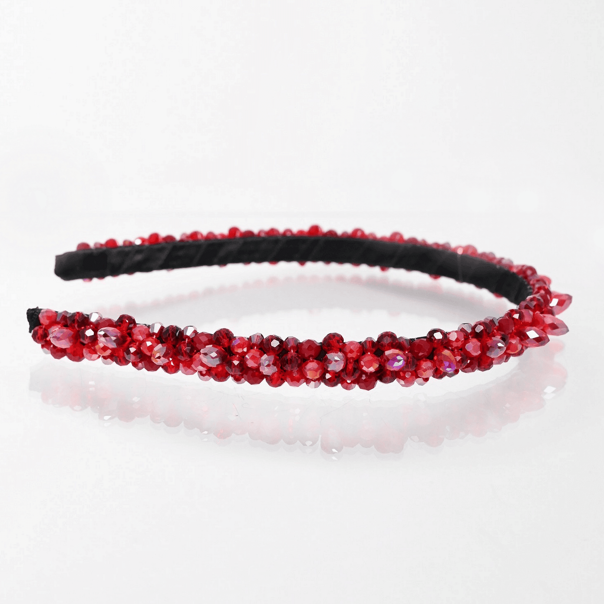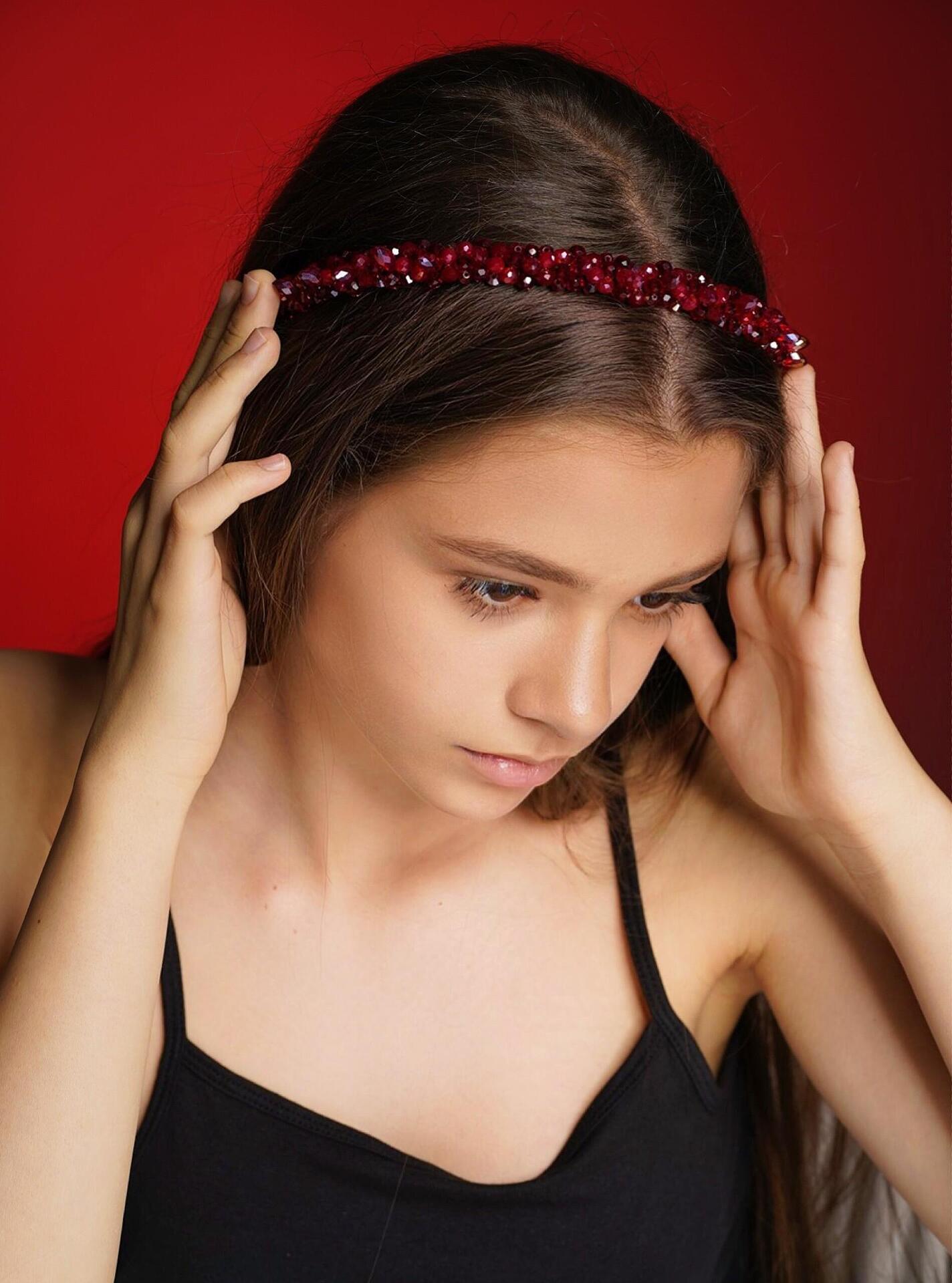 Диадема нашита цялата с кристали и мъниста. Нежна и лека. Използвана е твърда корда, която държи здраво и стегнато кристалите по основата на диадемата. Ръчно изработена от висококачествени материали. Размерът може да се регулира, за да бъде удобна на всеки. Широка около 2 см.