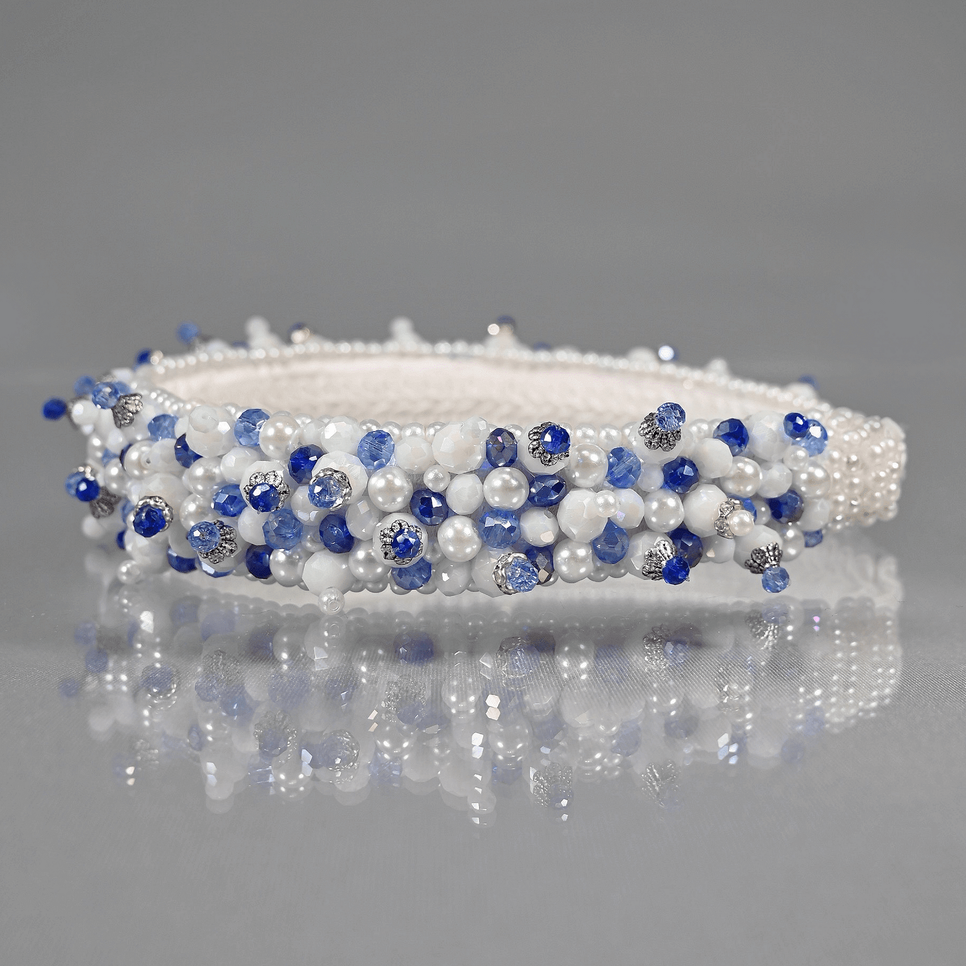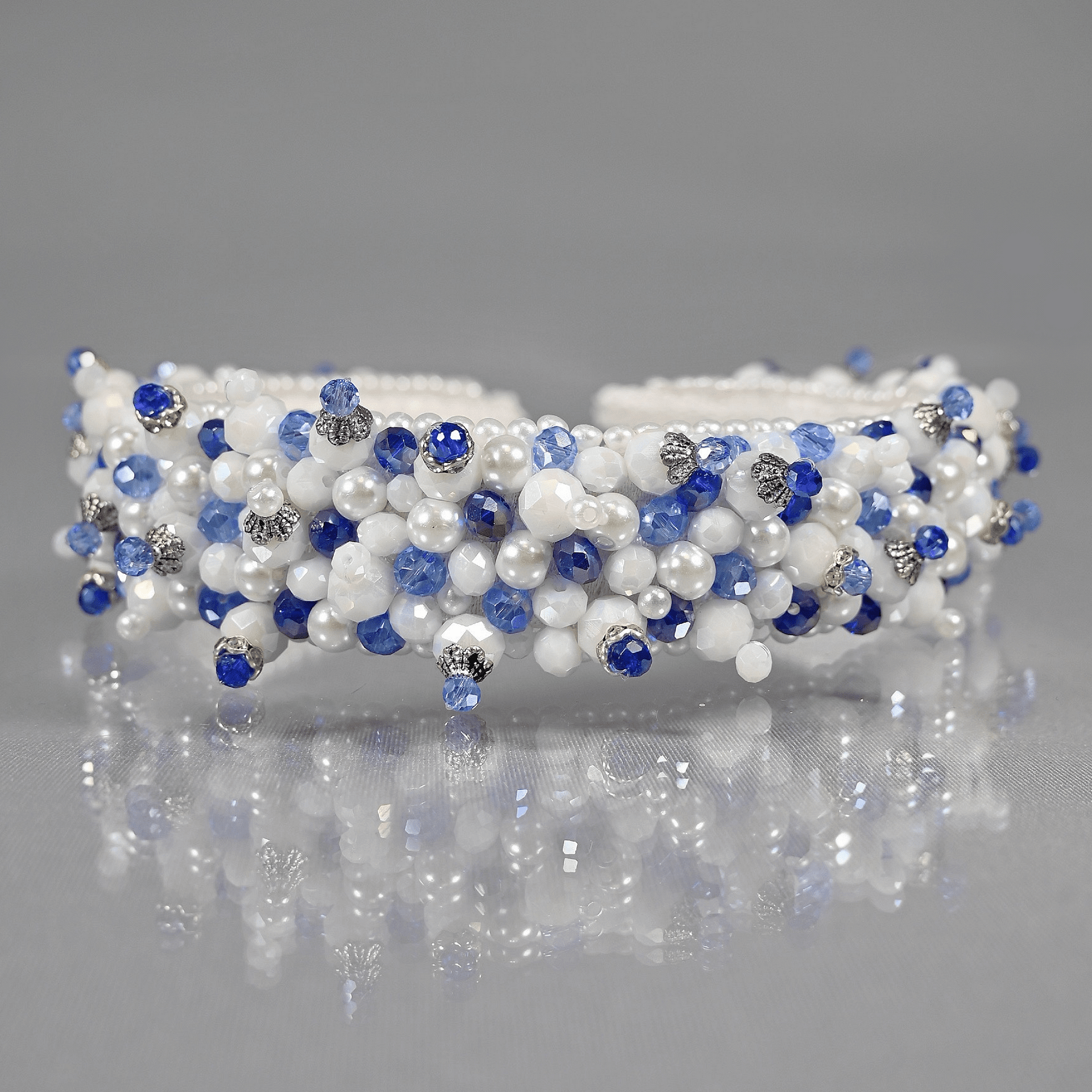 Диадема нашита цялата с кристали и мъниста. Нежна и лека. Използвана е твърда корда, която държи здраво и стегнато кристалите по основата на диадемата. Ръчно изработена от висококачествени материали. Размерът е универсален и не може да бъде регулиран.