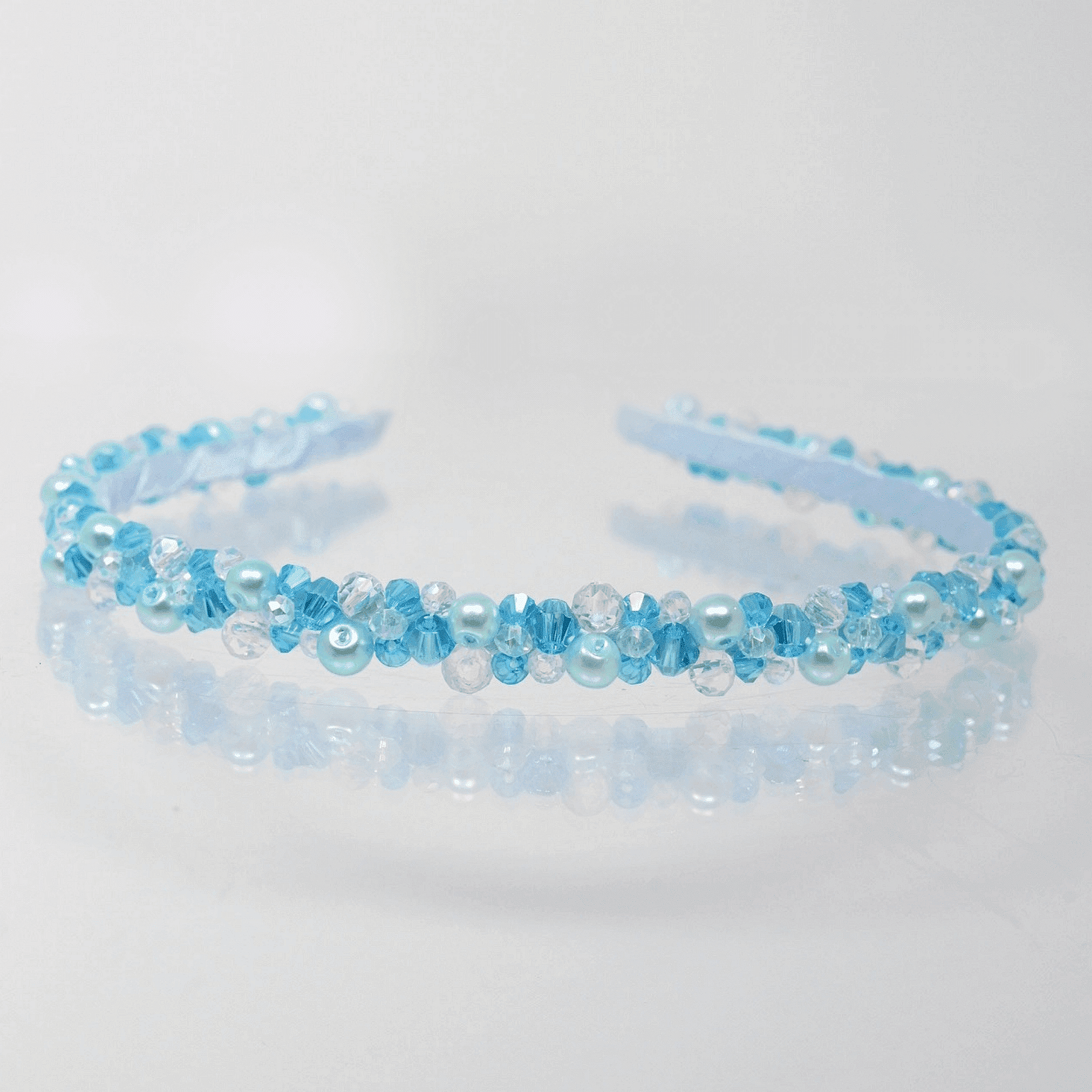 Тънка светлосиня диадема, нашита с мъниста и перли, широка около 1,2 см. Подходяща и за малки момиченца. Ръчно изработена от висококачествени материали. Размерът може да бъде регулиран спрямо вашата глава, за да бъде удобно за всеки.