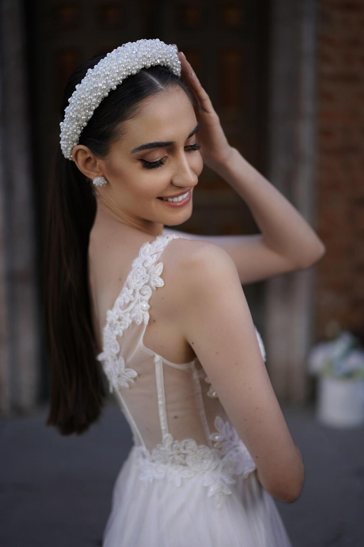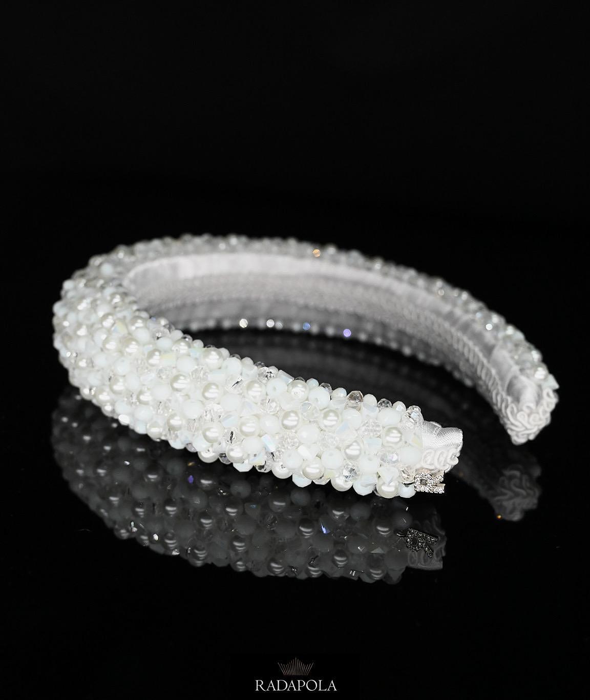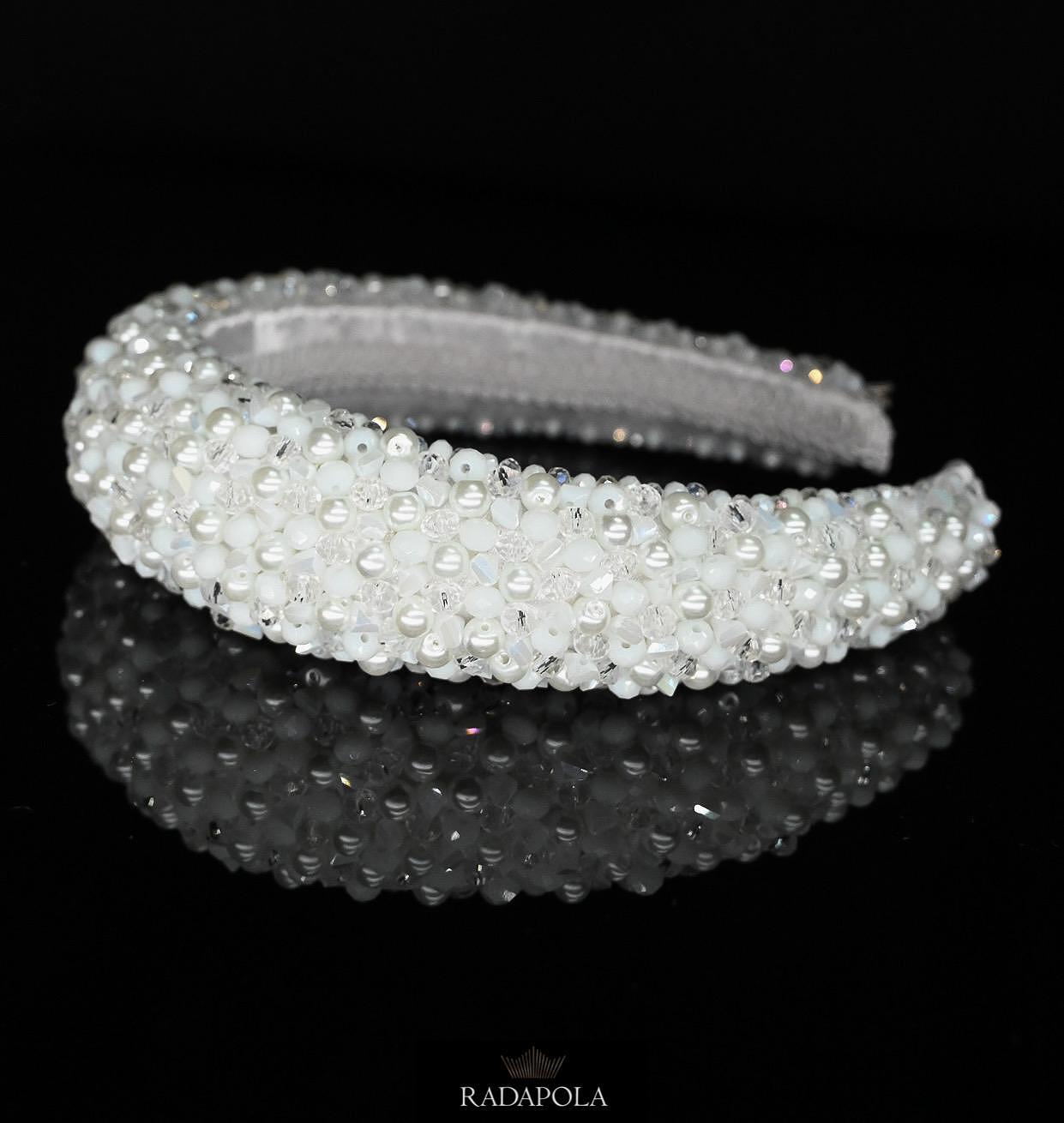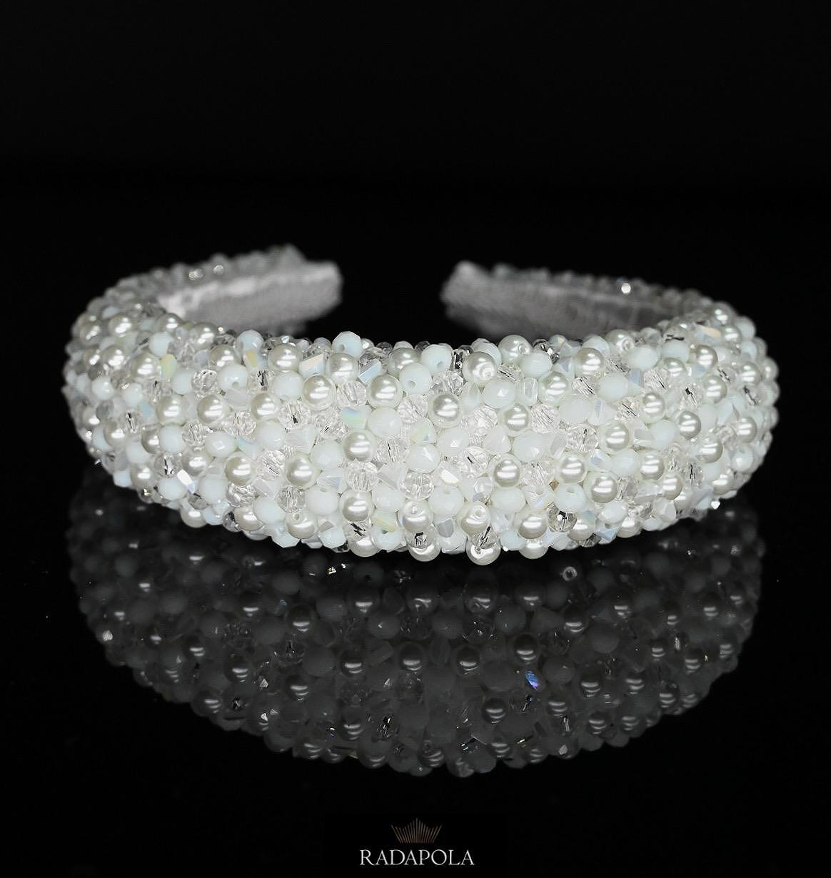 Обемна бяла сватбена диадема, обшита с перли, мъниста и нежна дантела. Широка е 5 см. Този аксесоар е подходящ за вашия специален повод. Изработена е от висококачествени материали.