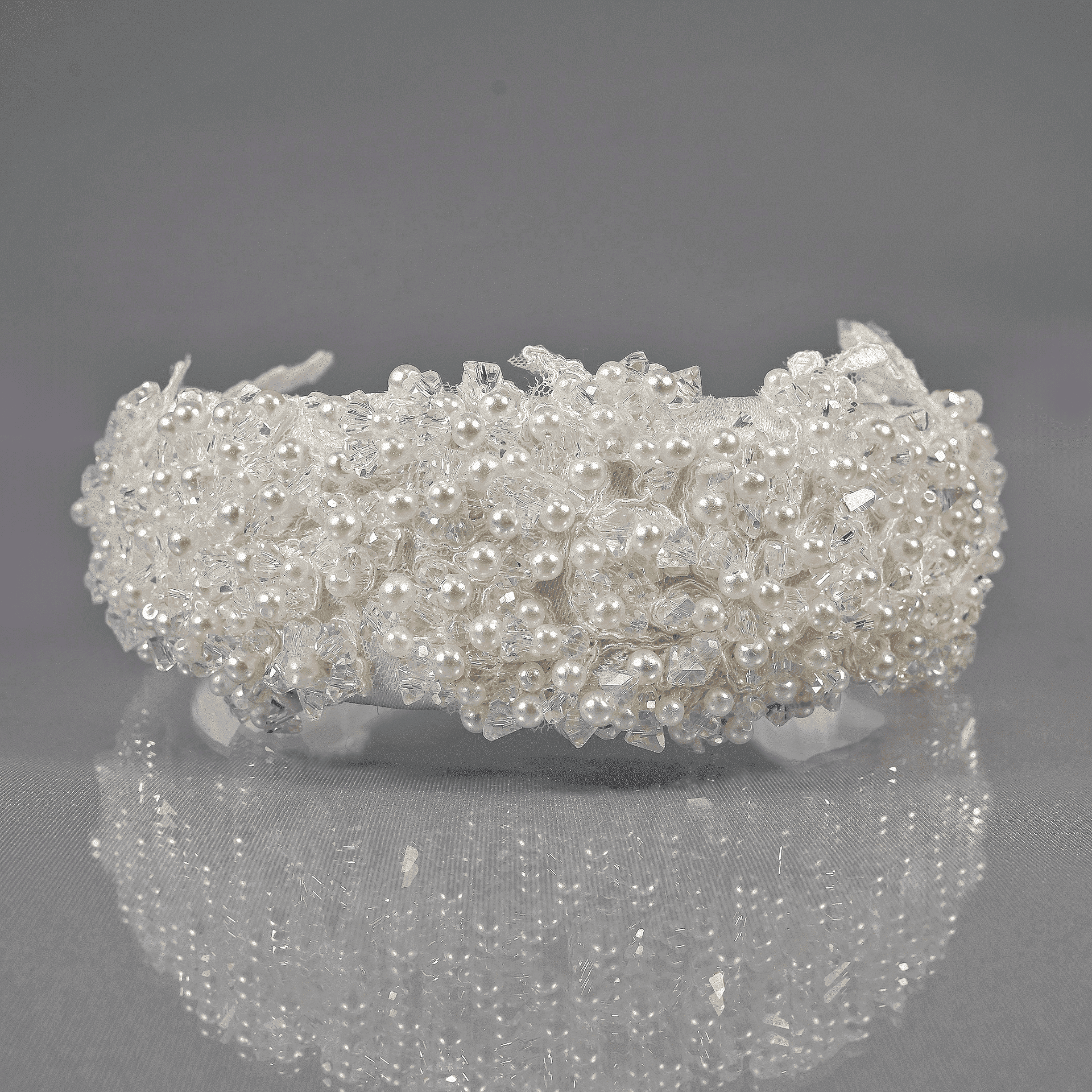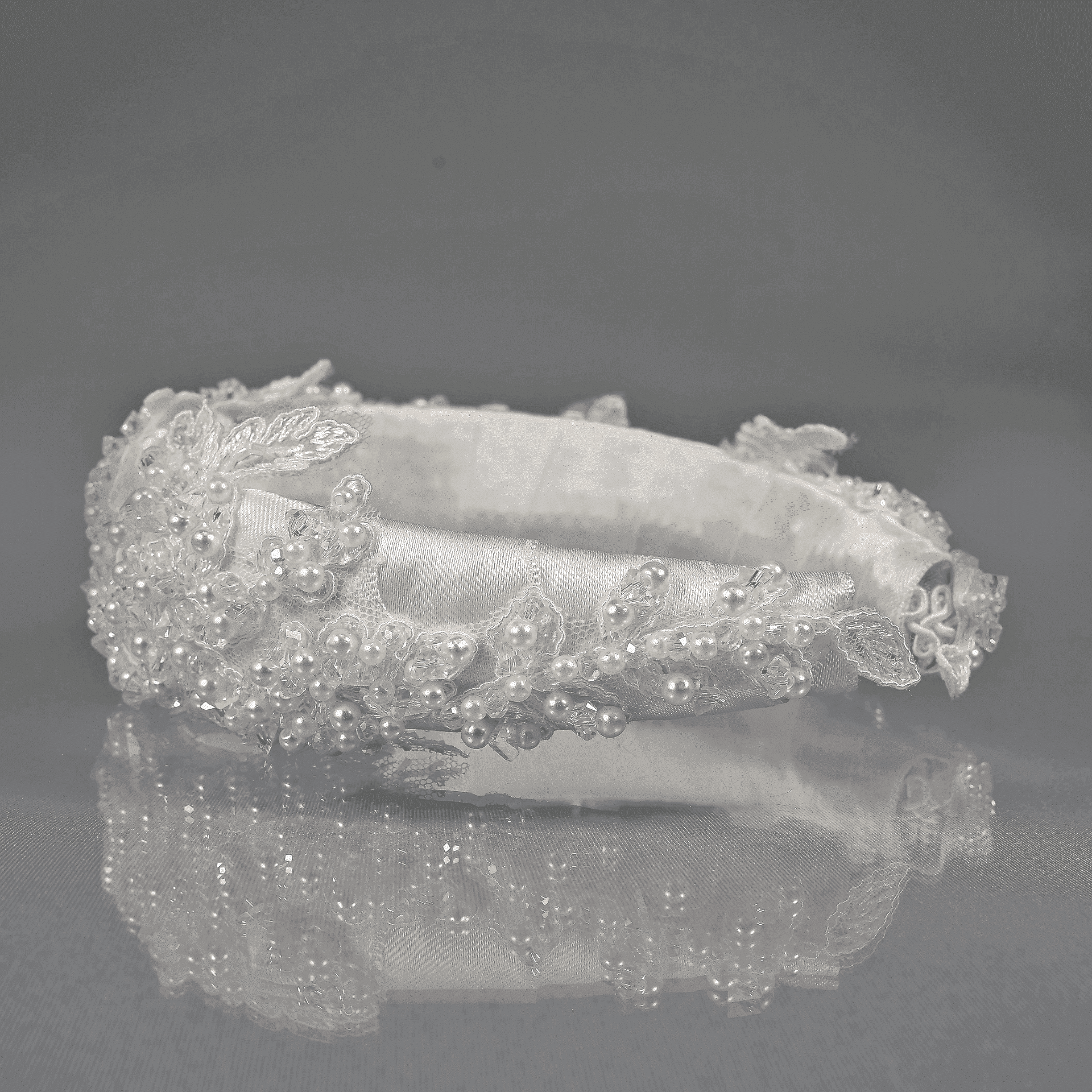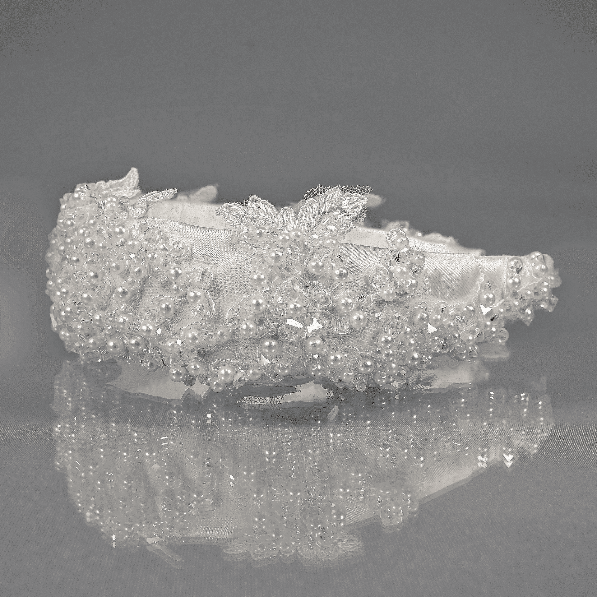 Обемна бяла сватбена диадема, обшита с перли, мъниста и нежна дантела. Широка е 5 см. Този аксесоар е подходящ за вашия специален повод. Изработена е от висококачествени материали.