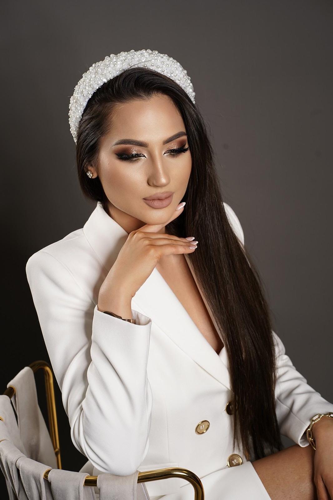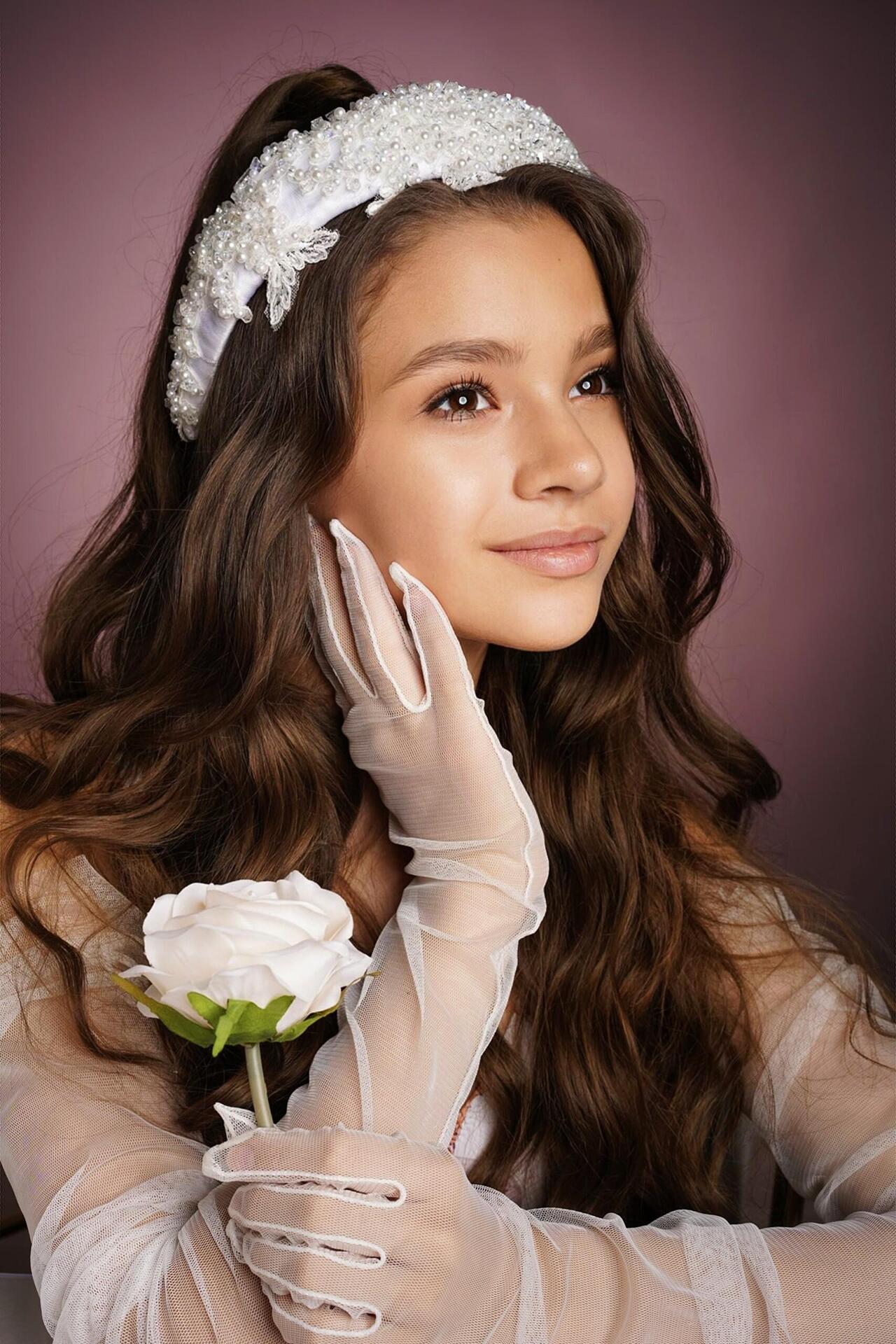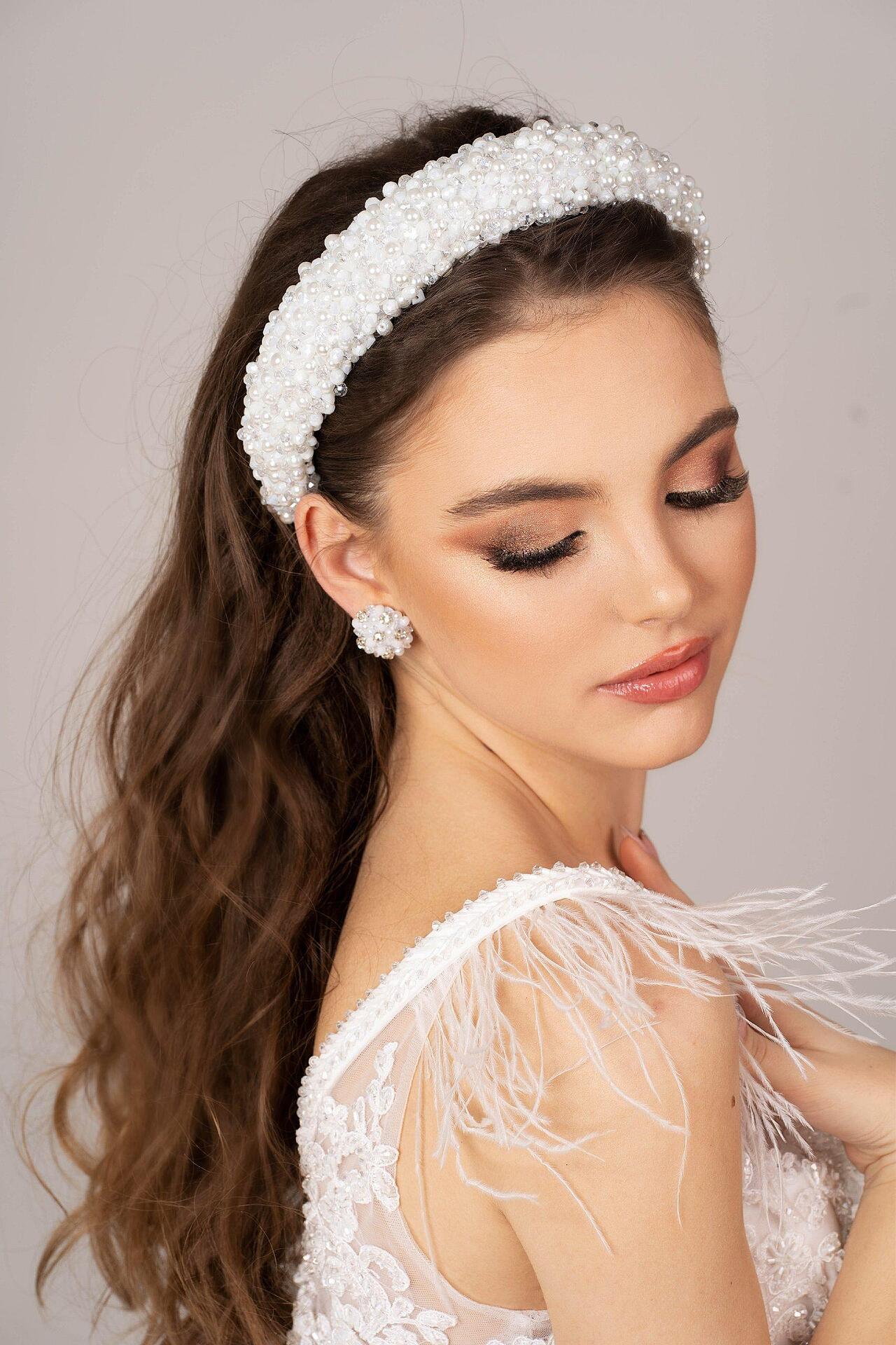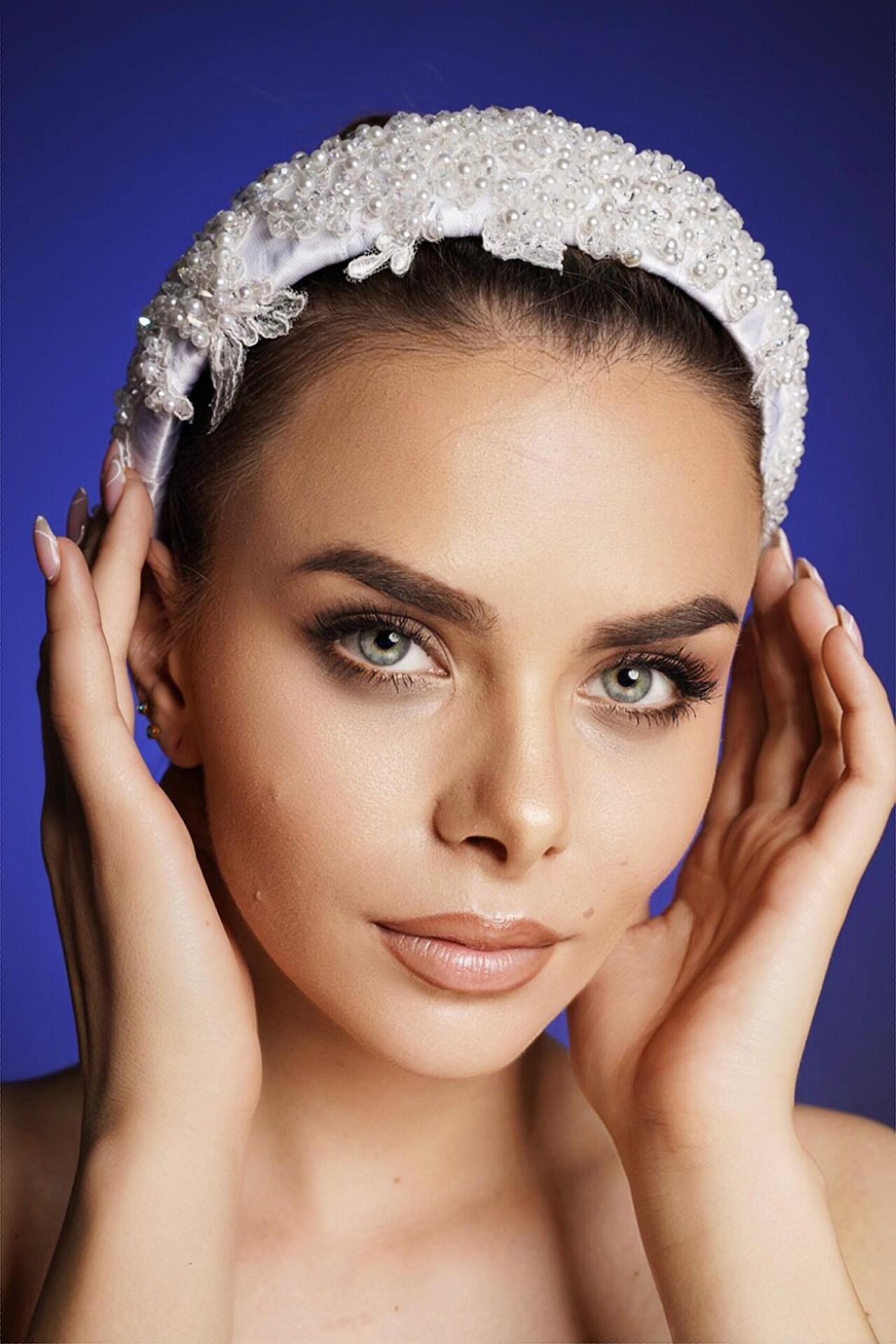 Обемна бяла сватбена диадема, обшита с перли, мъниста и нежна дантела. Широка е 5 см. Този аксесоар е подходящ за вашия специален повод. Изработена е от висококачествени материали.