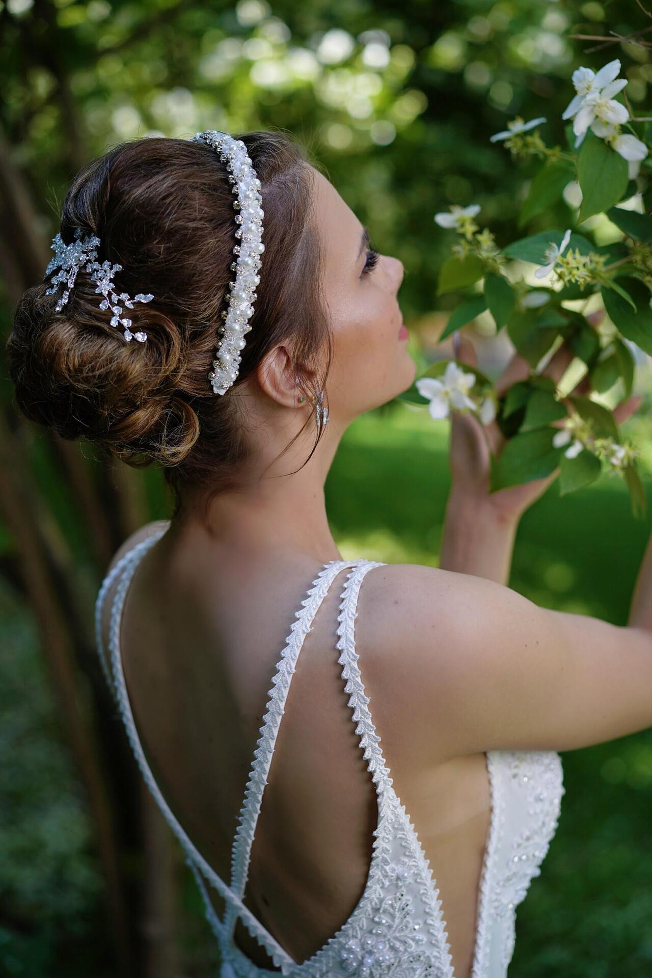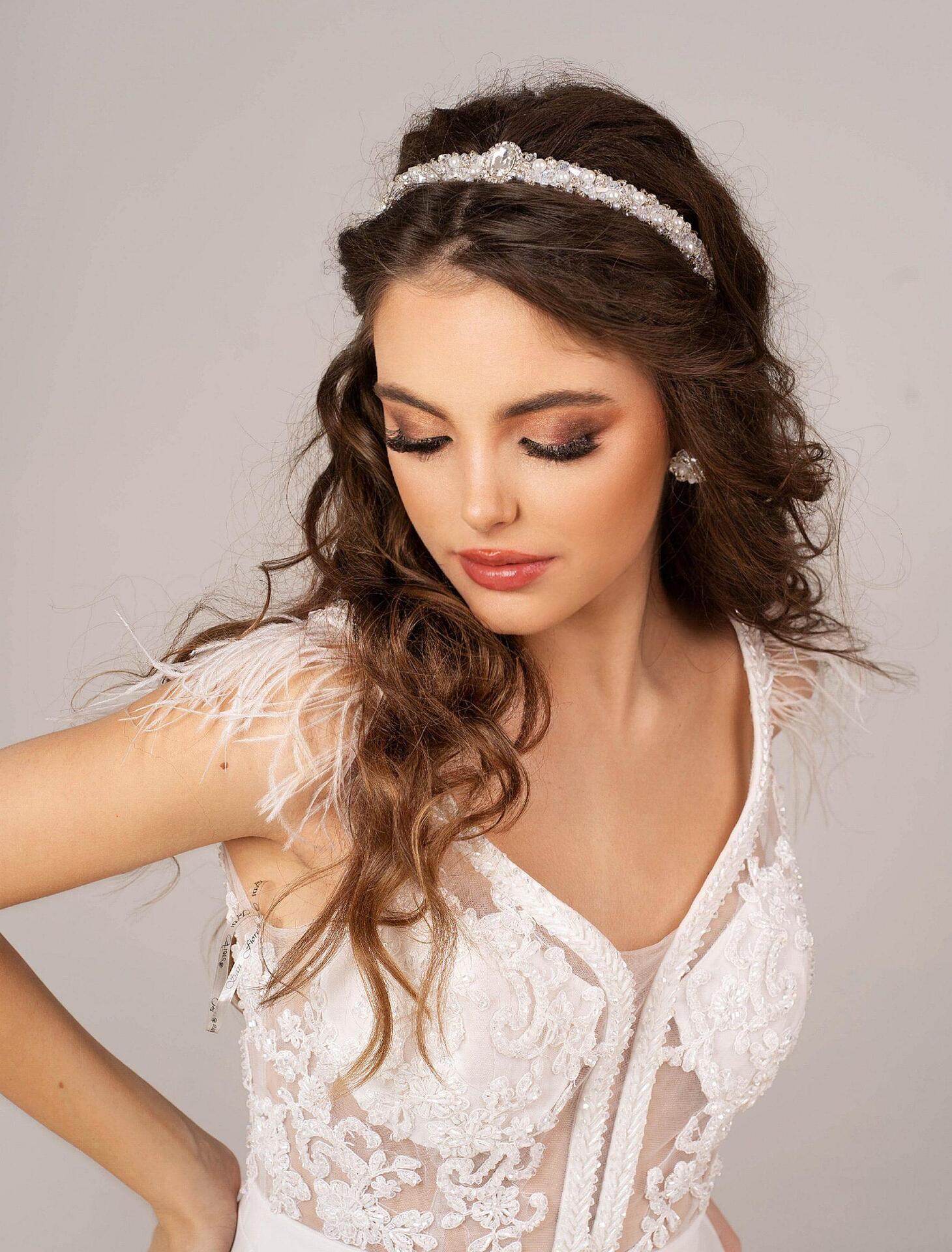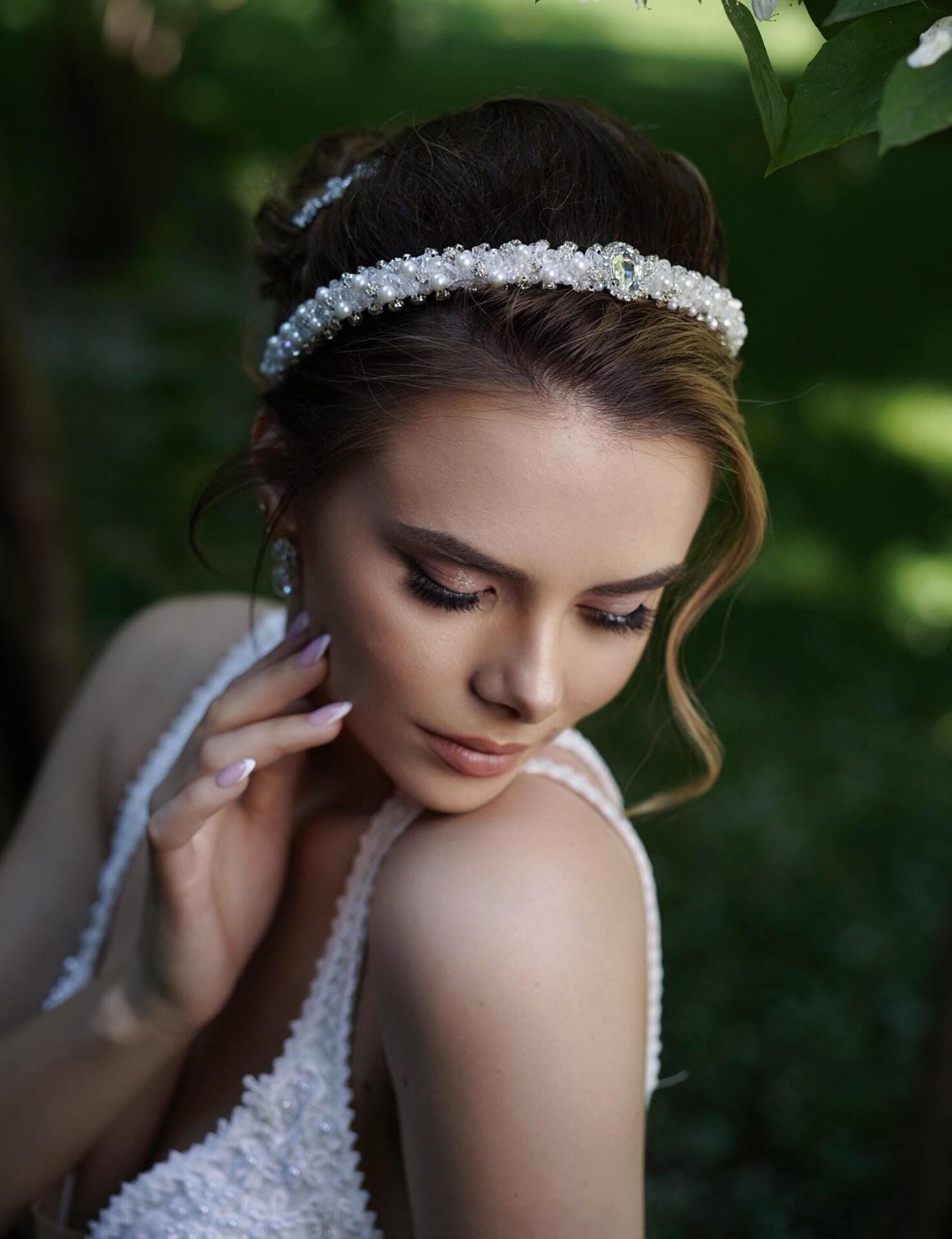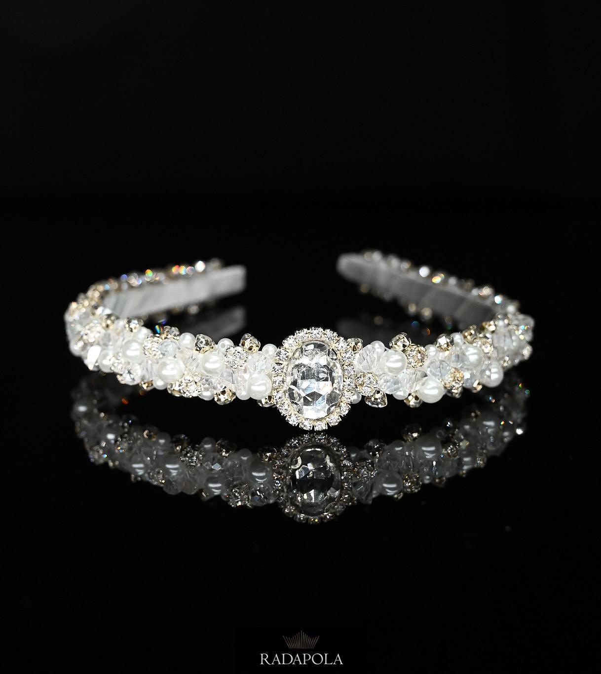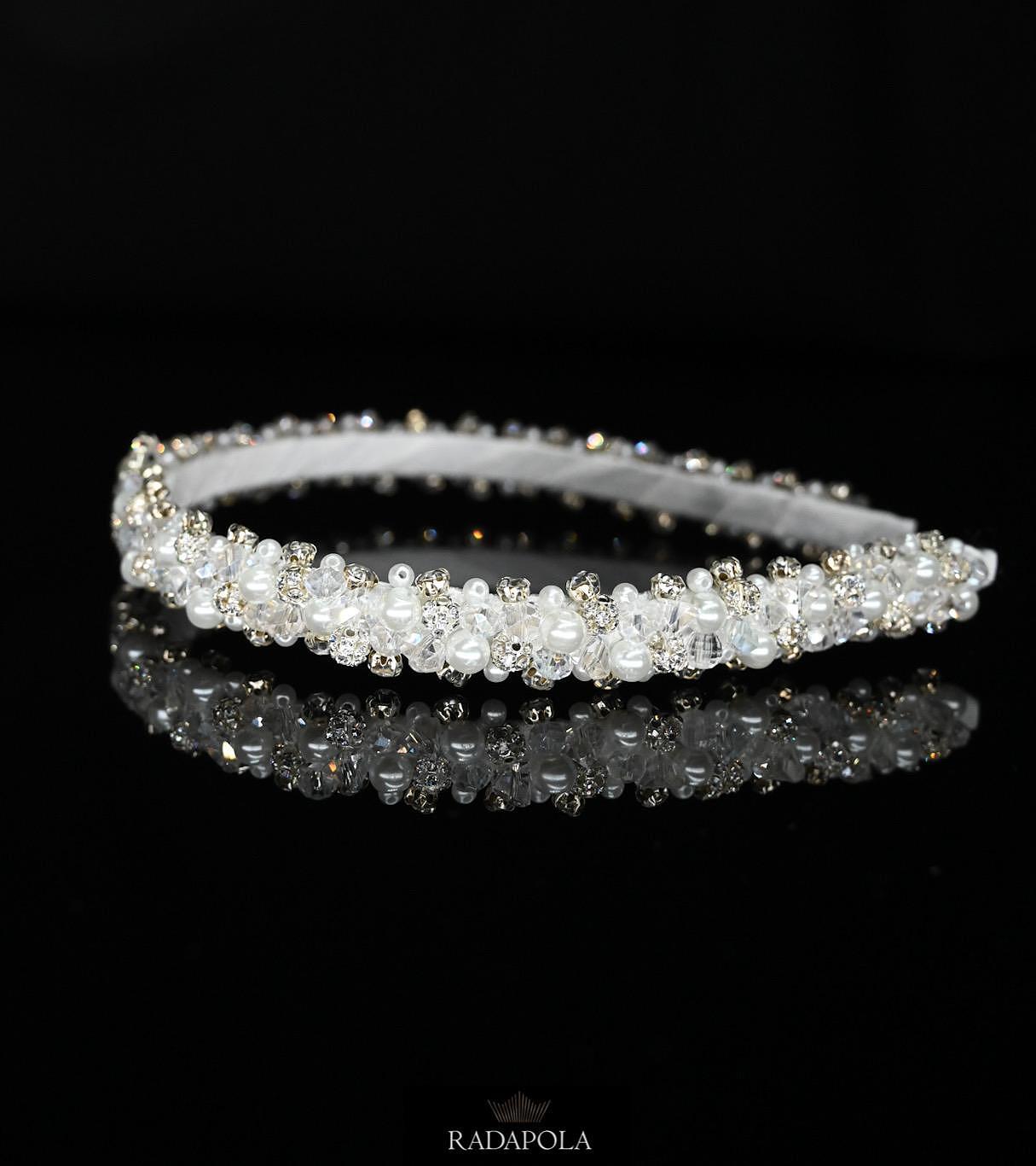 Тънка, нежна диадема с чудно сияйни перли и кристали. Широка около 2 см (без кристала). Подходяща за вашият сватбен ден както и за други официални събития и визии. Лека, удобна и практична. Можете да съчетаете аксесоара както с пусната коса, така и с прибрана. Подходяща и за малки момиченца.