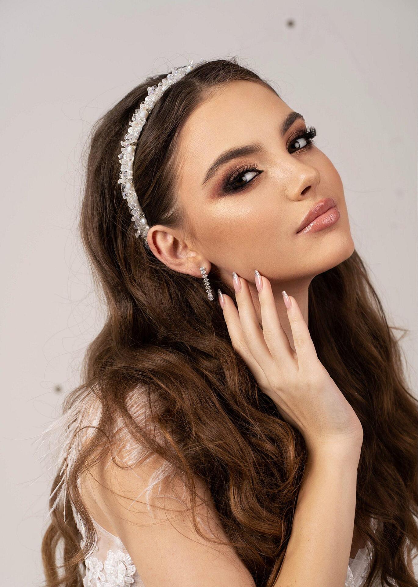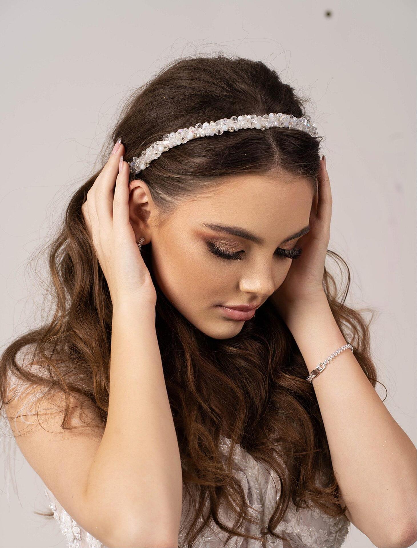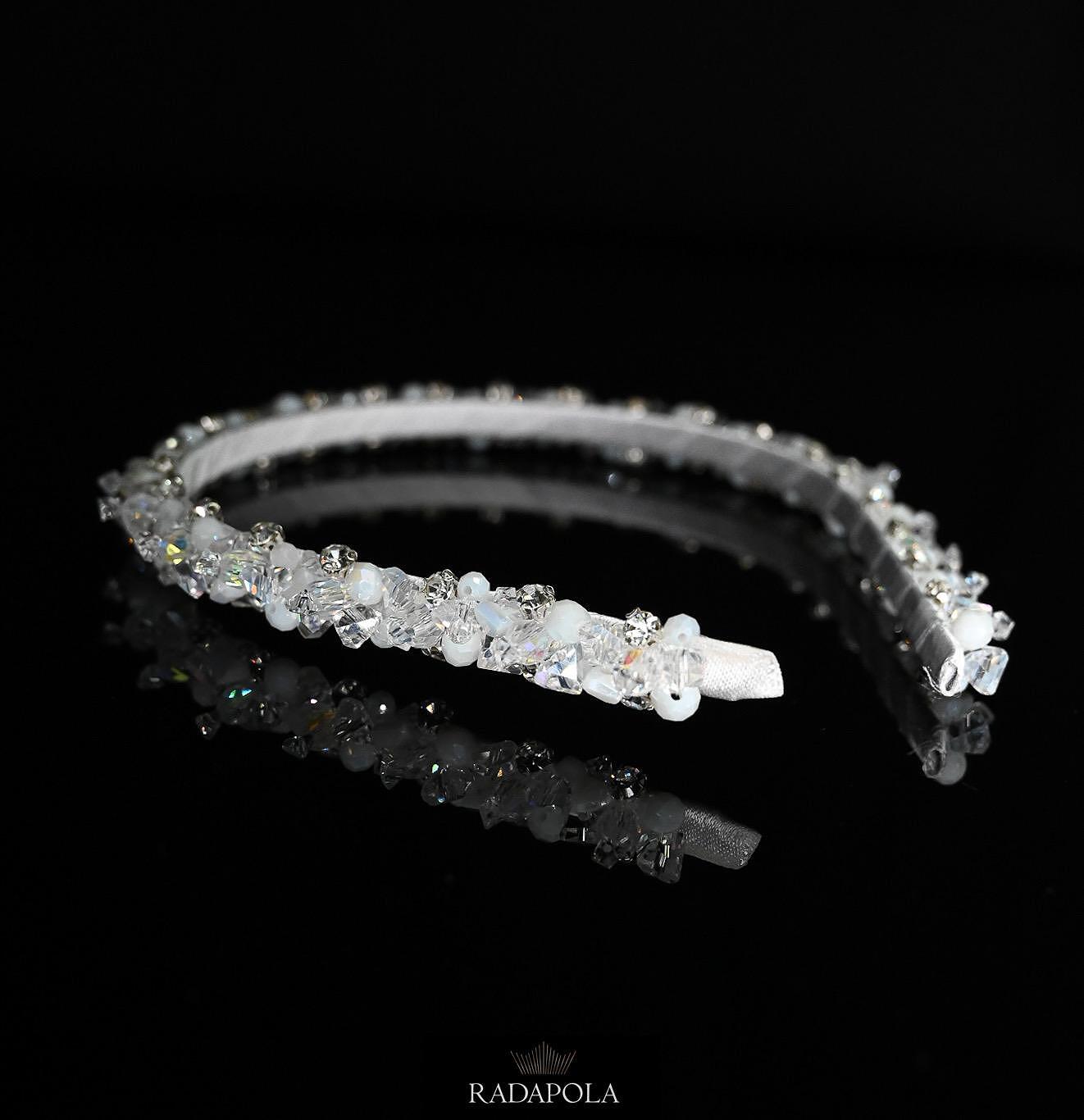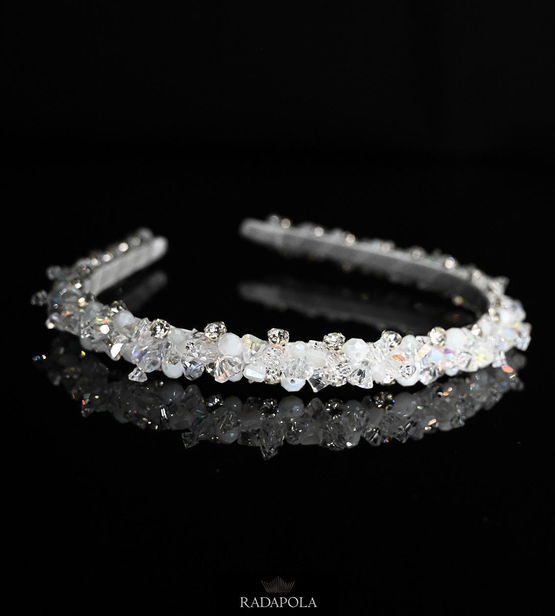 Тънка, нежна диадема с чудно сияйни мъниста и кристали. Широка 1,2 см. Подходяща за вашият сватбен ден както и за други официални събития и визии. Лека, удобна и практична. Можете да съчетаете аксесоара както с пусната коса, така и с прибрана