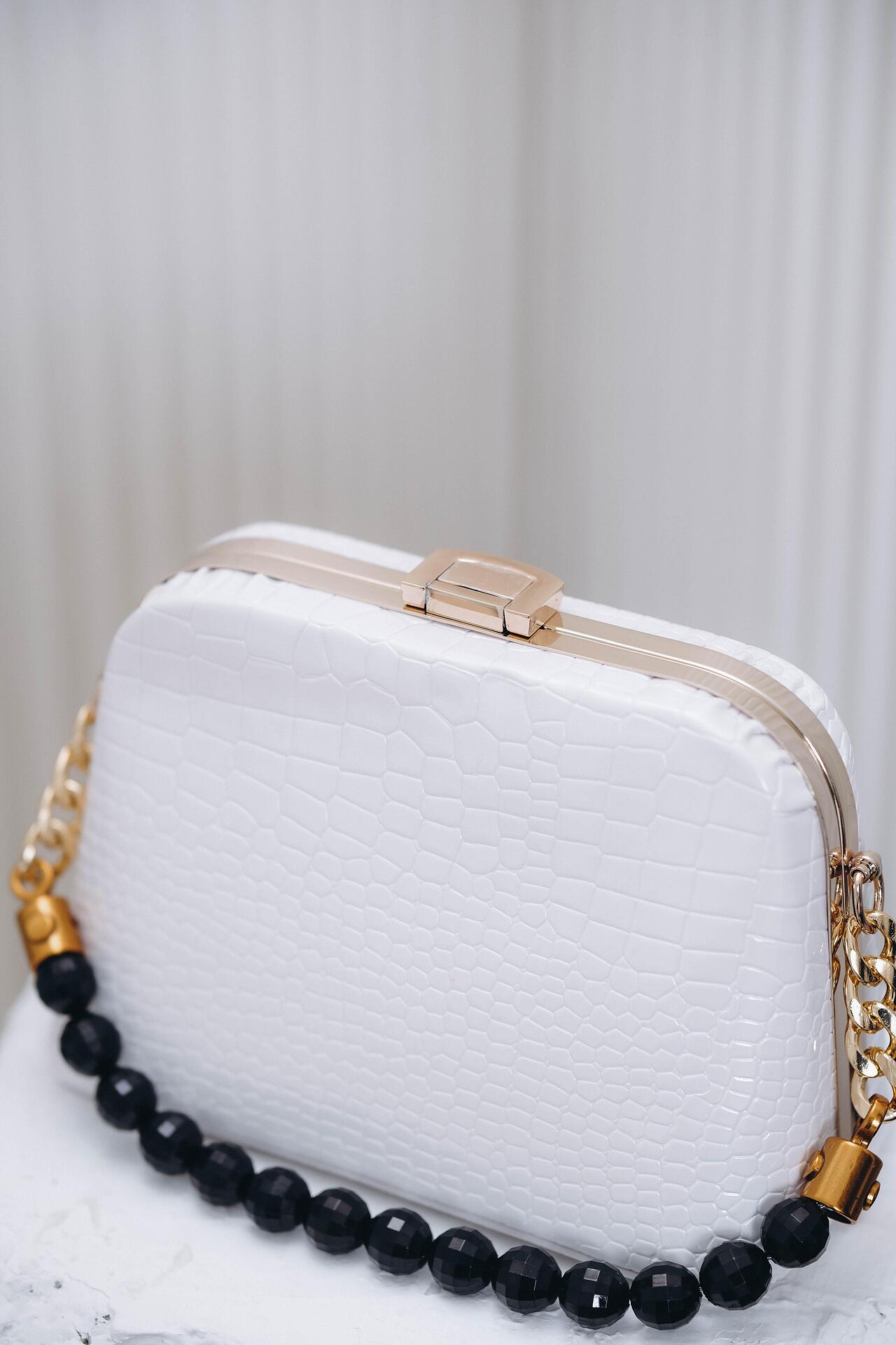 Изискана и стилна чанта. Белият крокодилски релеф придава луксозен вид, а контрастът с черните мъниста добавя модерна визия. Удобна за носене на най-необходимите вещи.