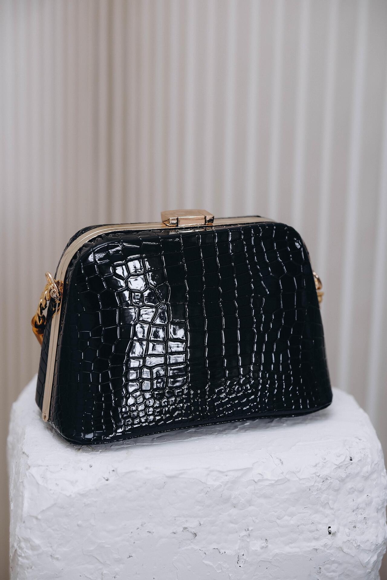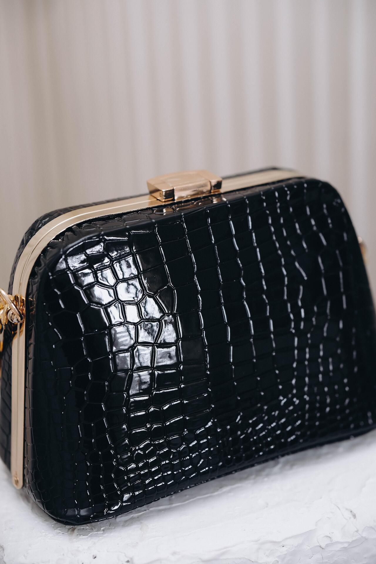Изискана и стилна чанта. Черният крокодилски релеф придава луксозен вид, а контрастът с черните мъниста добавя модерна визия. Удобна за носене на най-необходимите вещи.