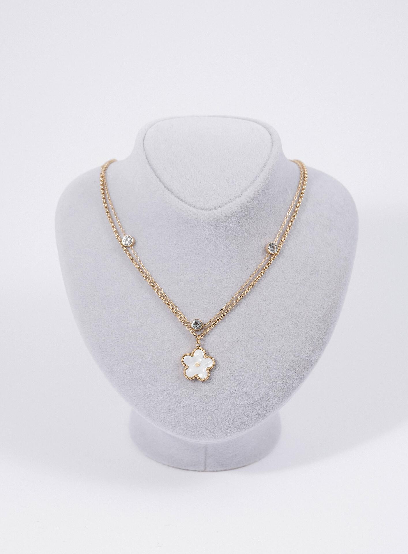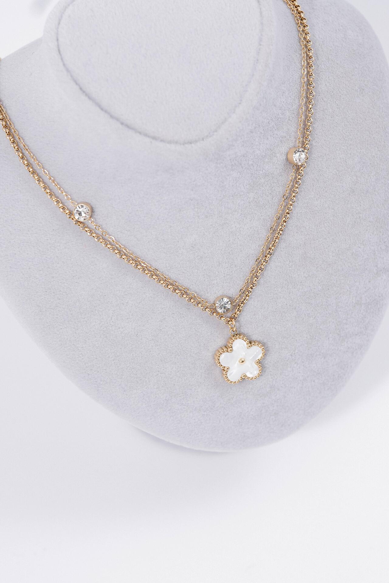 Колието е с два реда, които деликатно се преплитат и създават впечатляващ визуален ефект. Първият ред е украсен с малки блестящи кристали, които придават фин блясък и излъчване, докато вторият ред завършва с висулка във формата на цвете със съдефен цвят.