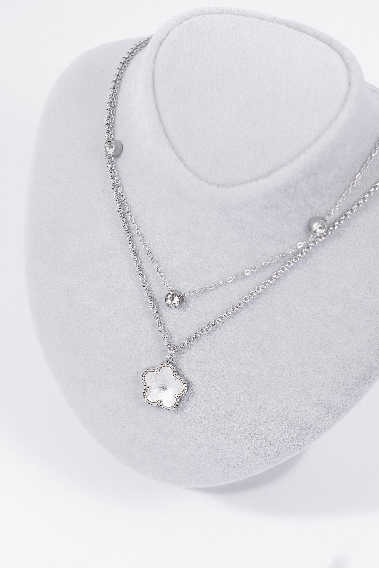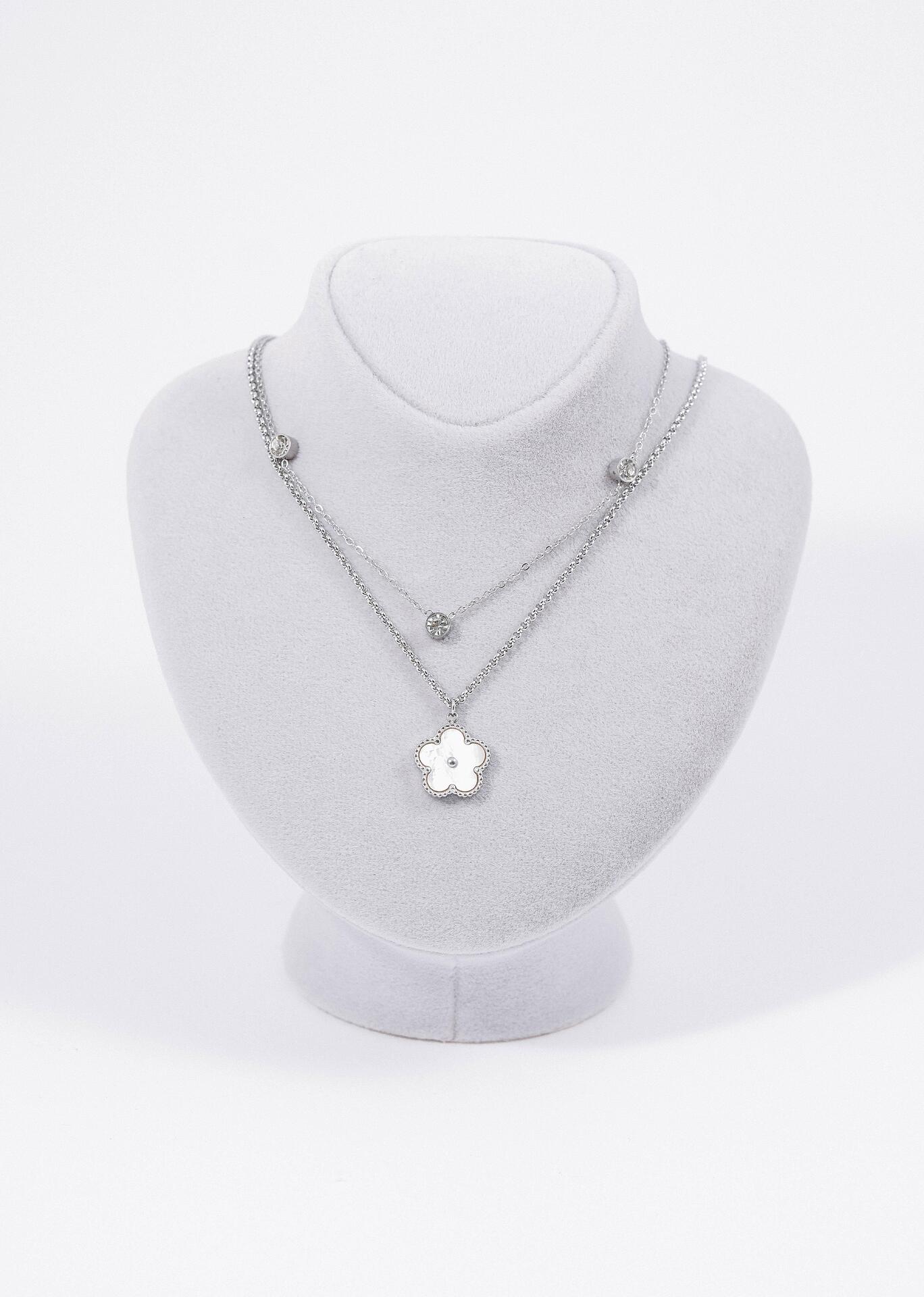 Колието е с два реда, които деликатно се преплитат и създават впечатляващ визуален ефект. Първият ред е украсен с малки блестящи кристали, които придават фин блясък и излъчване, докато вторият ред завършва с висулка във формата на цвете със съдефен цвят.