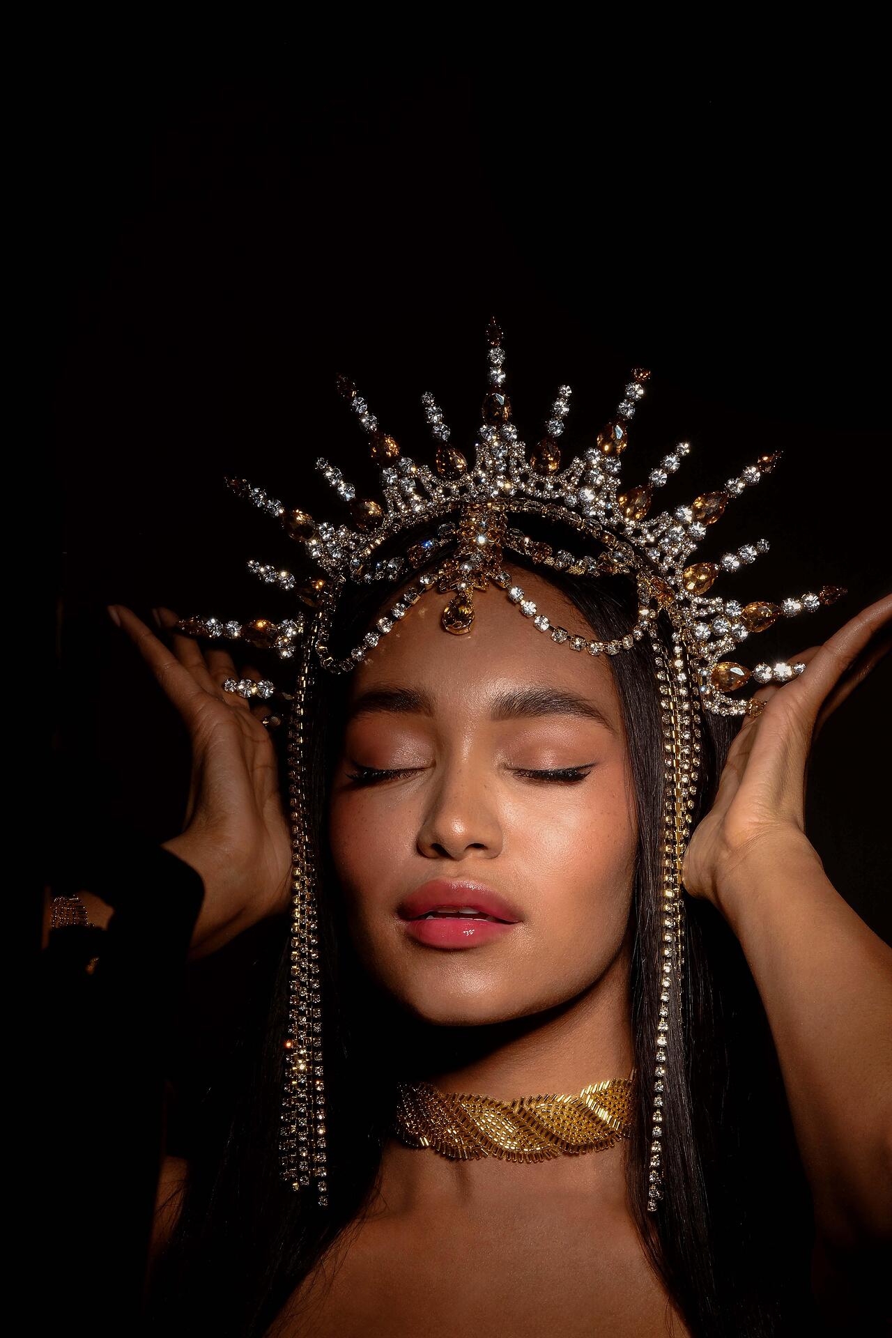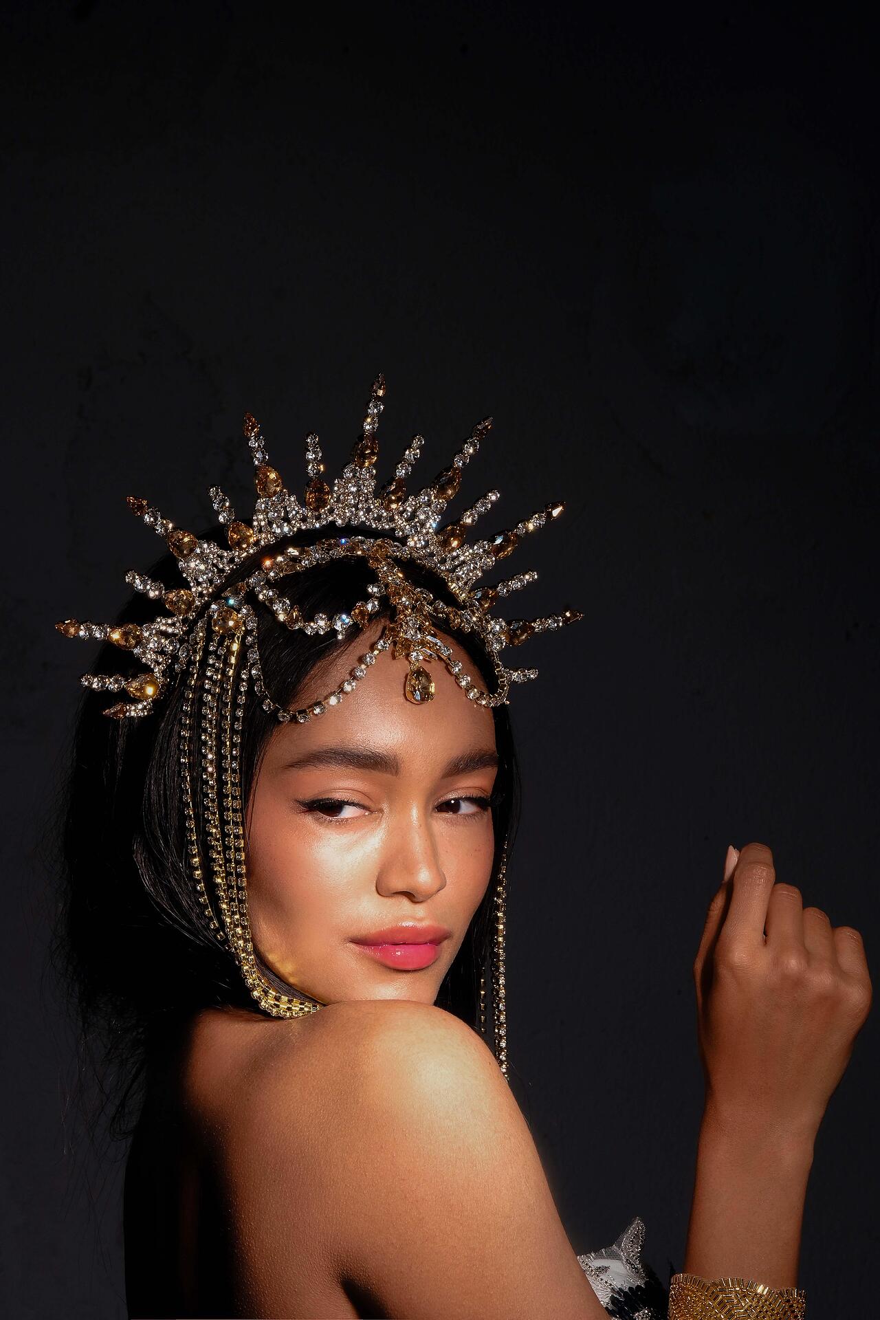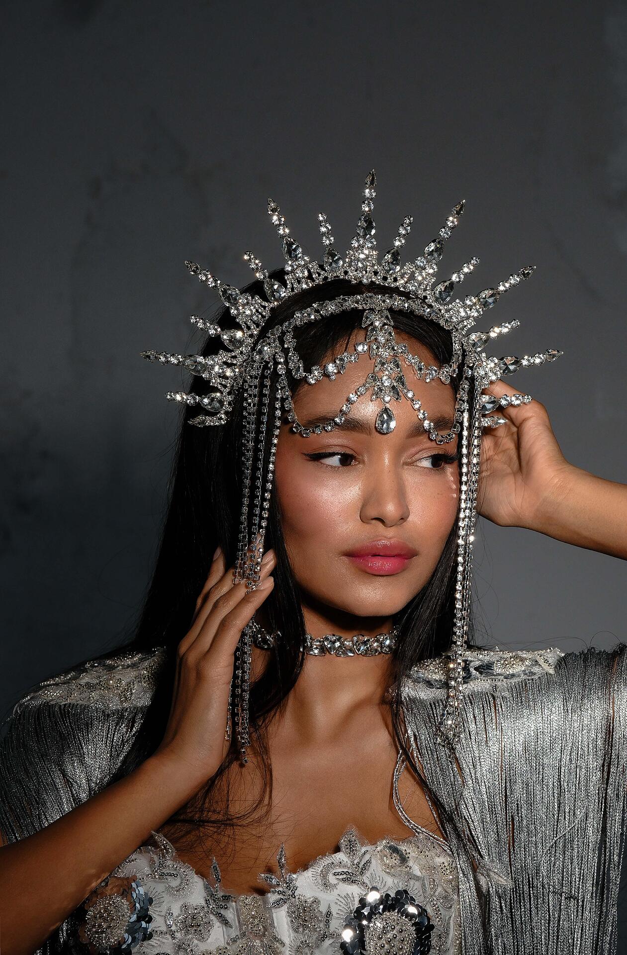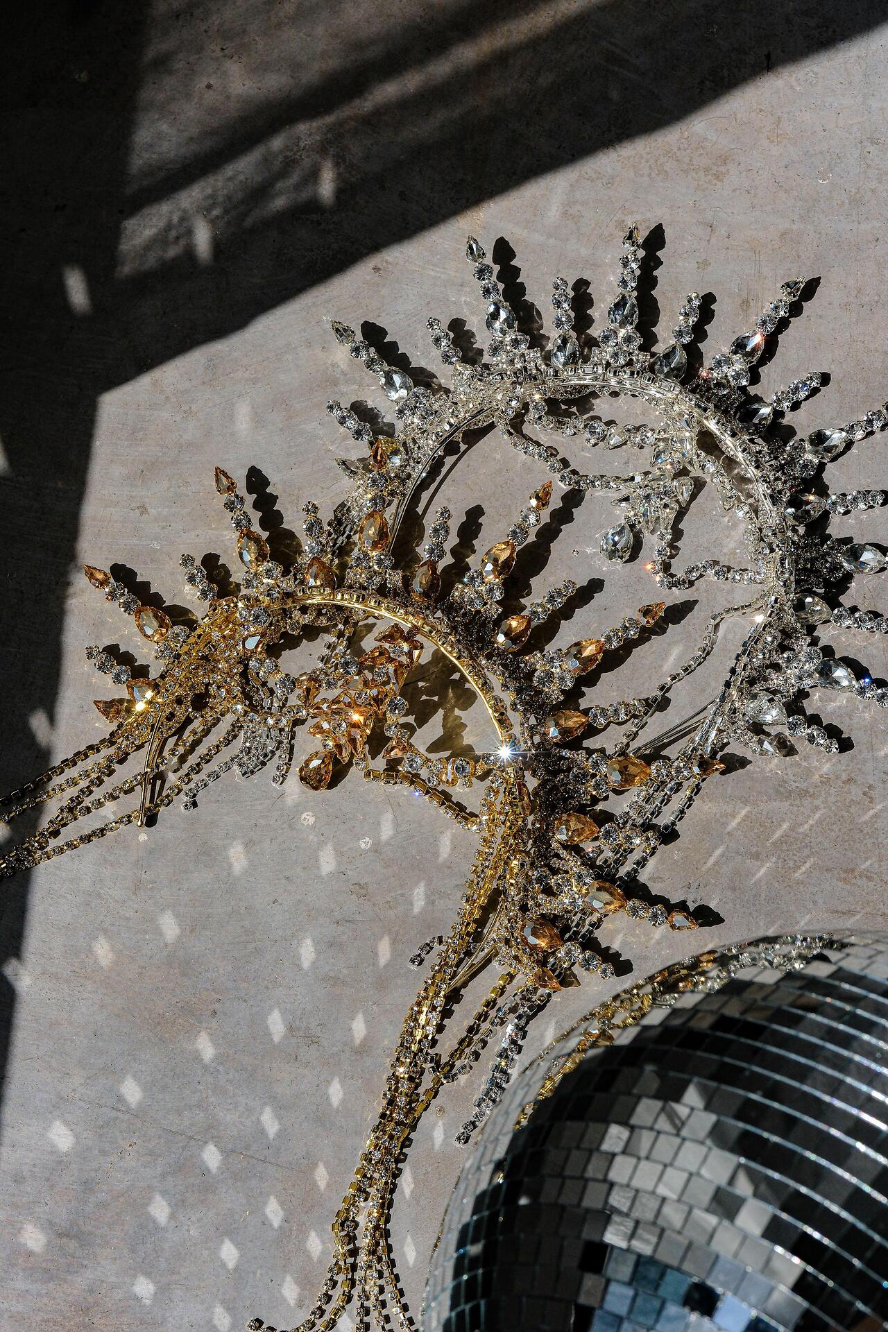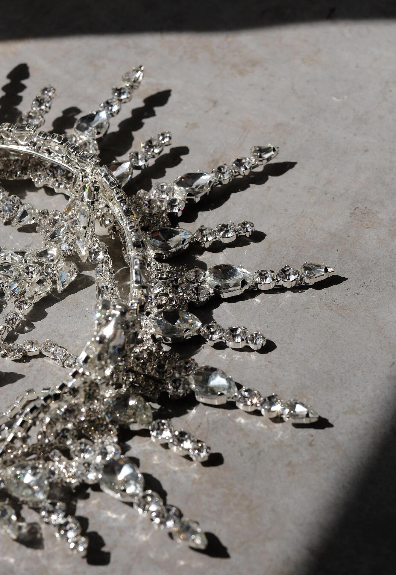 Сценичен аксесоар тип корона, който се поставя на главата като диадема и стои стабилно. Изцяло ръчна изработка с бляскави кристали.