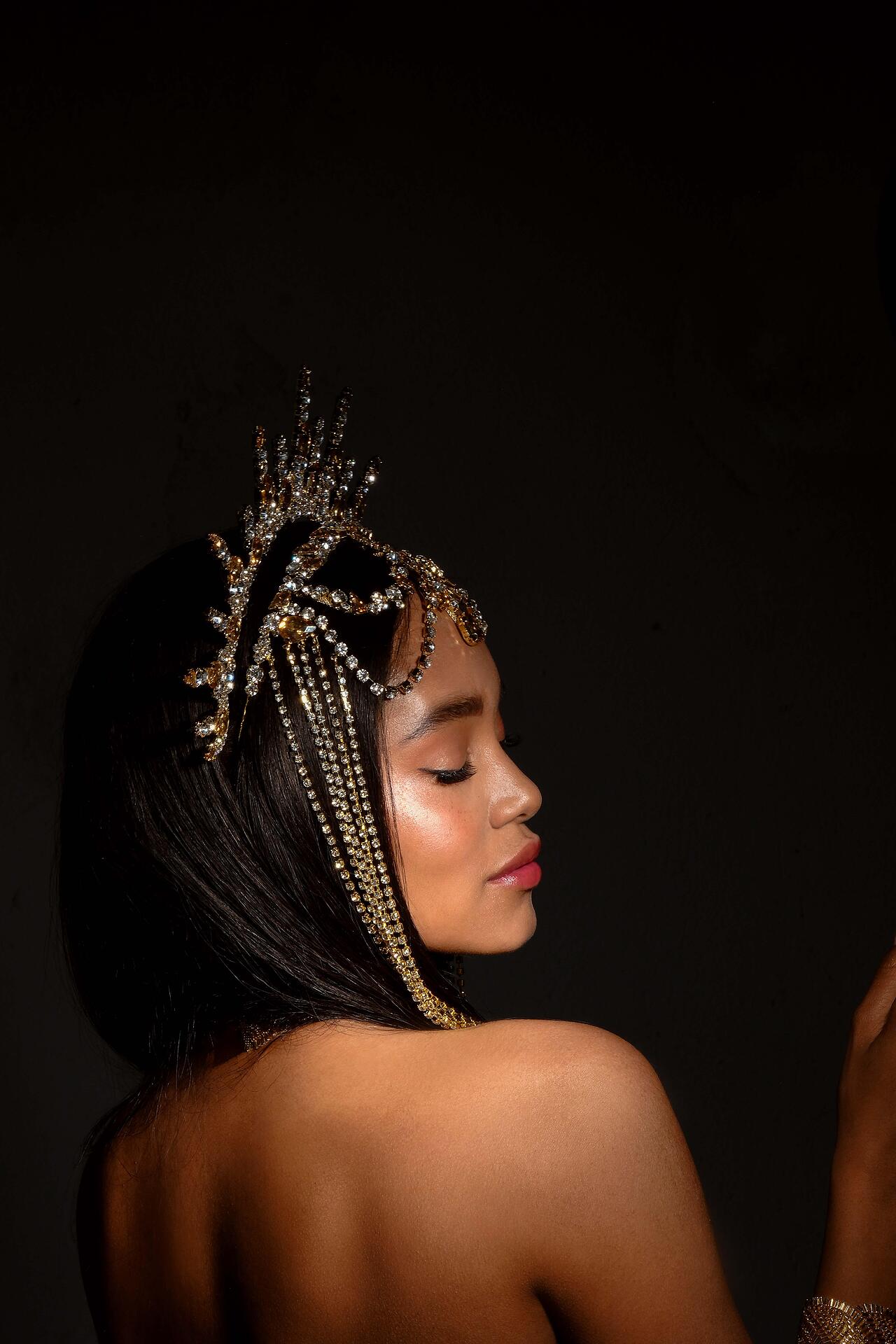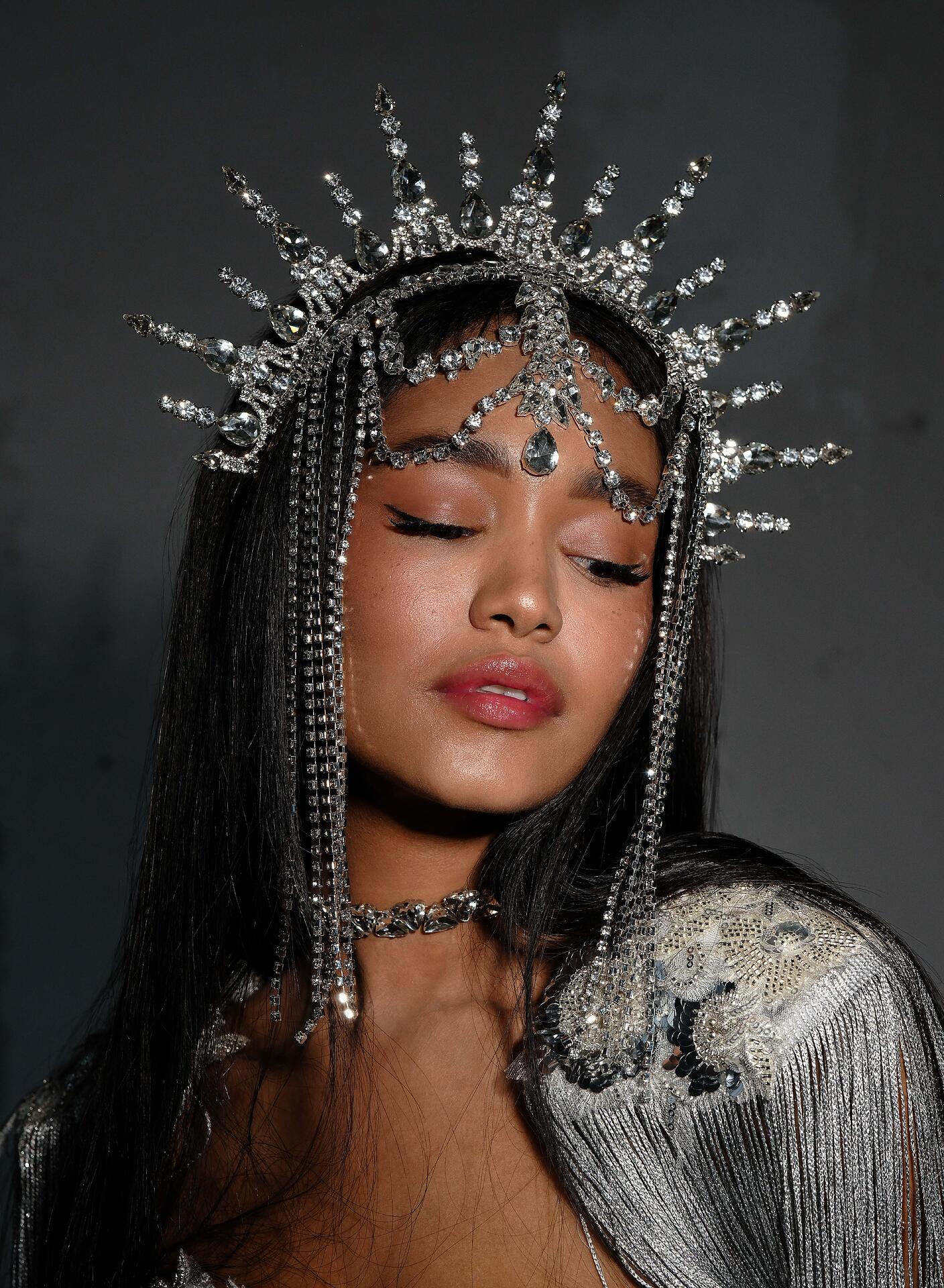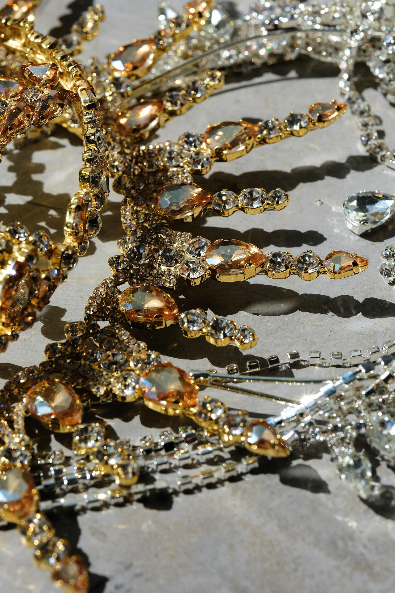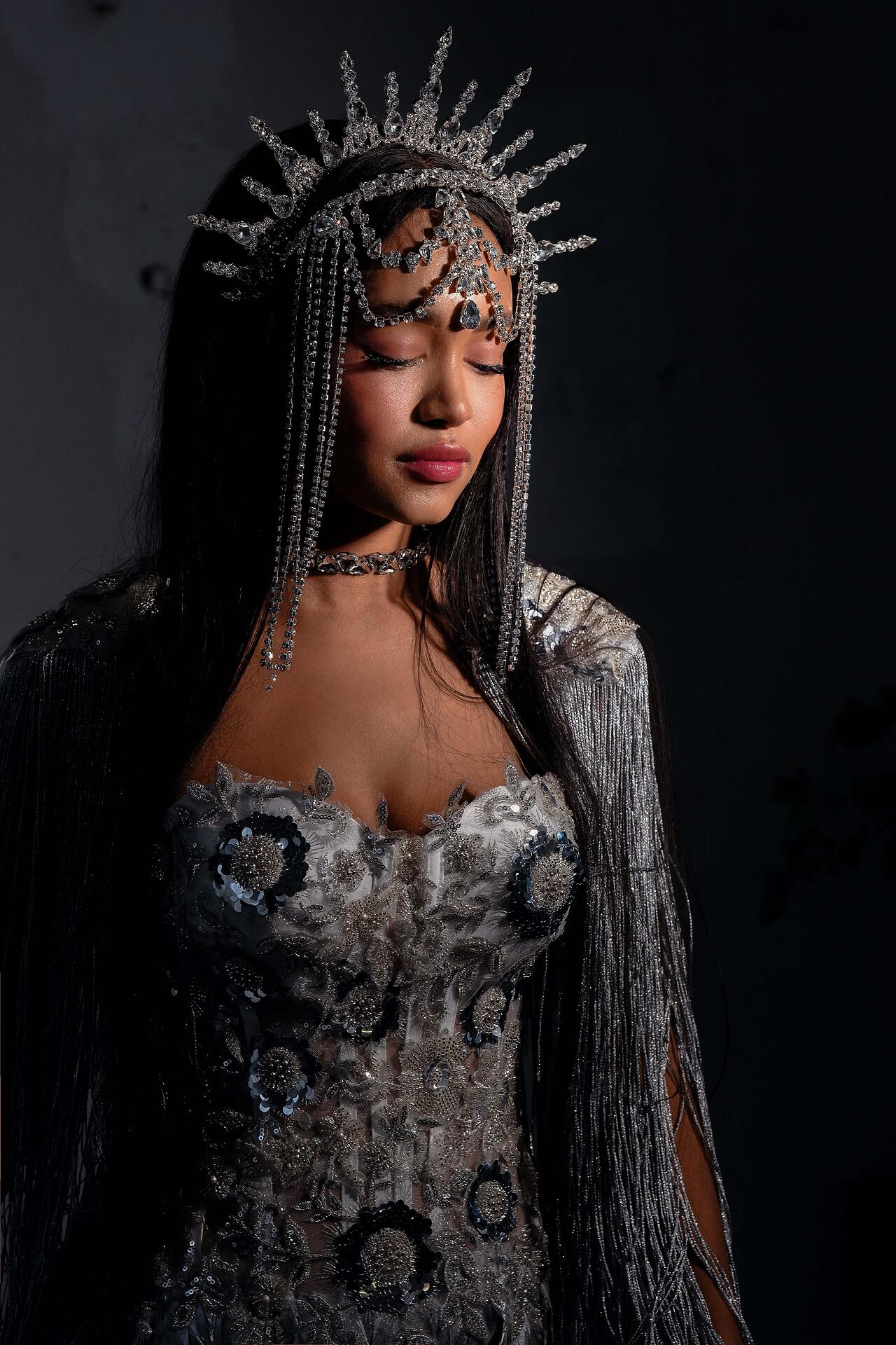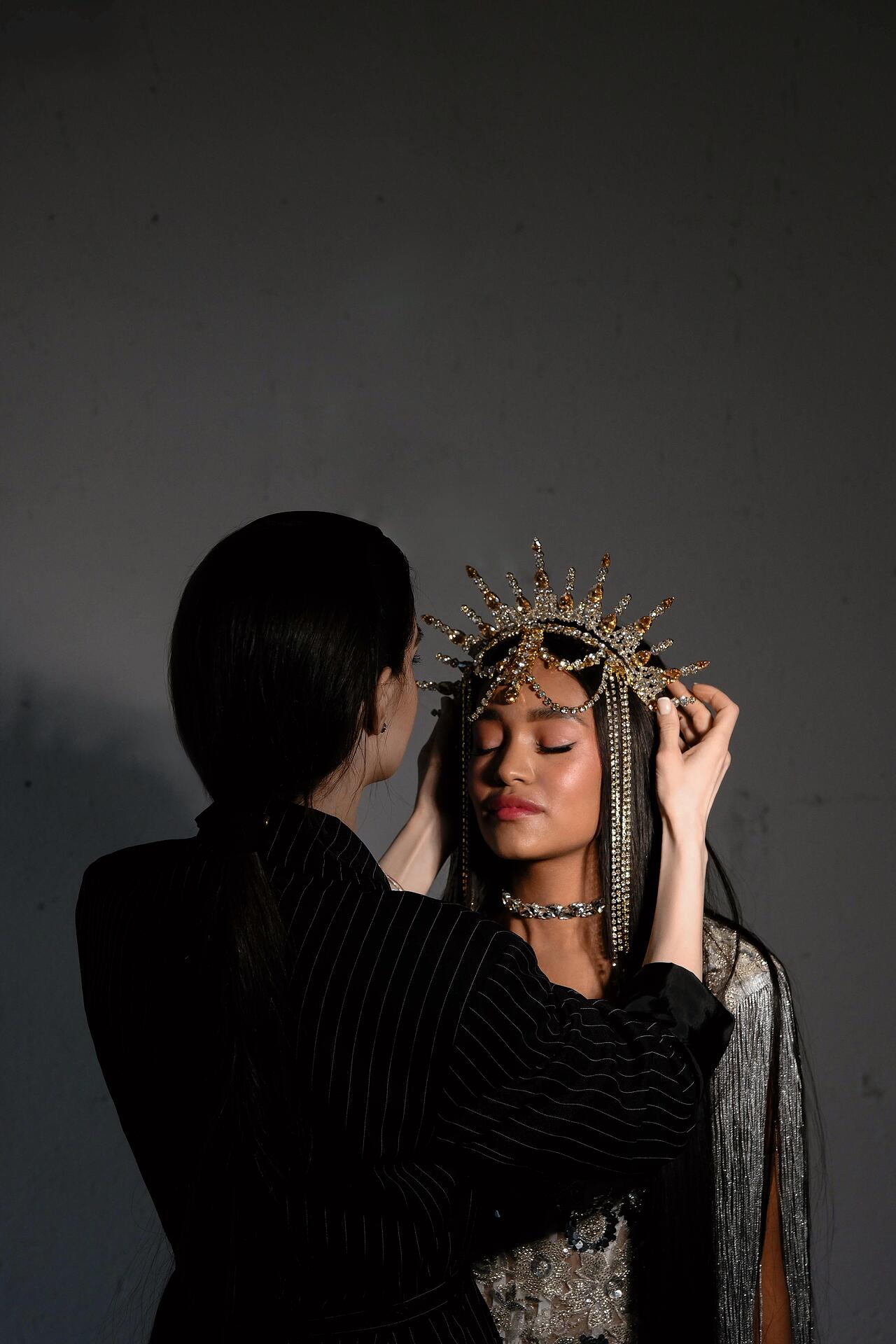 Сценичен аксесоар тип корона, който се поставя на главата като диадема и стои стабилно. Изцяло ръчна изработка с бляскави кристали.