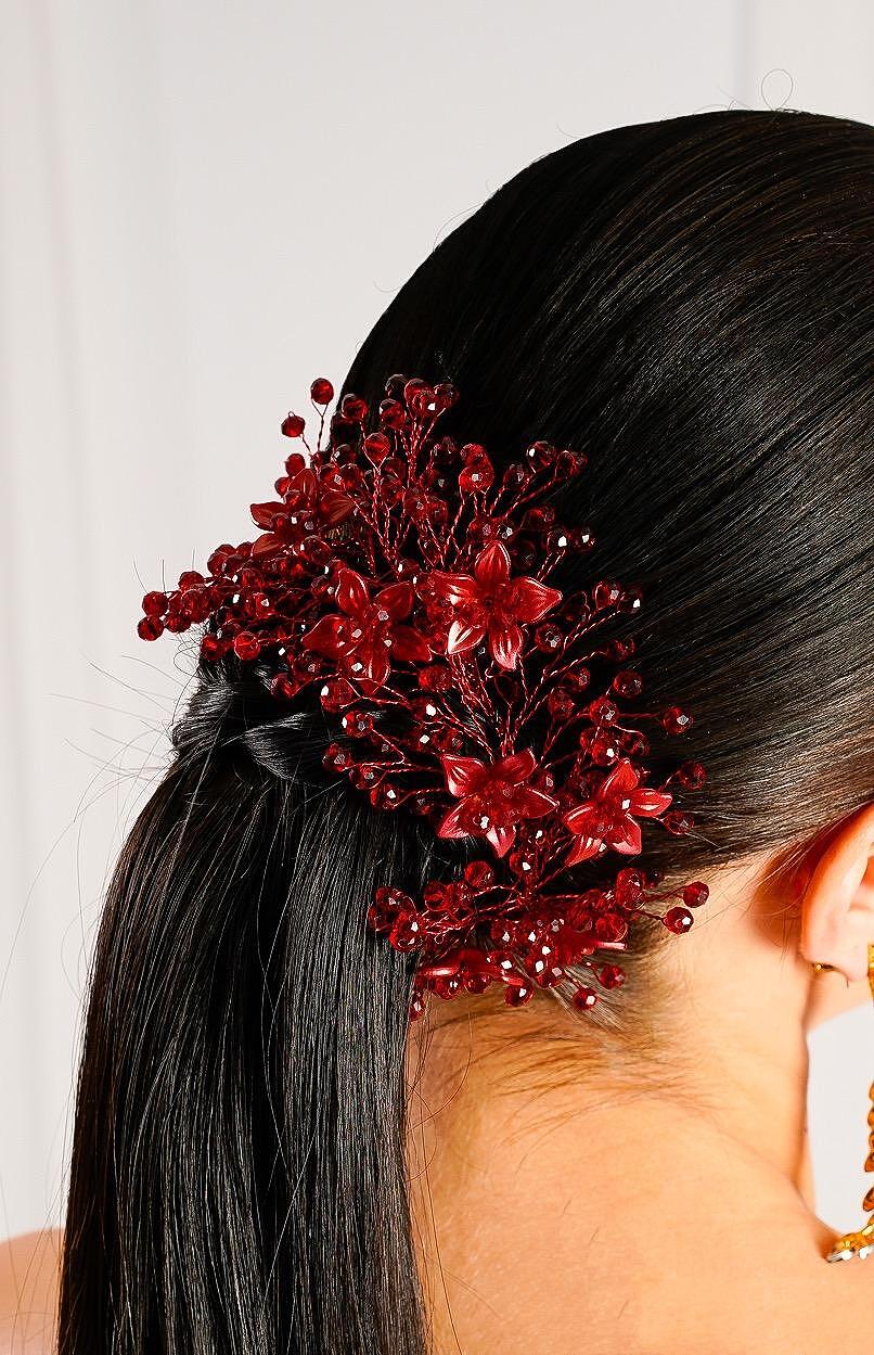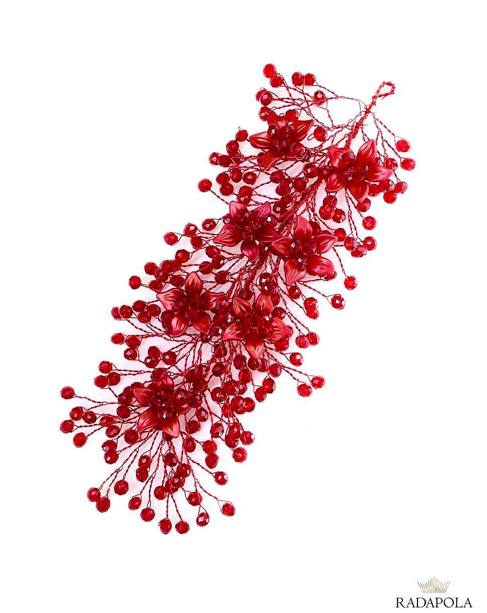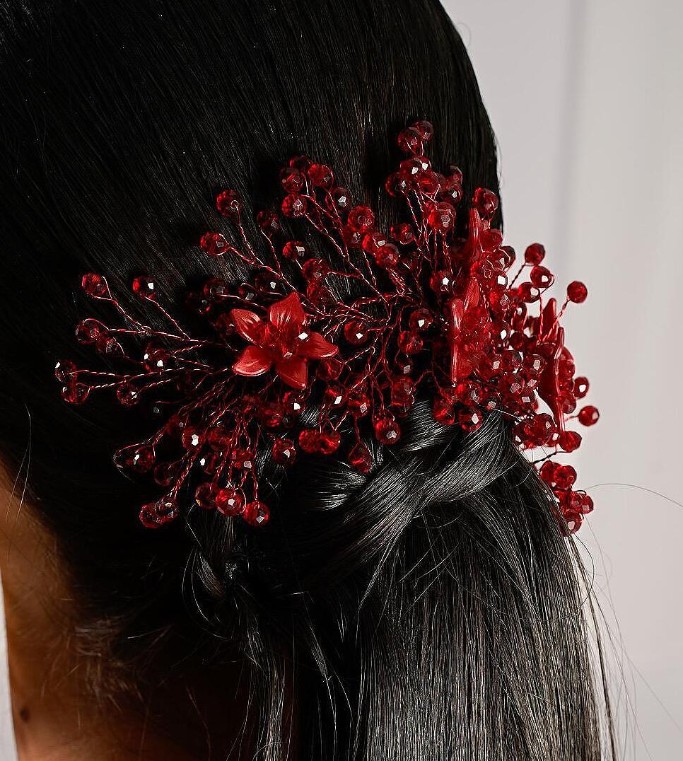 Нежен аксесоар с червени мъниста. Можете да съчетаете аксесоара идеално към прибрана коса. Прекрасен завършек към вашата прическа. Изработена е от висококачествени материали.
