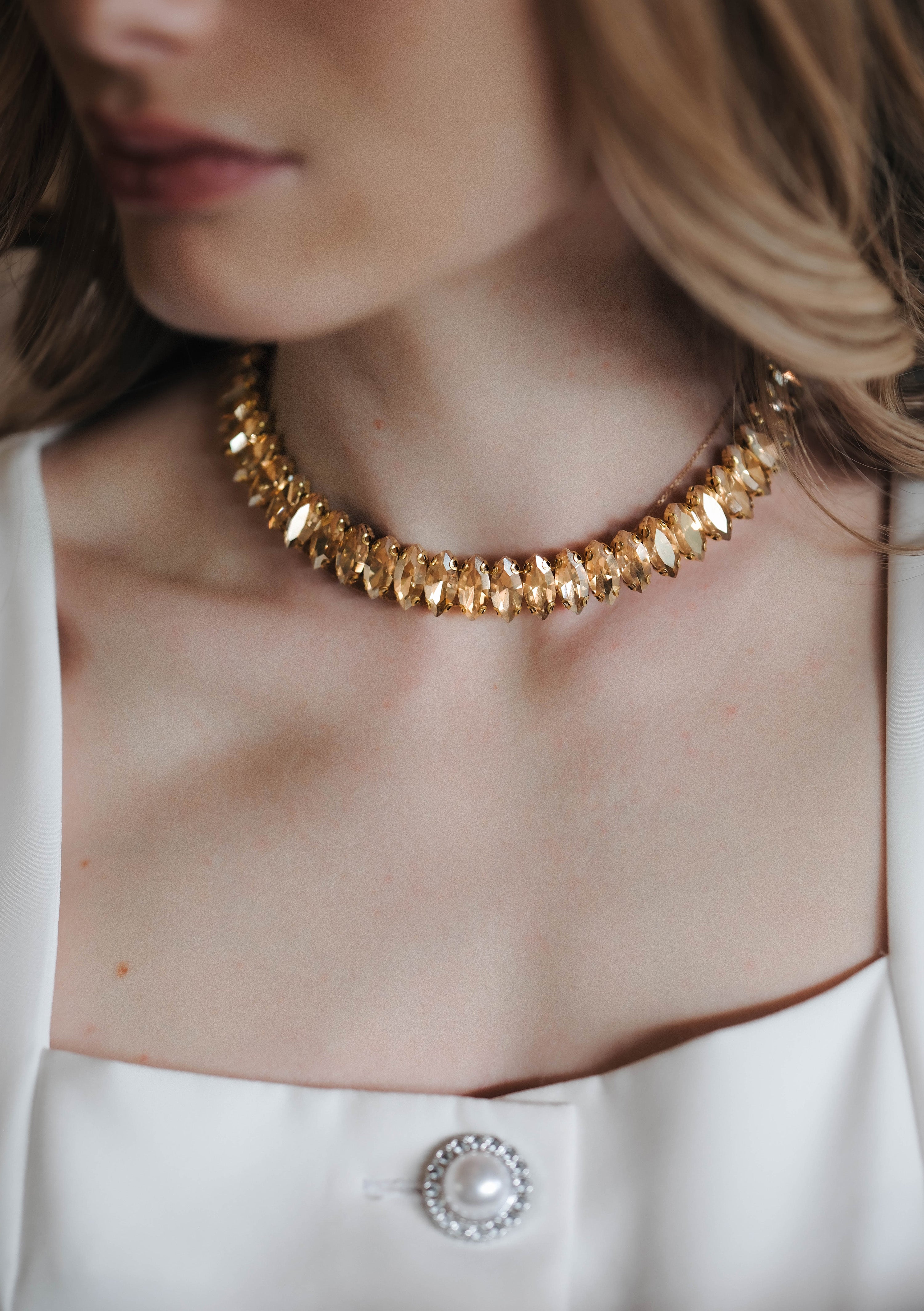 Невероятен нежен чокър, с ръчно подредени кристали. Използвани са висококачествени материали. Кристалите, прецизно наредени по цялата дължина на колието, отразяват светлината и придават ослепителен блясък.