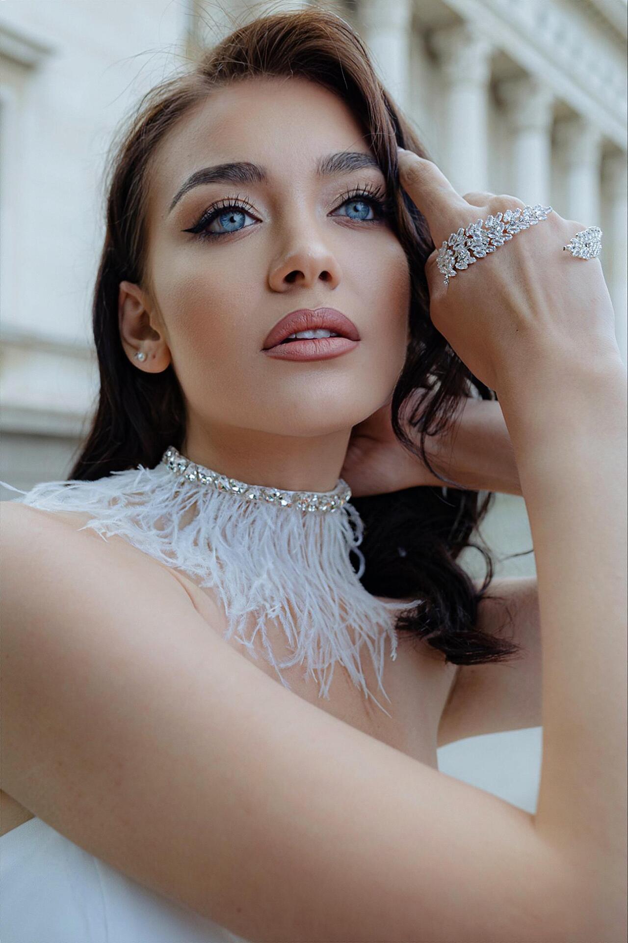 Луксозно колие, което е ръчно нашито изработено с щраусови пера и кристали. Използвани са висококачествени материали. Аксесоарът е подходящ за официални и сценични визии. Закопчаването е с кукички и размера не може да се регулира (трябва да бъде изработен по ваш размер ако не ви стане).