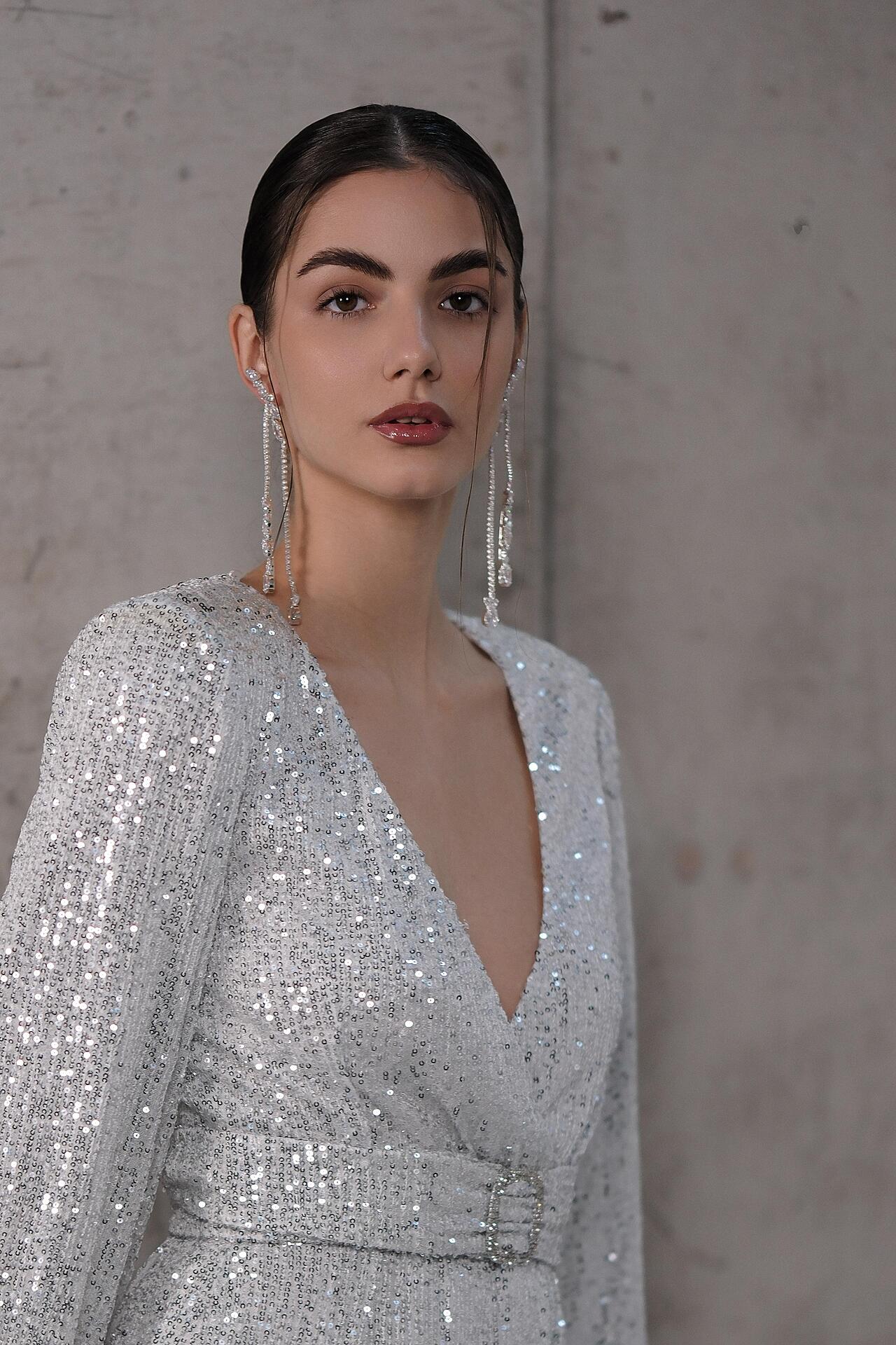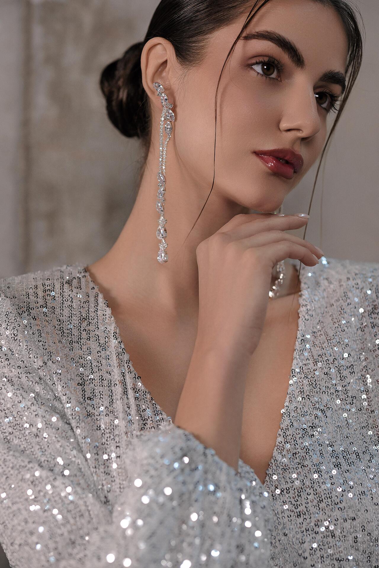 Тези елегантни обеци са създадени да подчертаят вашата визия с изящния си дизайн. Дългият, падащ силует с вградени циркони осигурява изключителен блясък, който ще привлича всички погледи. Високо качество на изработка, със сребърно покритие. Леки и удобни за носене.