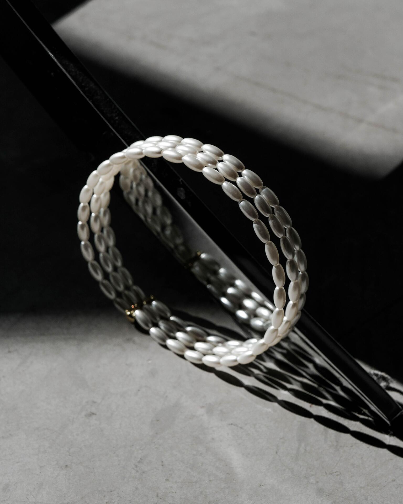 Ръчно направено колие на три реда с бели продълговати перли. Колието е с идеална дължина, която обгръща врата, подчертавайки деколтето. Закопчава се с магнитна закопчалка.