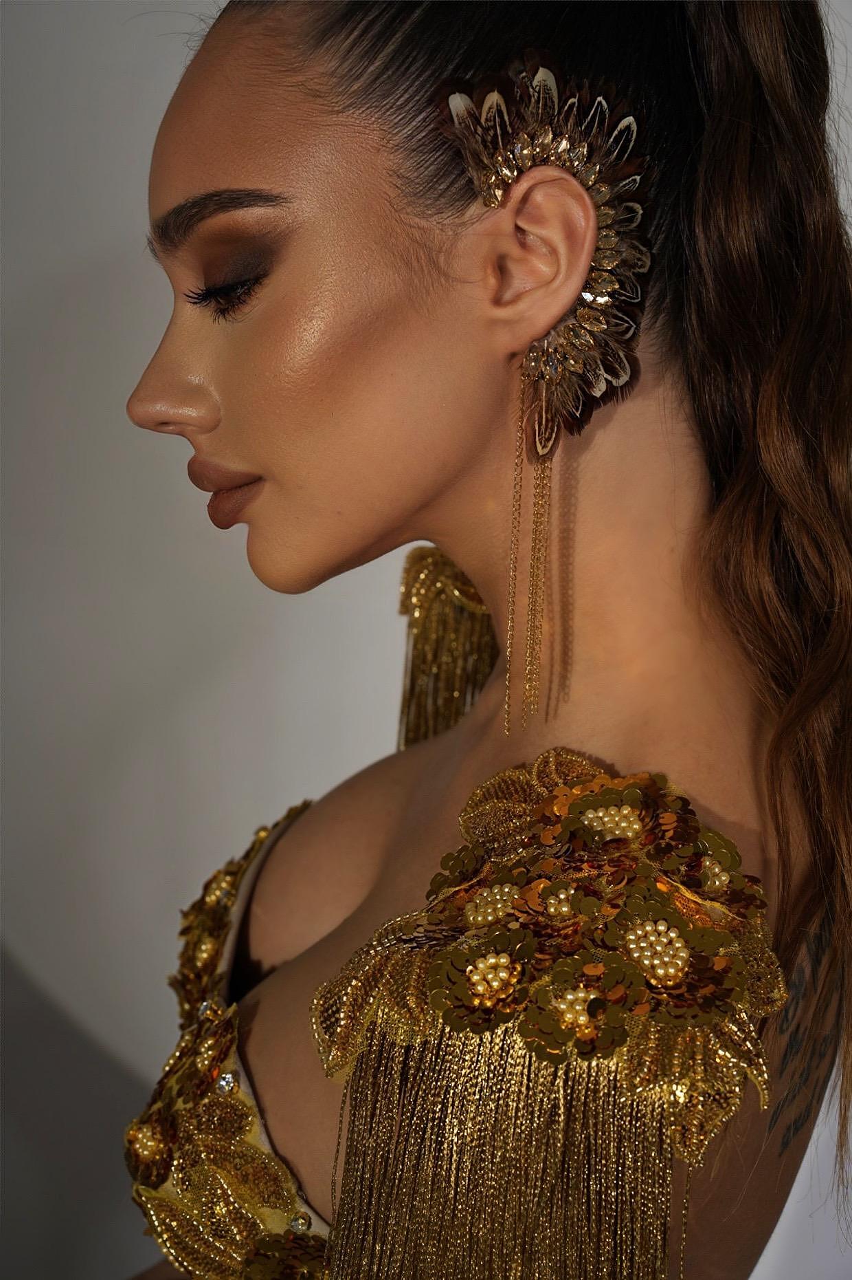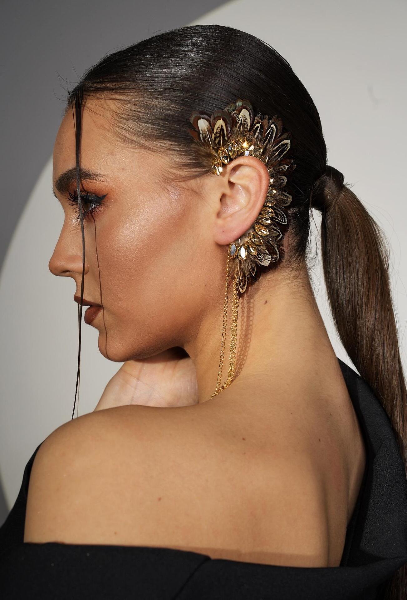 Невероятен аксесоар за ухо от естествени пера, кристали и верижки. Ръчно изработен от висококачествени материали. Подходящ за официални поводи.