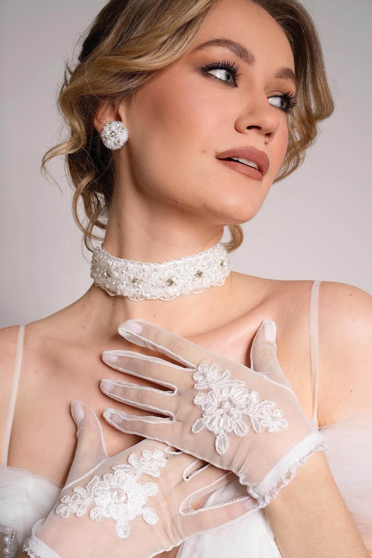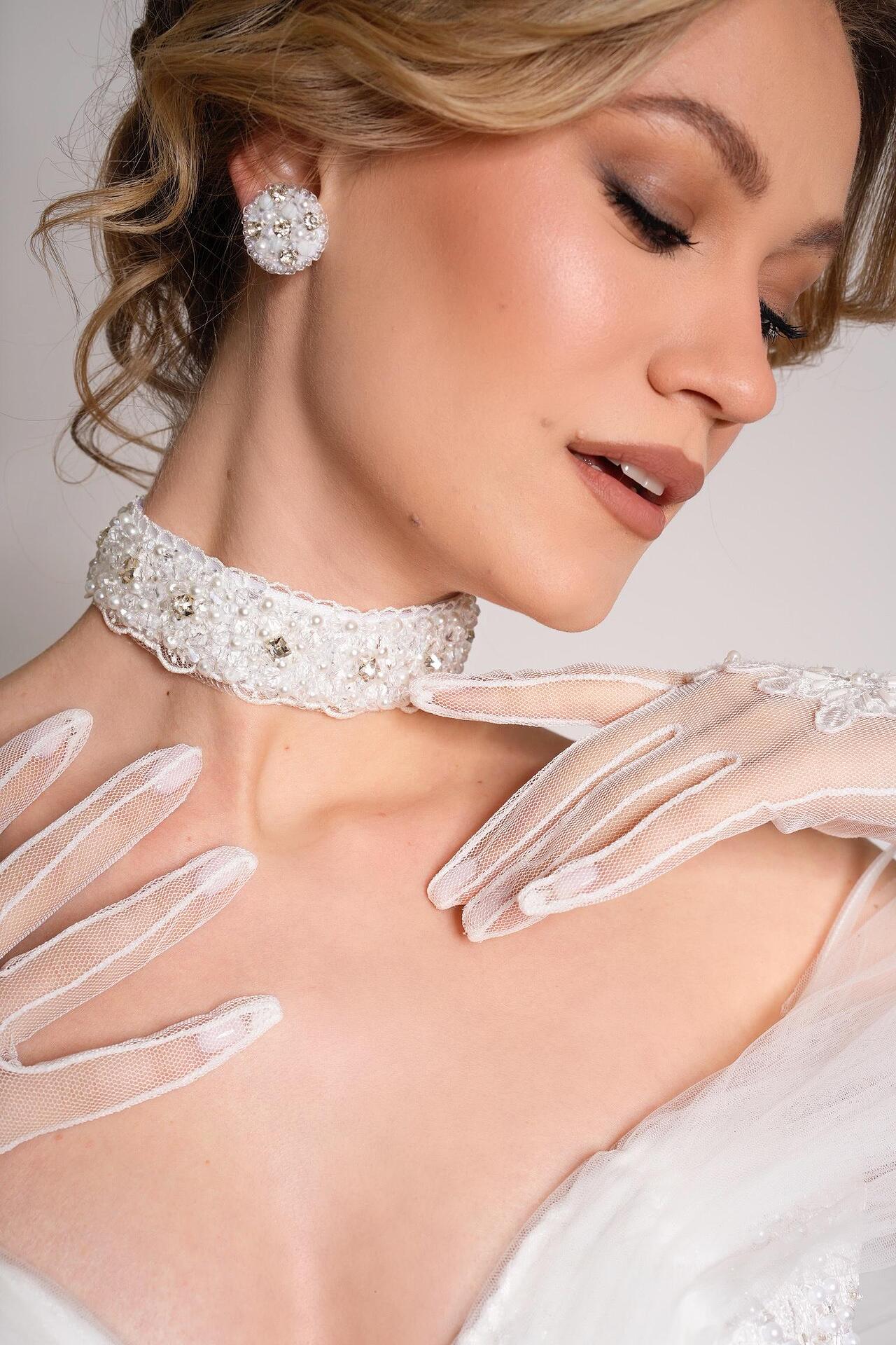 Луксозен чокър, който е ръчно нашит с бели и сребристи кристали и мъниста. По периферията има нежна дантела. Аксесоарът е подходящ за официални поводи. Закопчава се с кукички и размера не може да се регулира (трябва да бъде изработен по ваш размер ако не ви става).