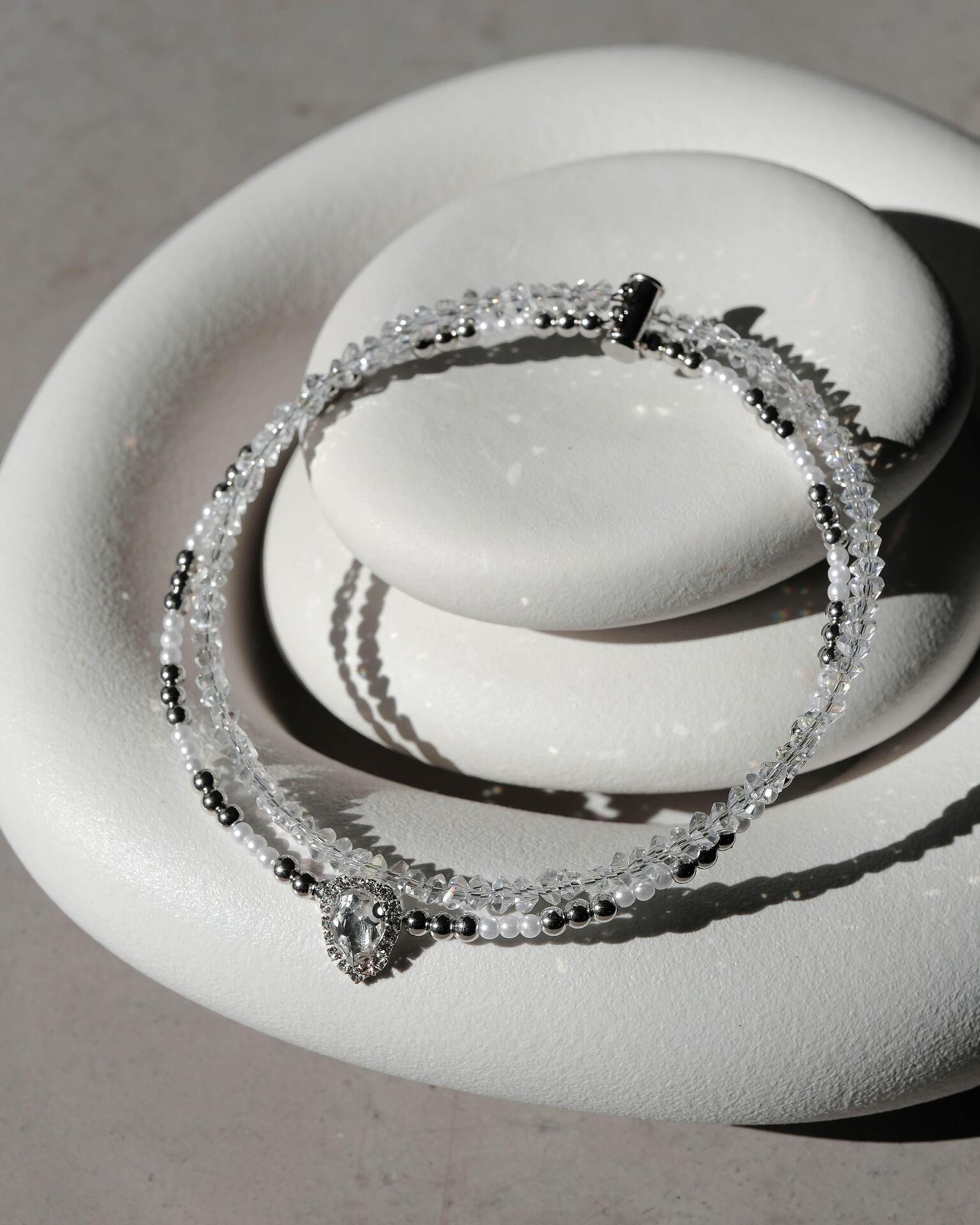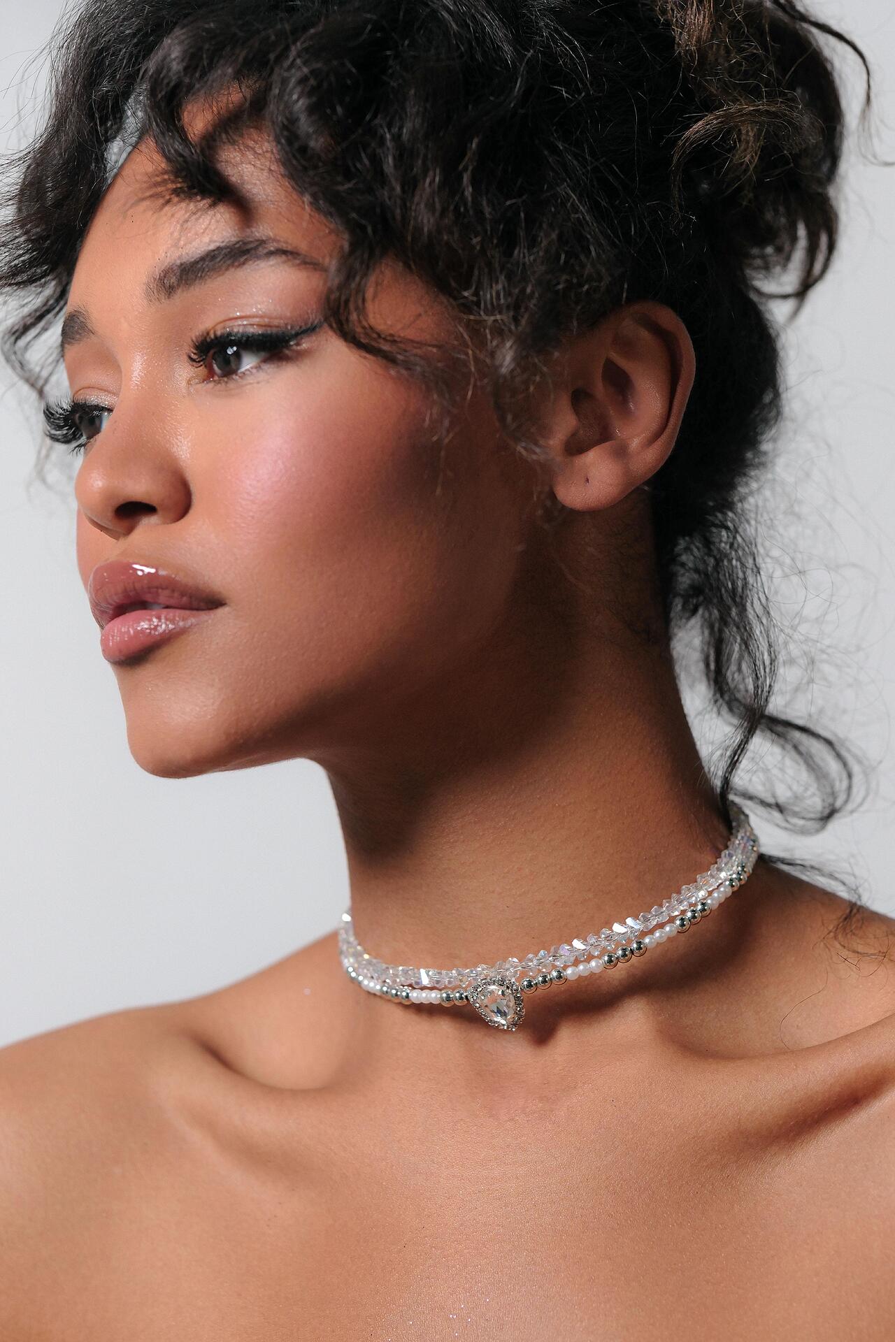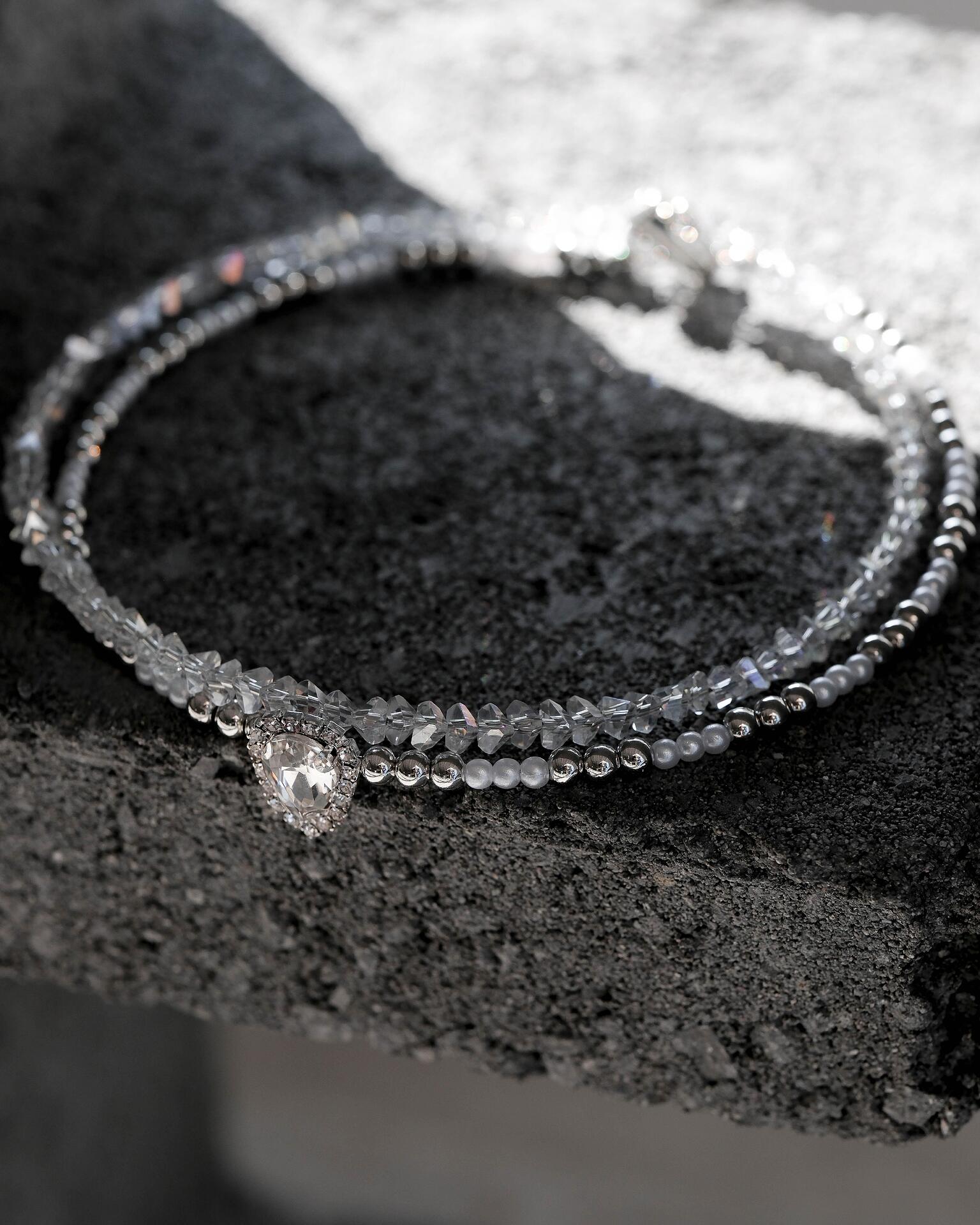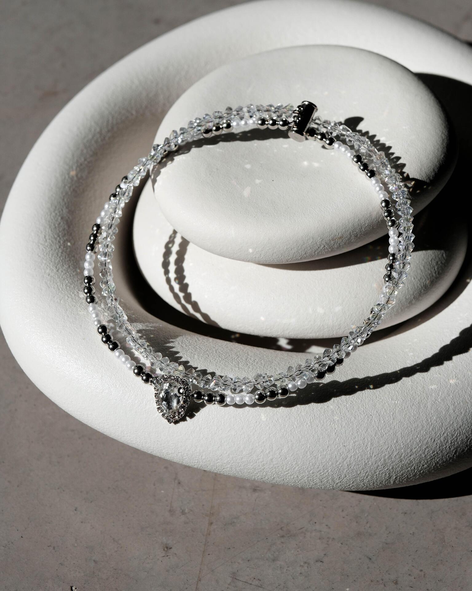 Колие от нанизани мъниста и детайл от обемен сребрист камък, което дъпълва вашата официална или ежедневна визия. С идеална дължина, която обгръща врата, подчертавайки деколтето.