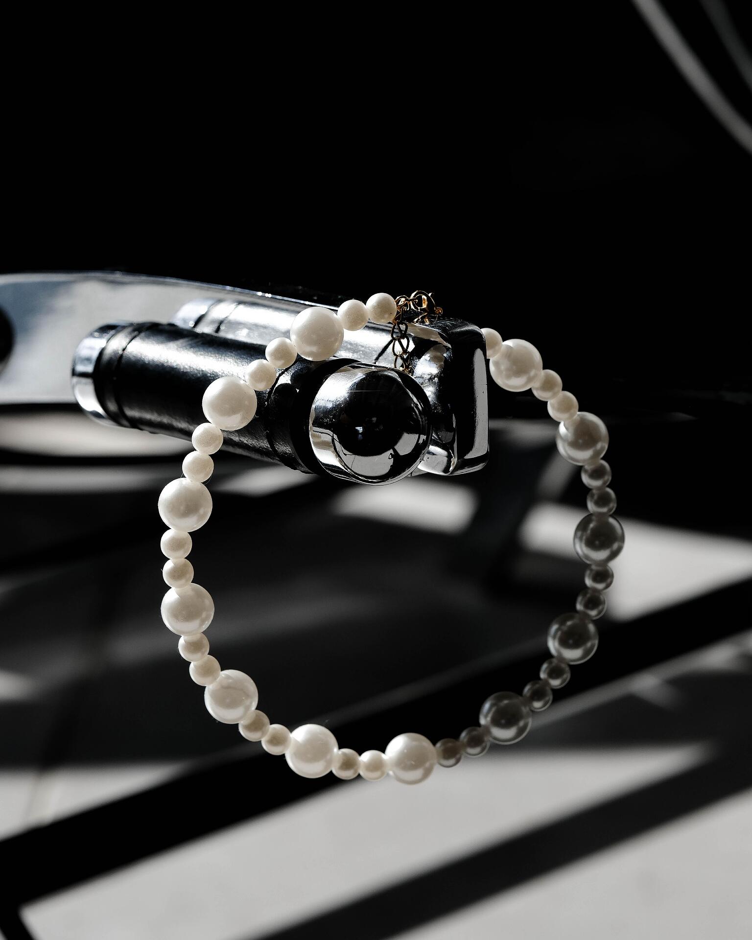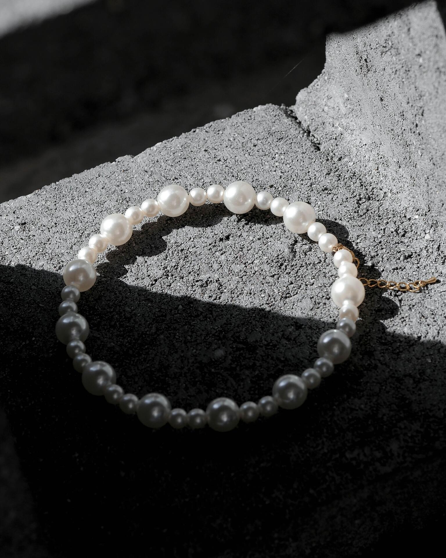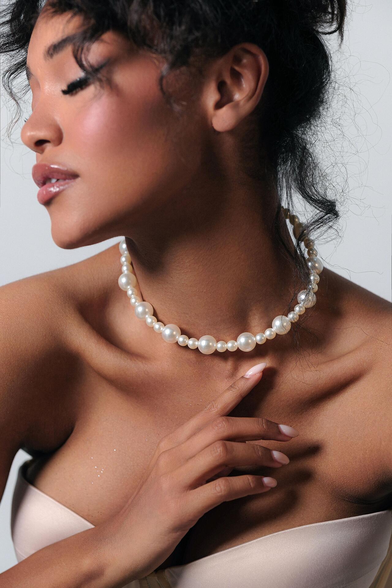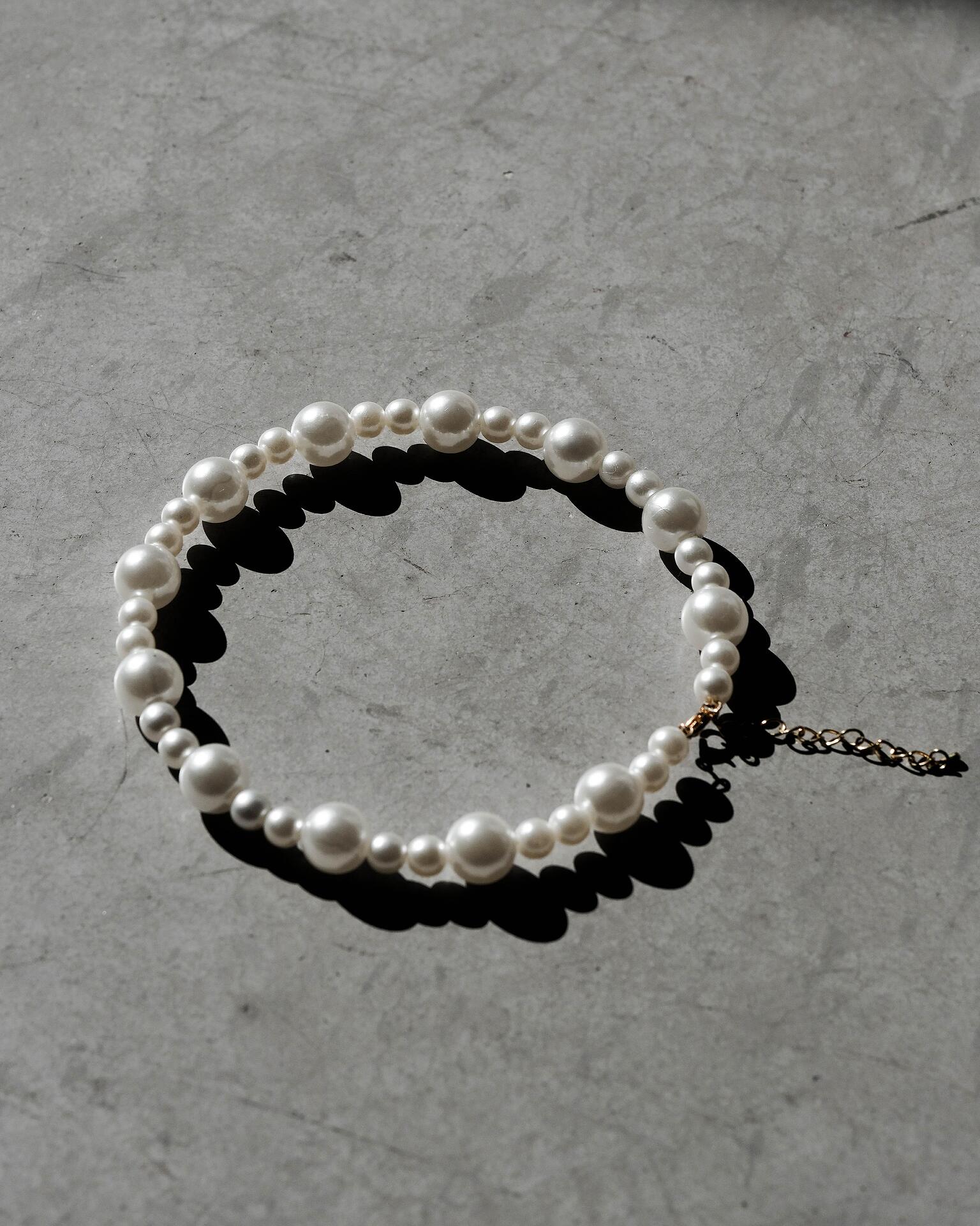 Колие от различни по горемина бели перли, което дъпълва вашата официална или ежедневна визия. С идеална дължина, която обгръща врата, подчертавайки деколтето.
