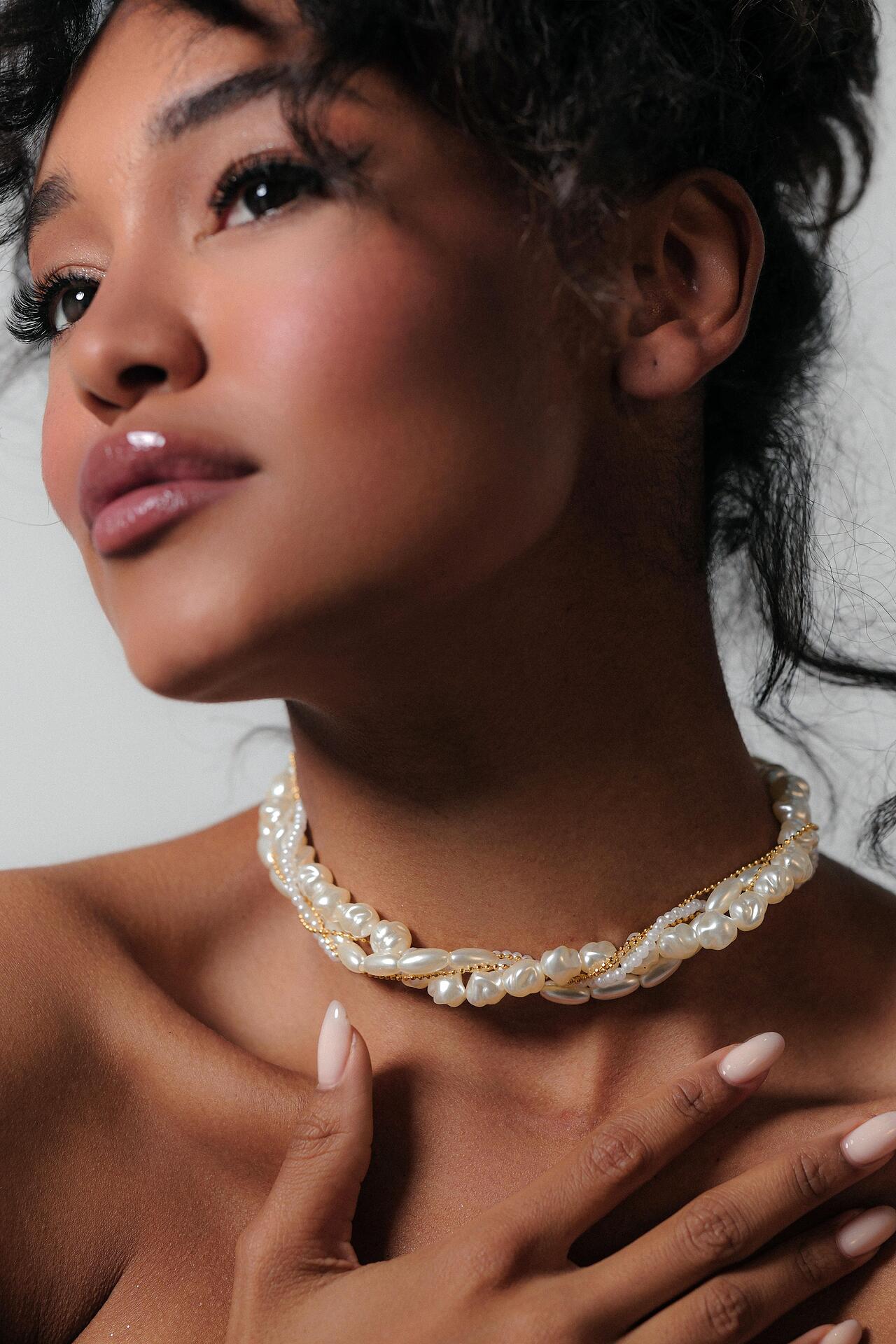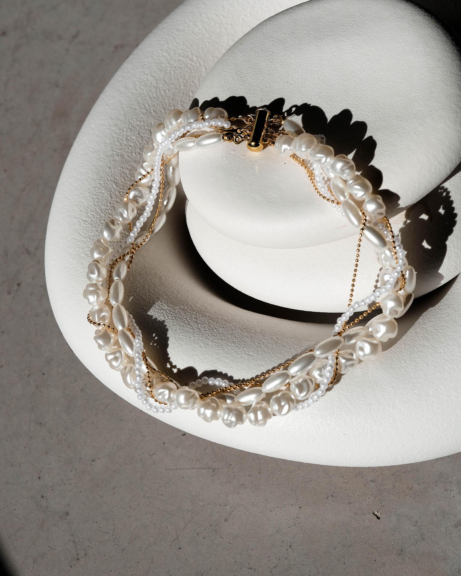 Колие от различни по горемина бели перли и златиста верижка, нежно оплетени едно в друго. С идеална дължина, която обгръща врата, подчертавайки деколтето.