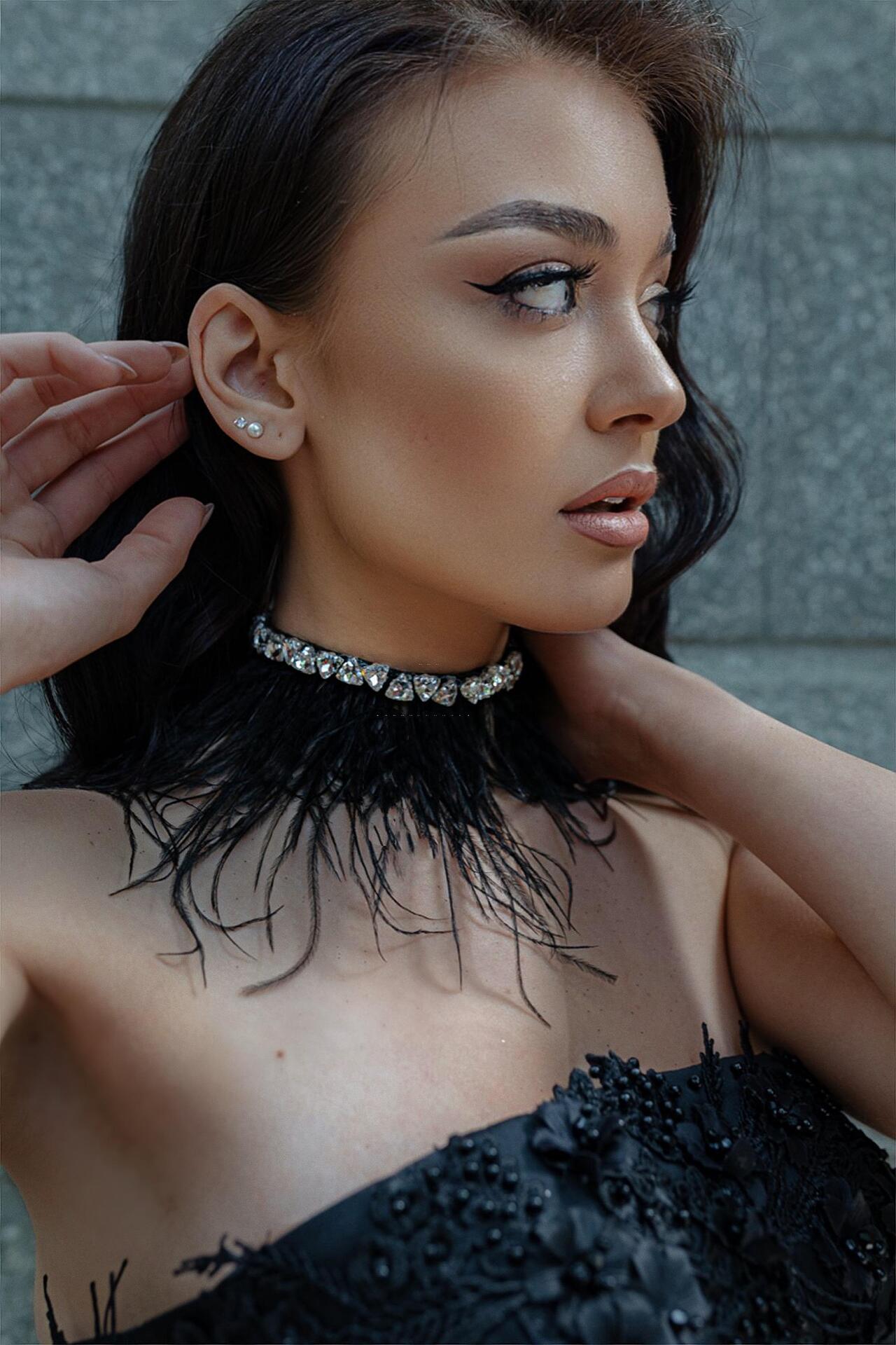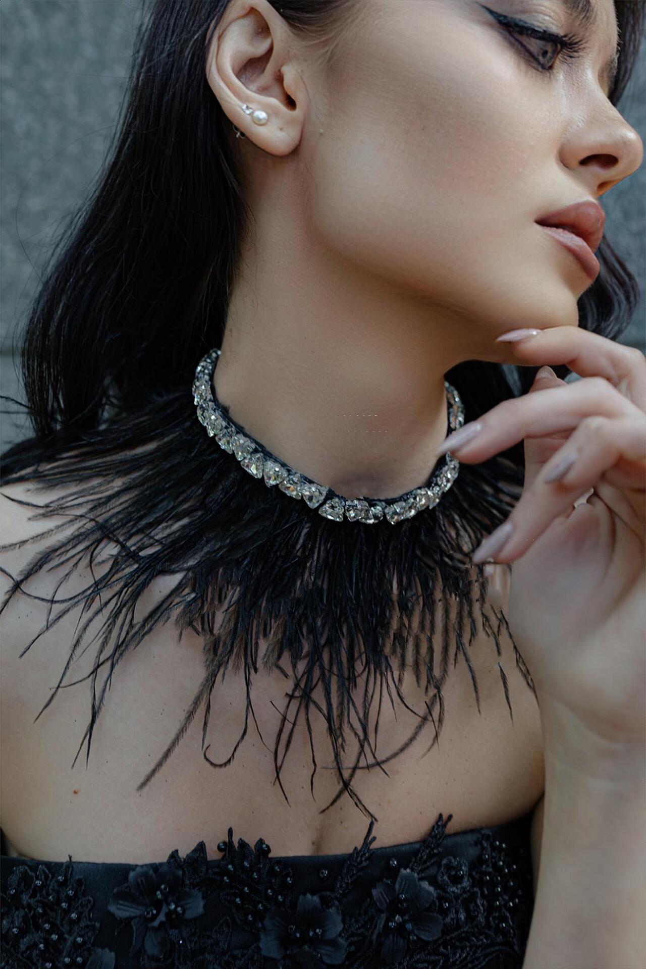 Луксозно колие, което е ръчно нашито изработено с щраусови пера и кристали. Използвани са висококачествени материали. Аксесоарът е подходящ за официални и сценични визии. Закопчаването е с кукички и размера не може да се регулира (трябва да бъде изработен по ваш размер ако не ви стане).
