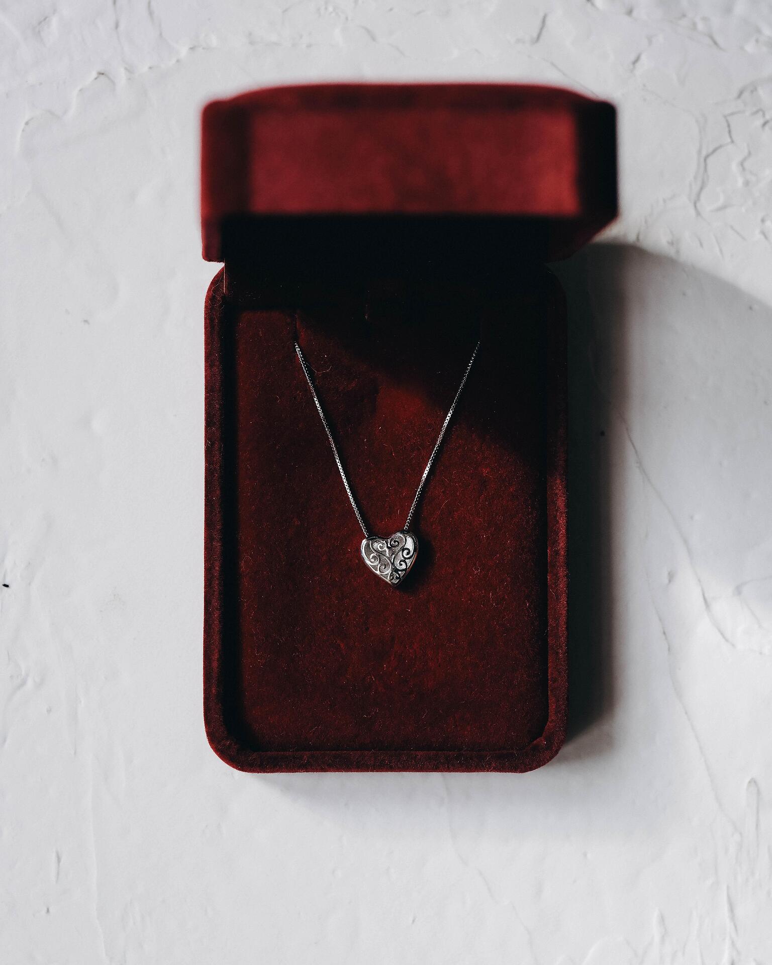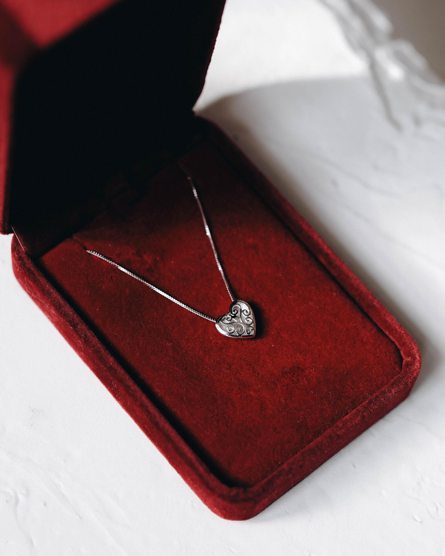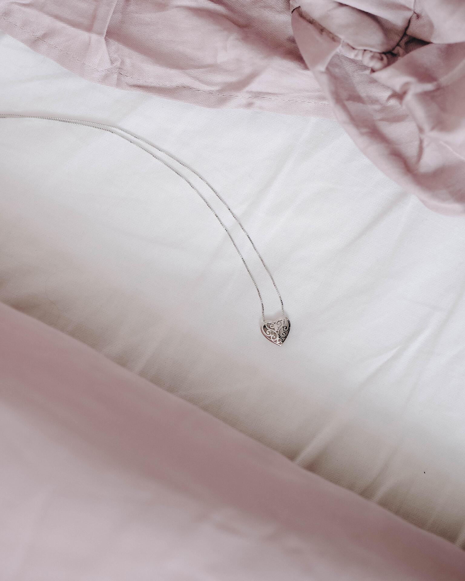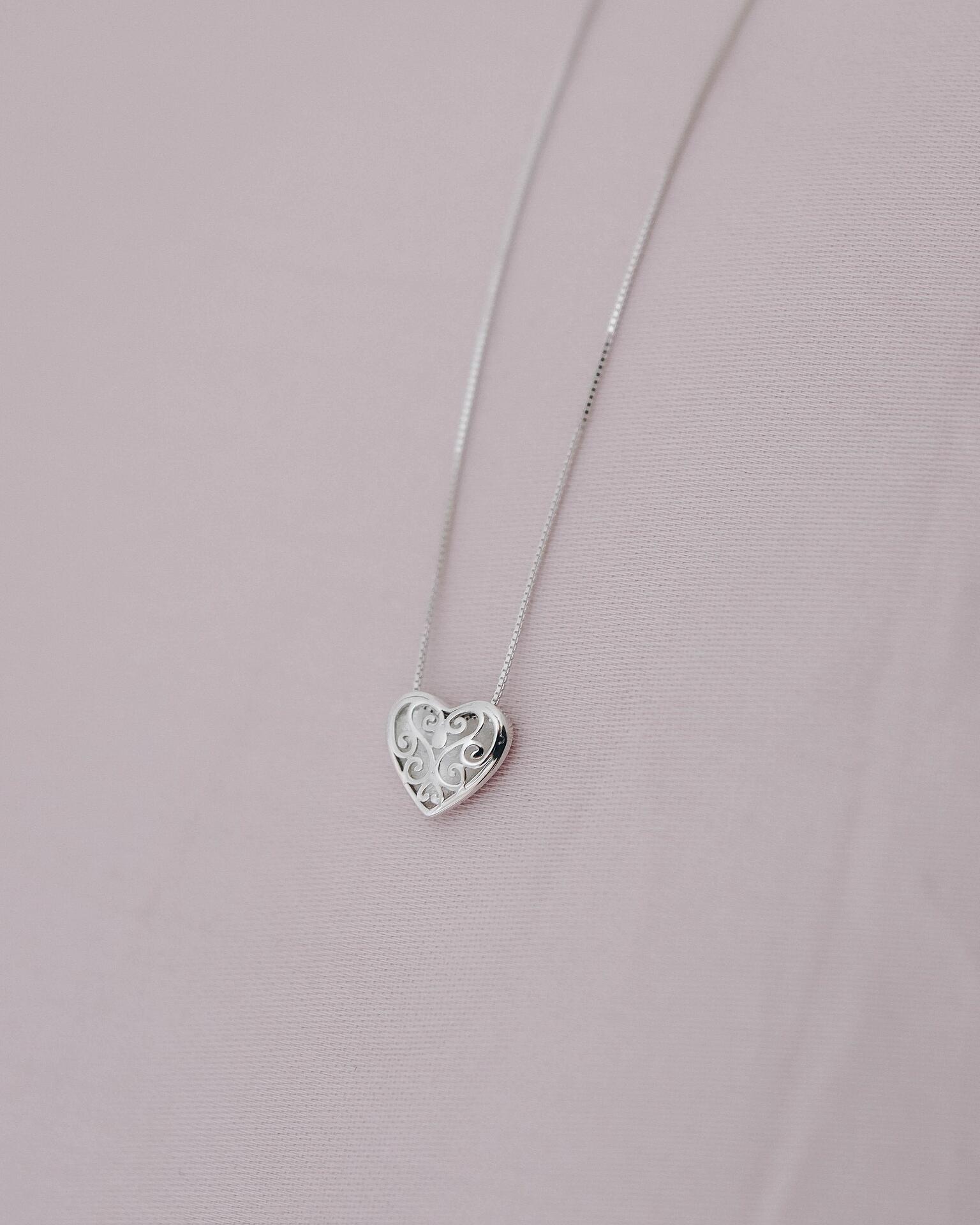Това сребърно колие с висулка във формата на сърце е символ на любов и елегантност. Красивите гравирани орнаменти му придават романтичен и елегантен вид, който подчертава индивидуалността и стила на притежателя му. Подходящо за специални поводи или като символичен подарък с дълбоко значение.
