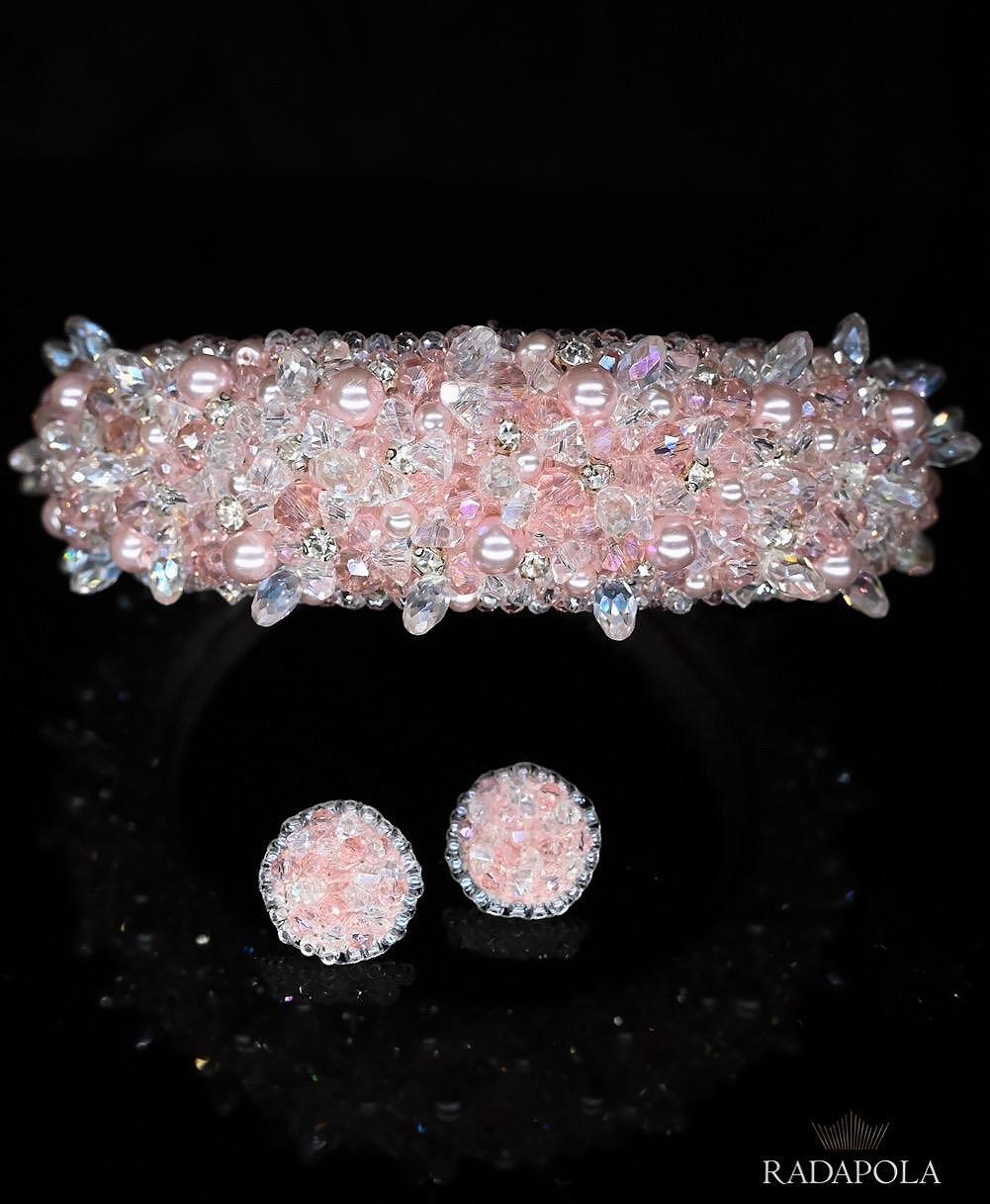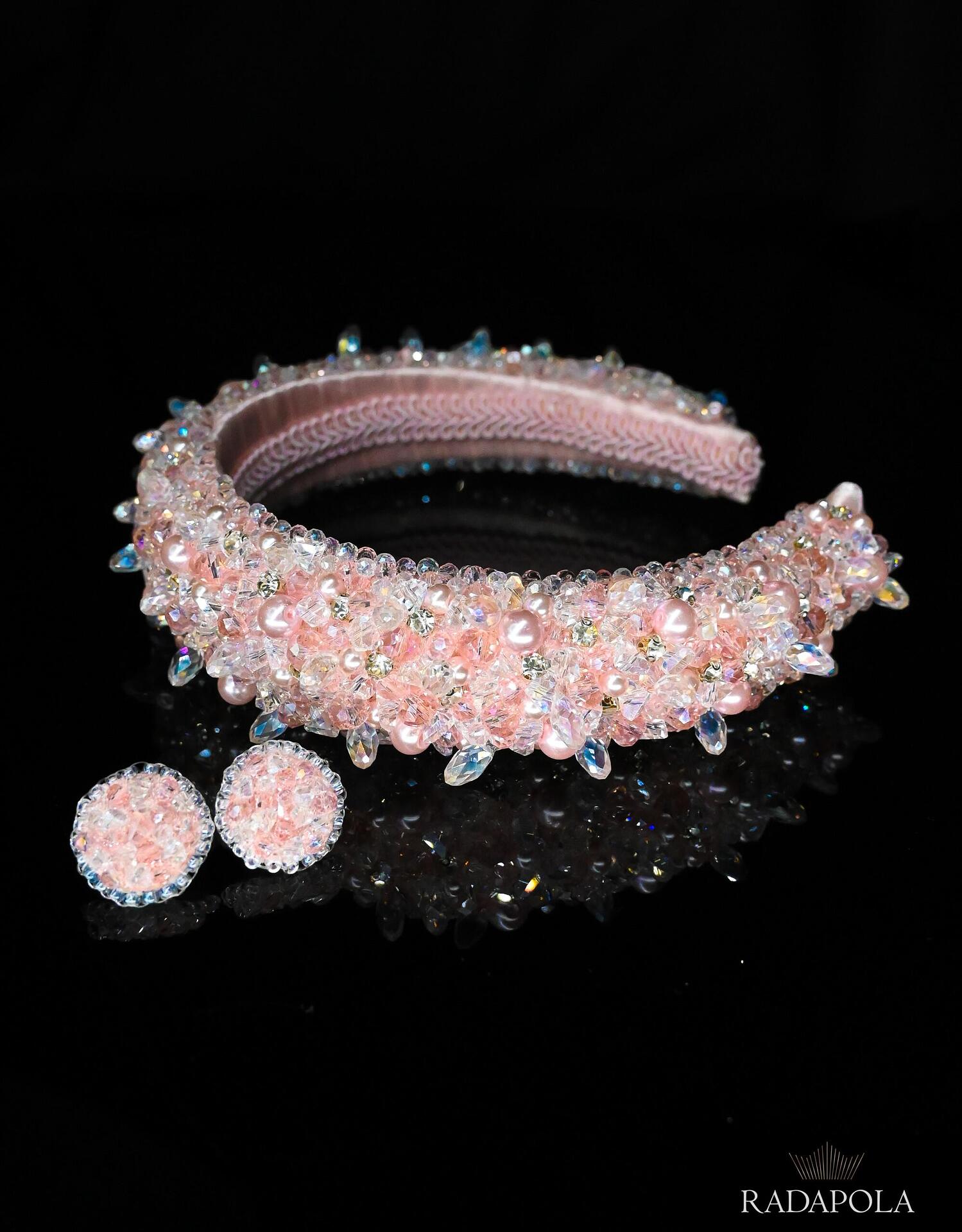 Комплект от нежна диадема и обеци. Ръчно изработени от висококачествени материали. Размерът на диадемата е универсален, за да е удобно за всеки, а обеците се закопчават с винт.