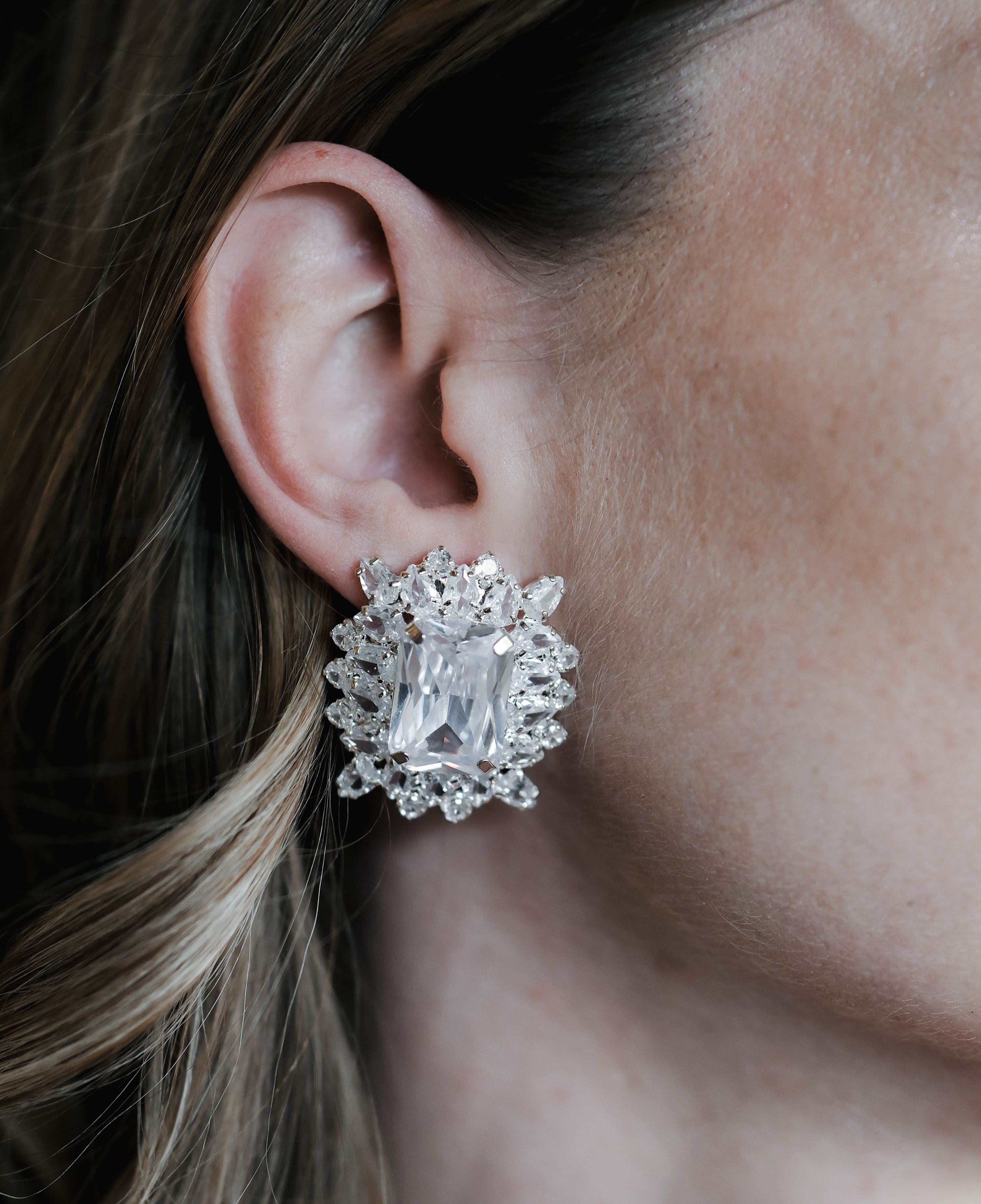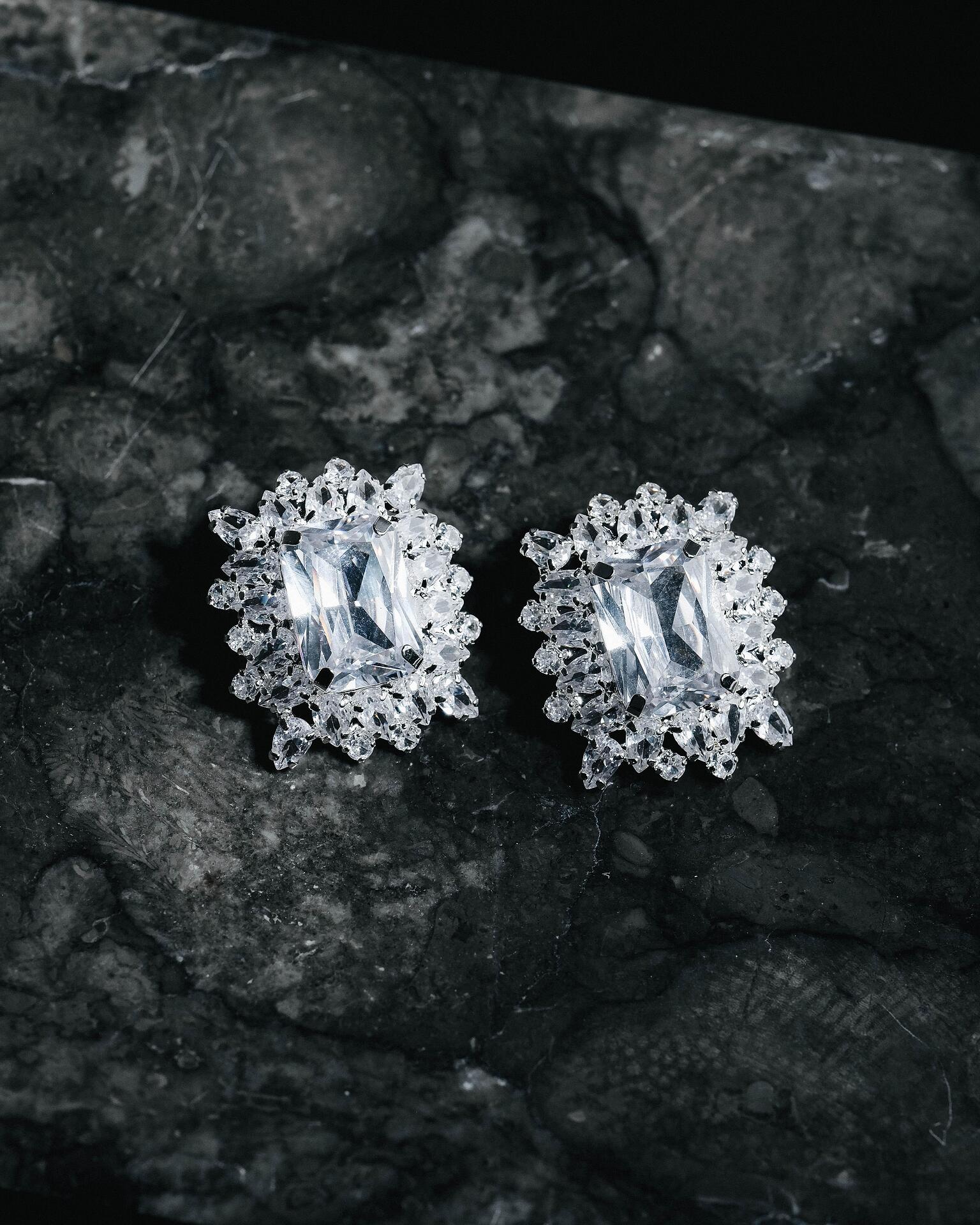 Изключителни обеци с правоъгълни кристали в центъра, заобиколени от множество блестящи камъни, които придават завладяващ блясък и елегантност. Тези обеци са идеални за специални поводи и ще добавят неповторимо изящество към всяка визия.