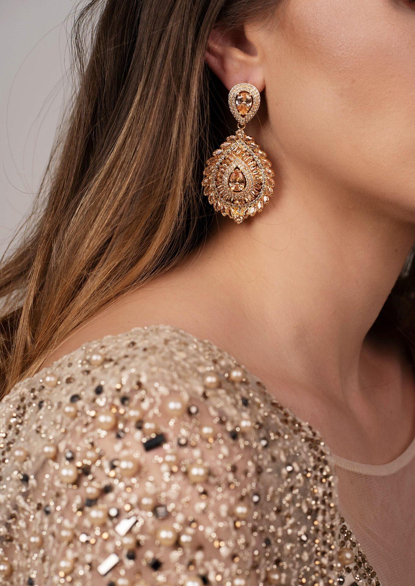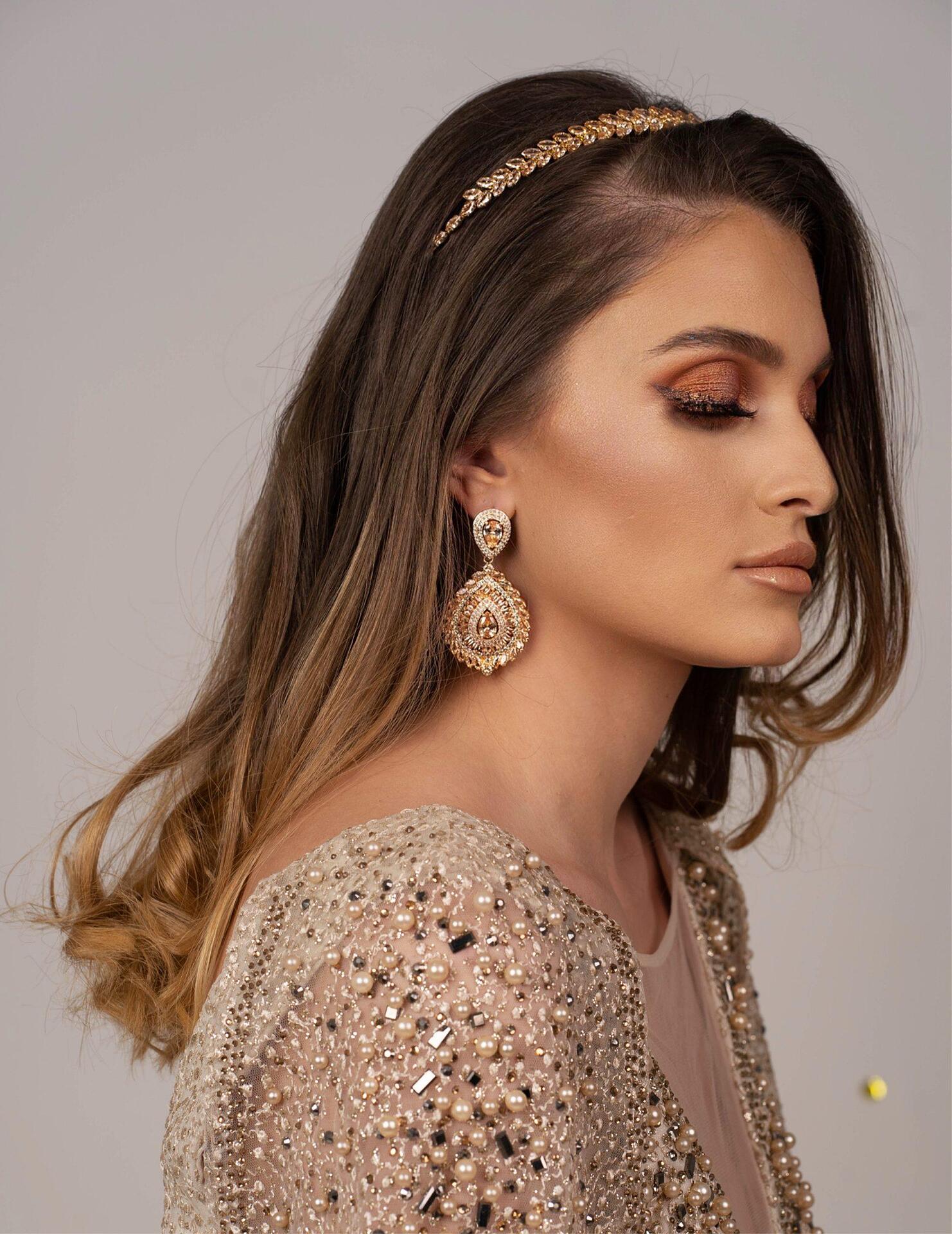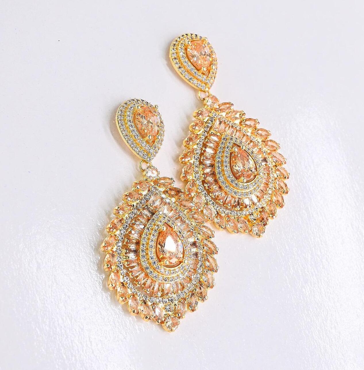Обеци с кристали цирконий и златно покритие. Подходящи за всякакви поводи. Предлагат се и в други цветове. Ръчно изработени от висококачествени материали. Закопчават се с винт. Дължината е около 7 см.
