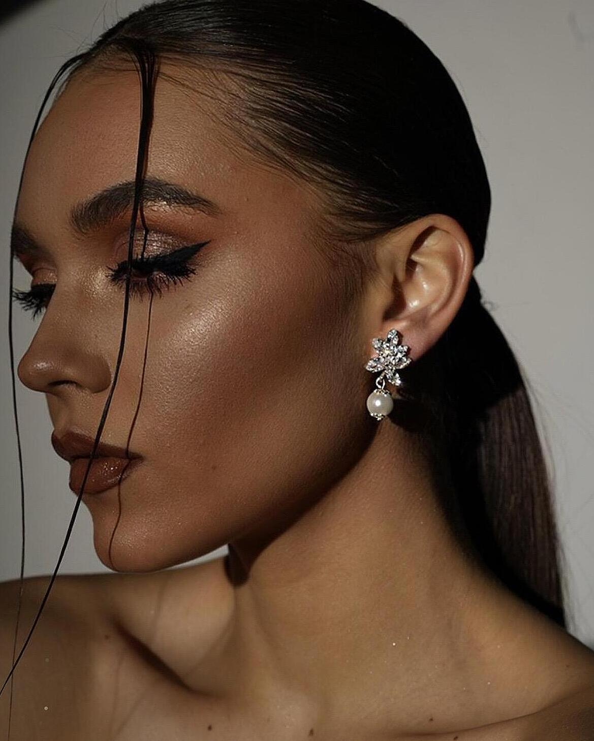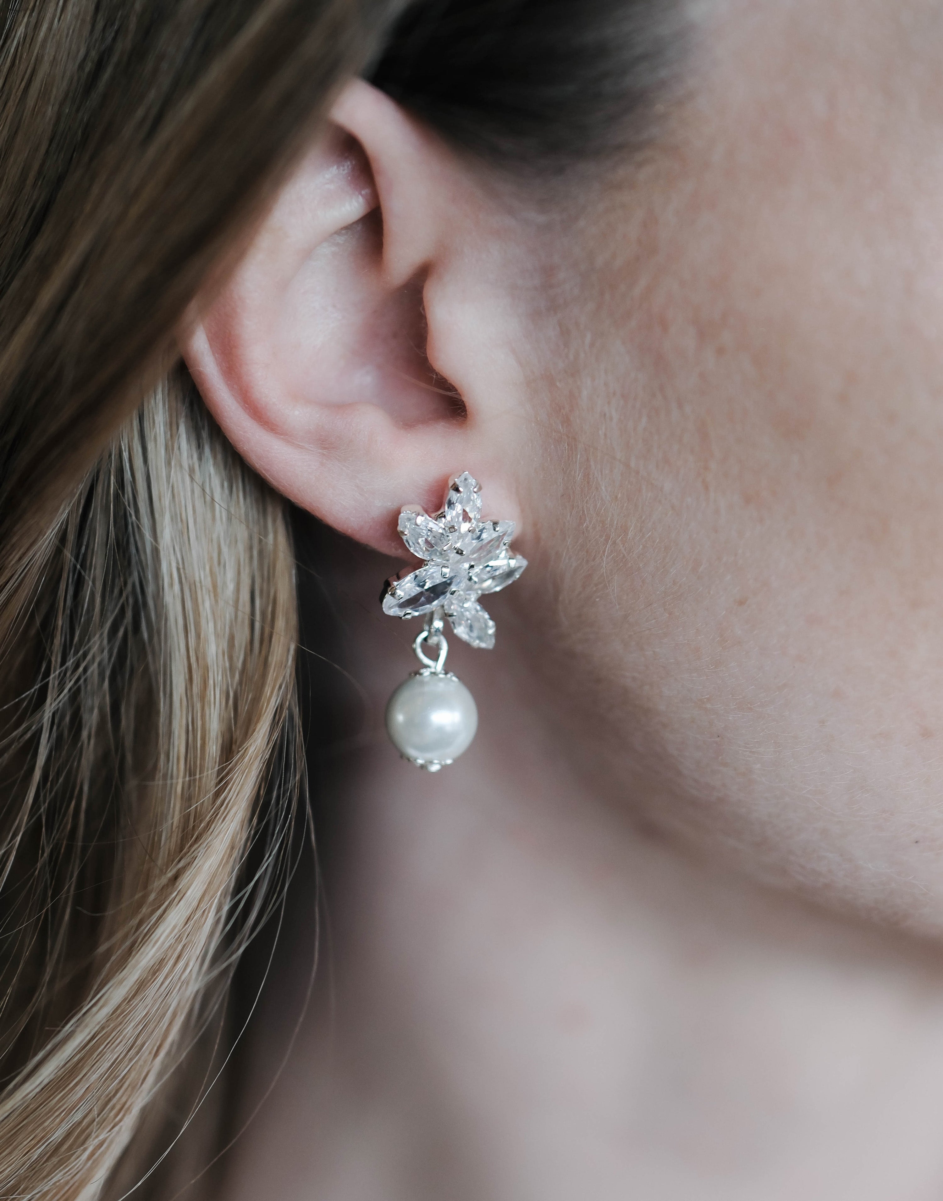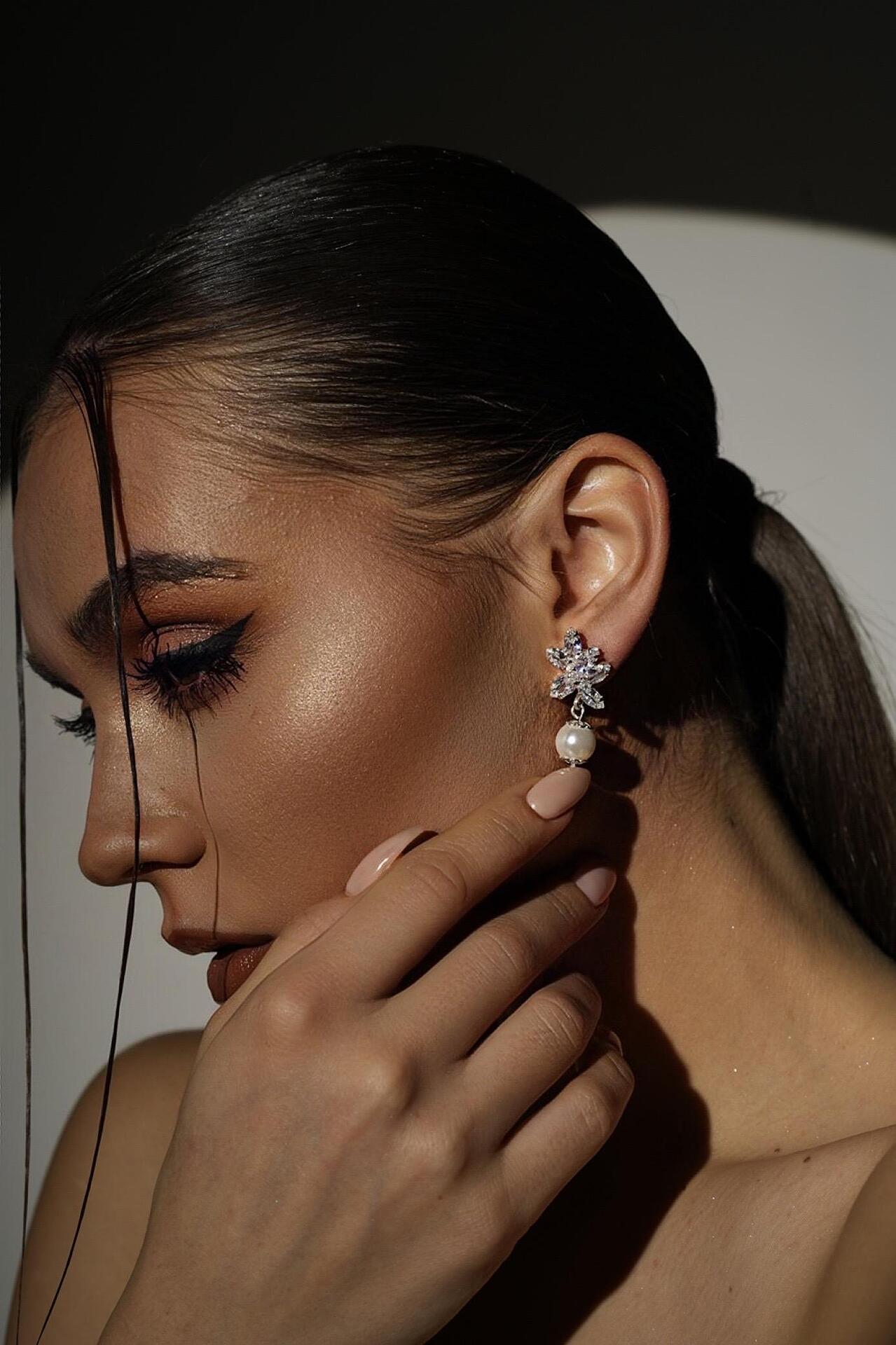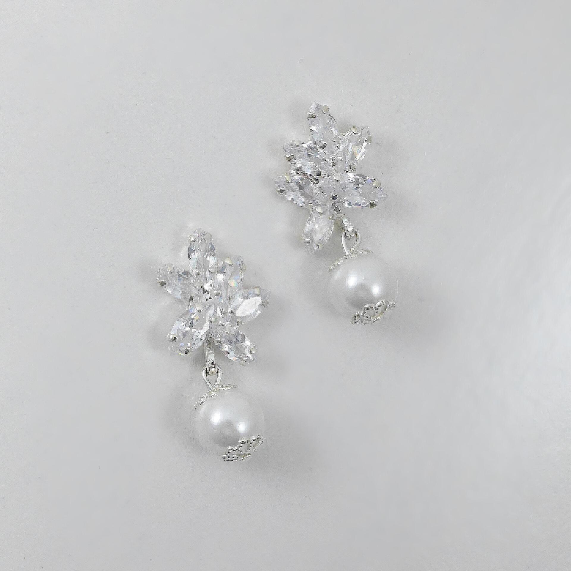 Нежни сребристи обеци с кристали цирконий и перли. Ръчно изработени от висококачествени материали. Подходящи за всякакви поводи. Закопчават се с винт.