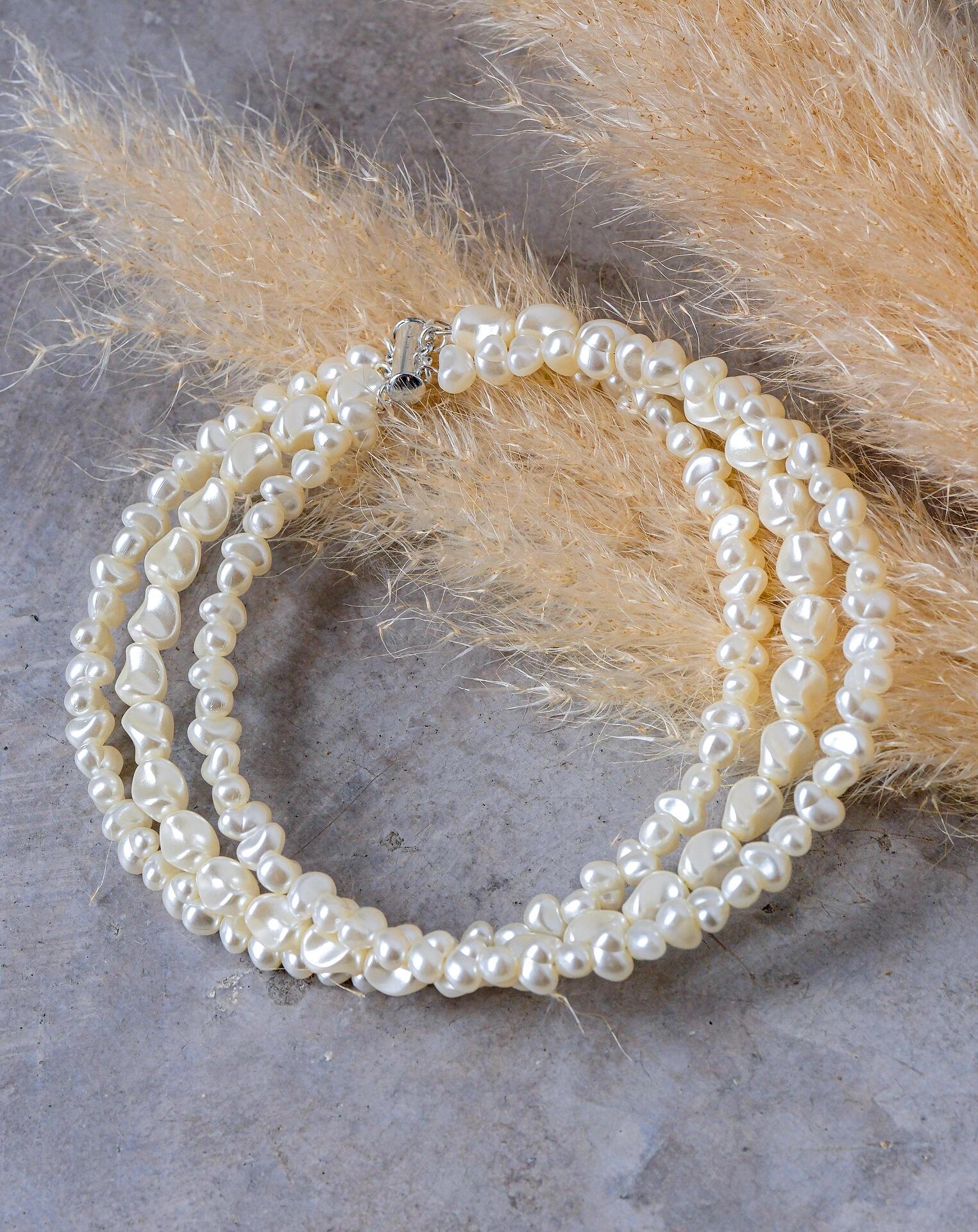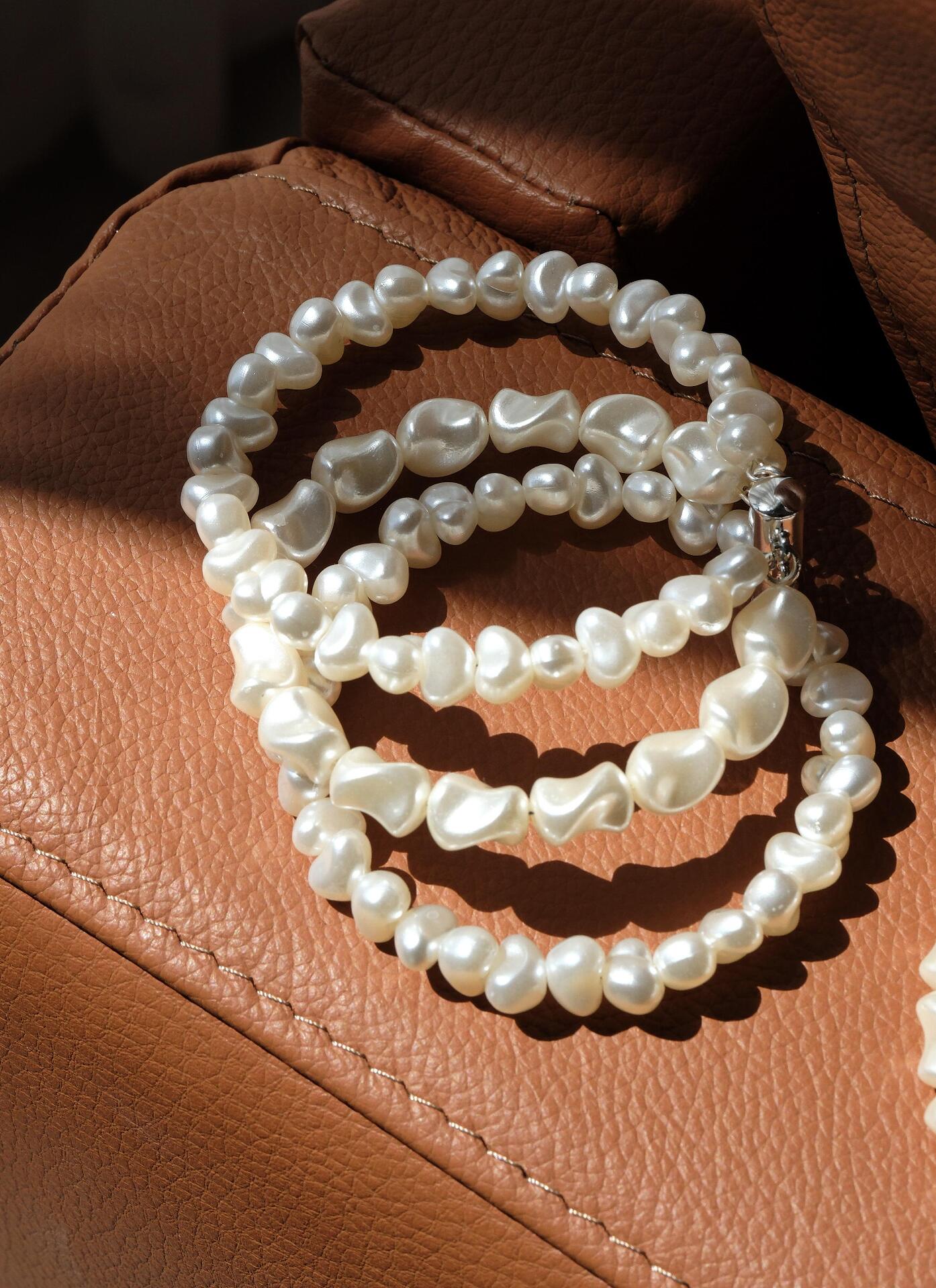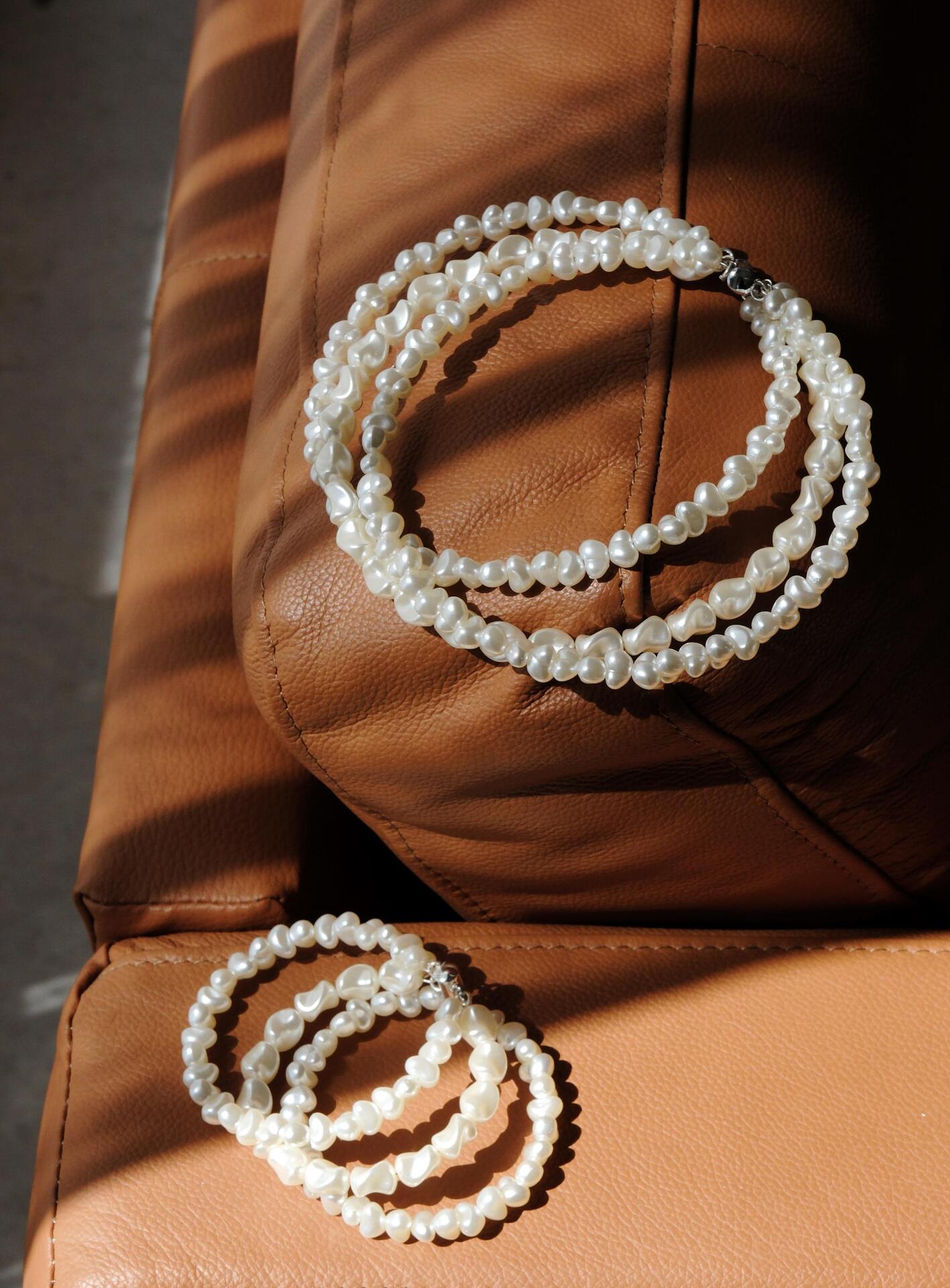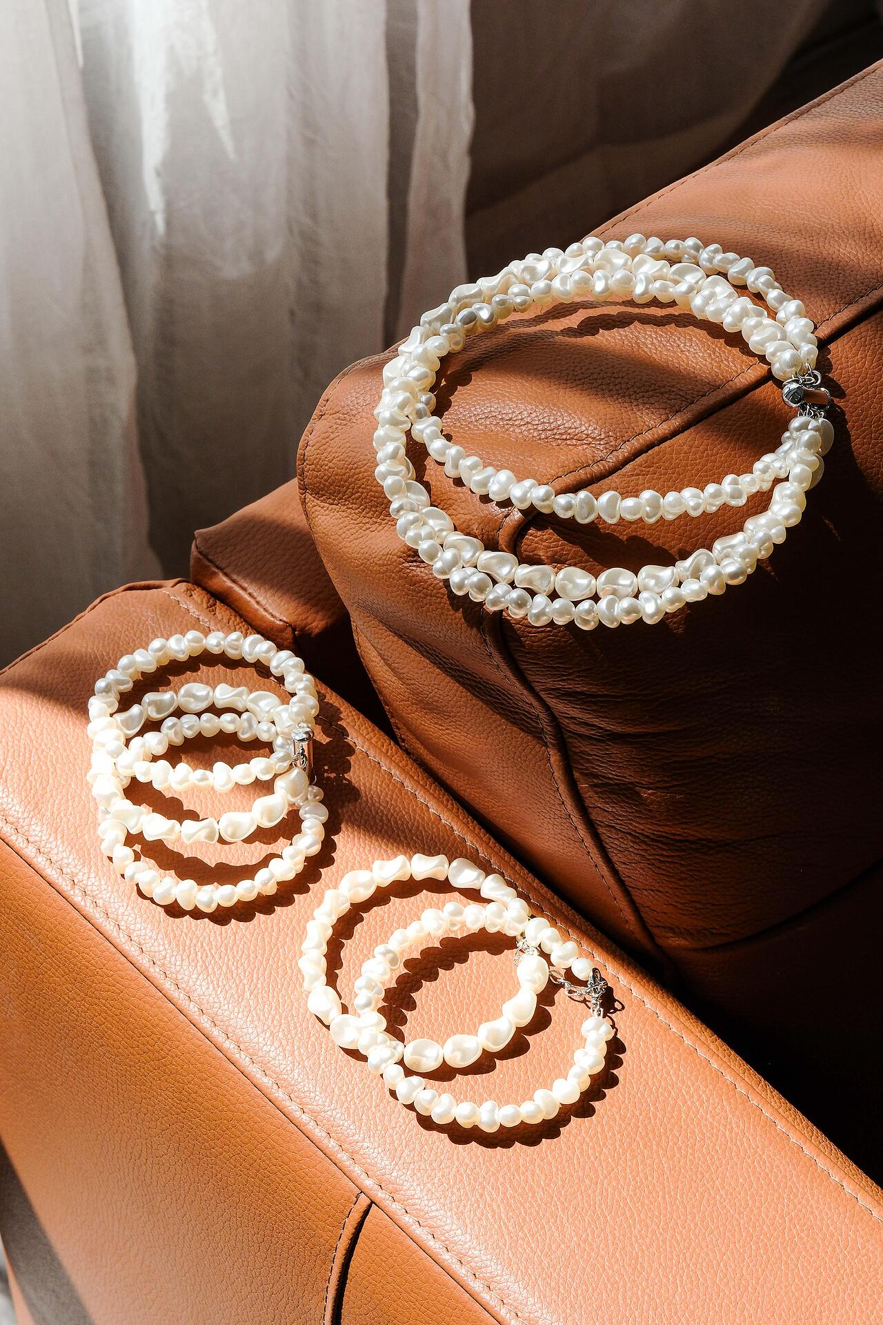 Допълнителна информация: Бижута от ръчно нанизани бели малки перли. Закопчават се с магнитна закопчалка. Предлагат се в различни размери.