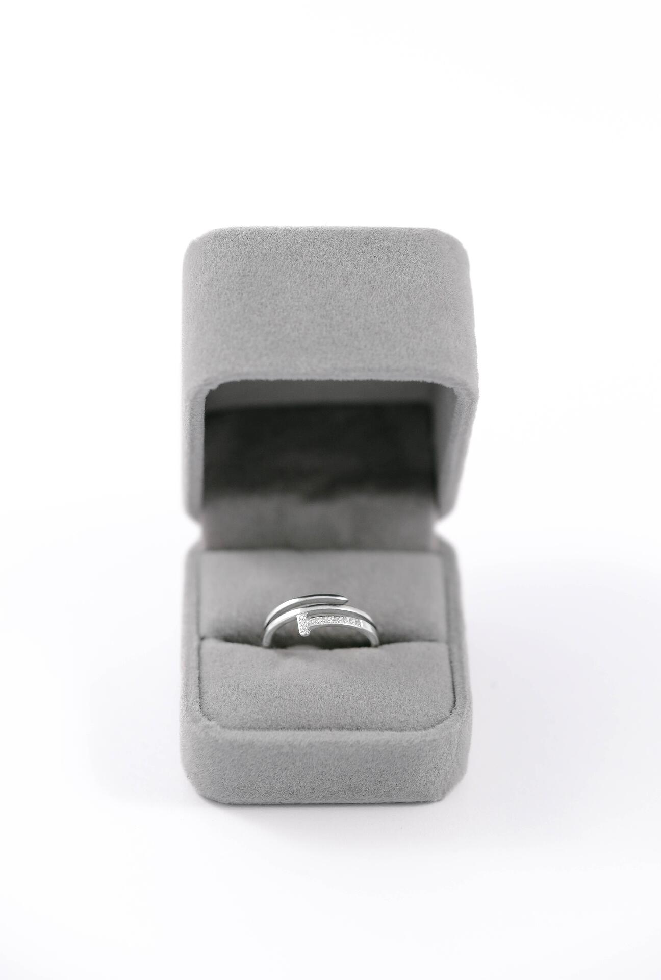 Сребрист пръстен, който започва формата си с наподобяваща буква Т, продължението на която се усуква около пръста в невероятен ефект. Има камъни в началото на спиралата. Изработен от стомана. Не потъмнява. Идеален за всякакви поводи.