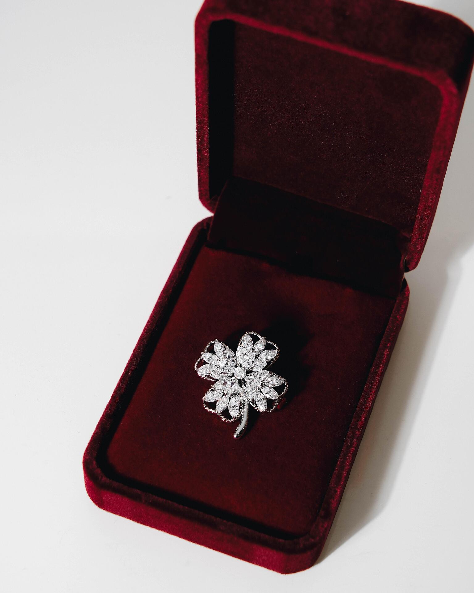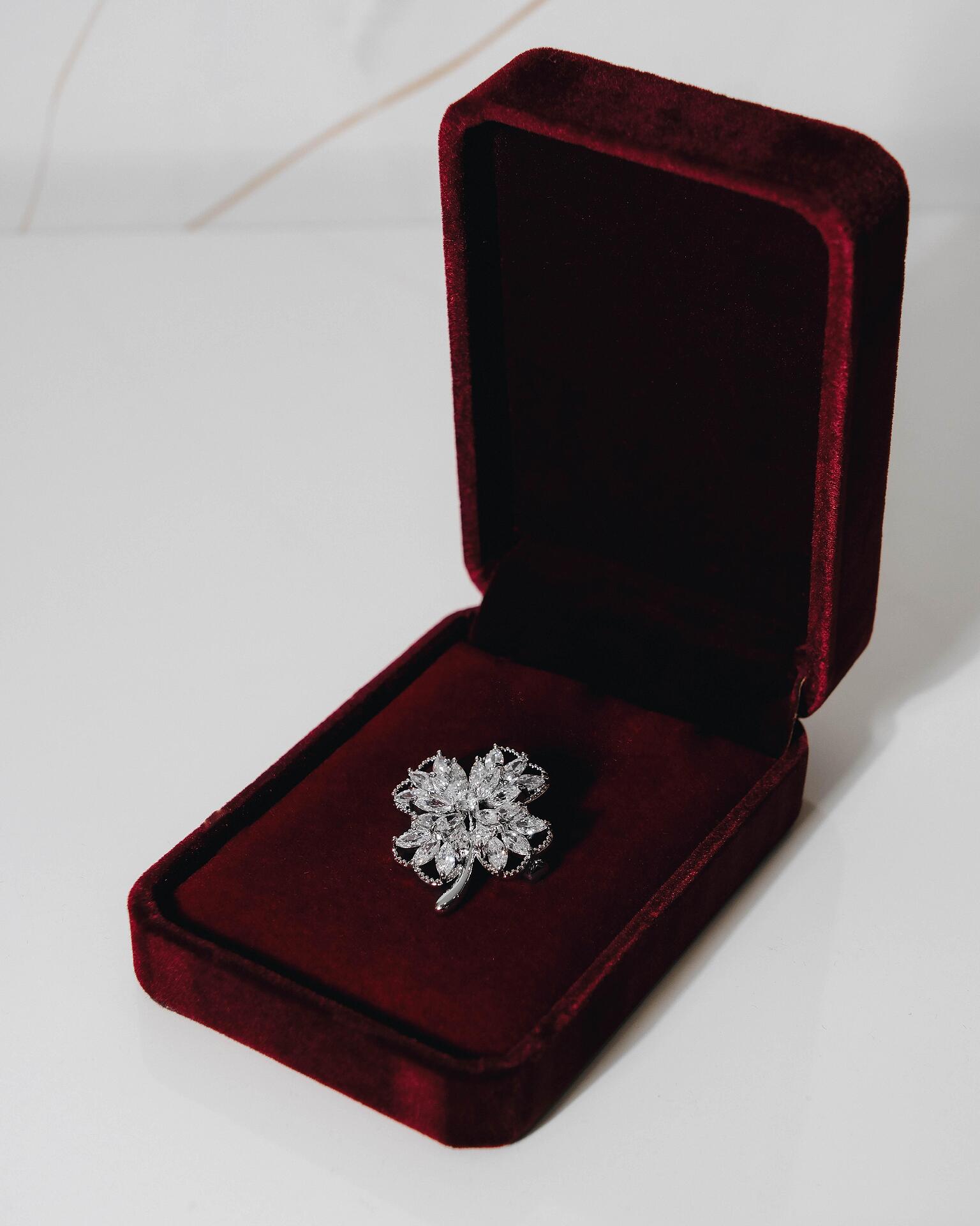 Сребриста брошка във формата на четирилистна детелина с прозрачни камъни Цирконий. Закопчаването е с безопасна игла.